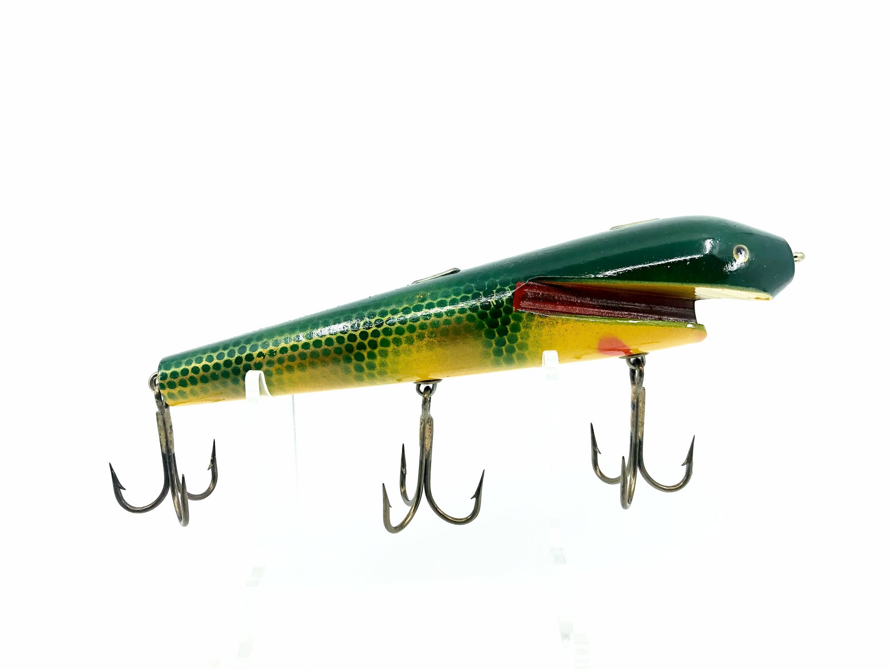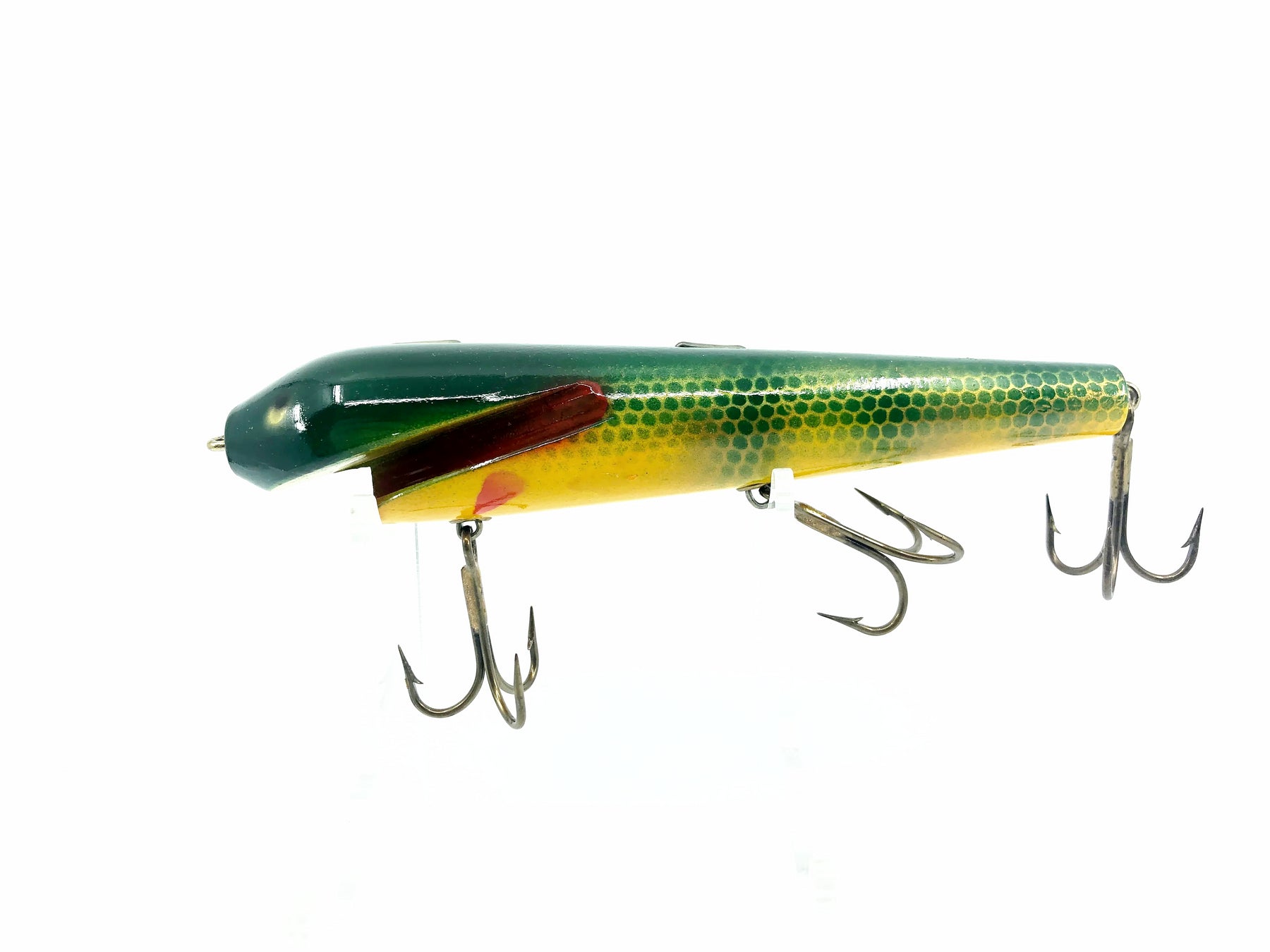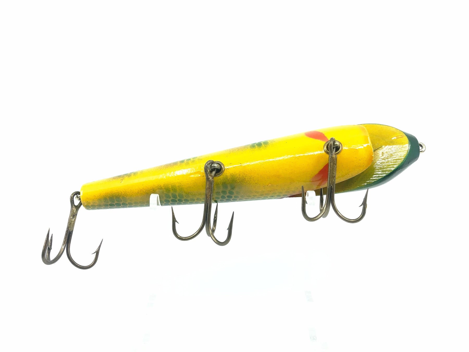 Fudally's Reef Hawg, Perch Color. Quality wooden musky bait! Lure is about 6 1/4" long. This bait is used but appears to have never been fished before and is in overall great condition. See photos.