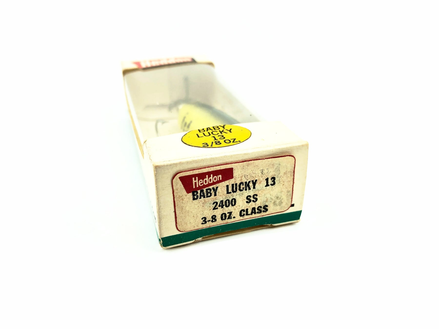 Heddon Baby Lucky 13, BF Bullfrog Color w/Box. Box is for a Baby Lucky 13 in SS color. About 2 3/4" long. Lure is in great condition, and the box is in great condition. Plastic/spook version. One of the true classic Heddon baits.  Fish or collect.  See photos.