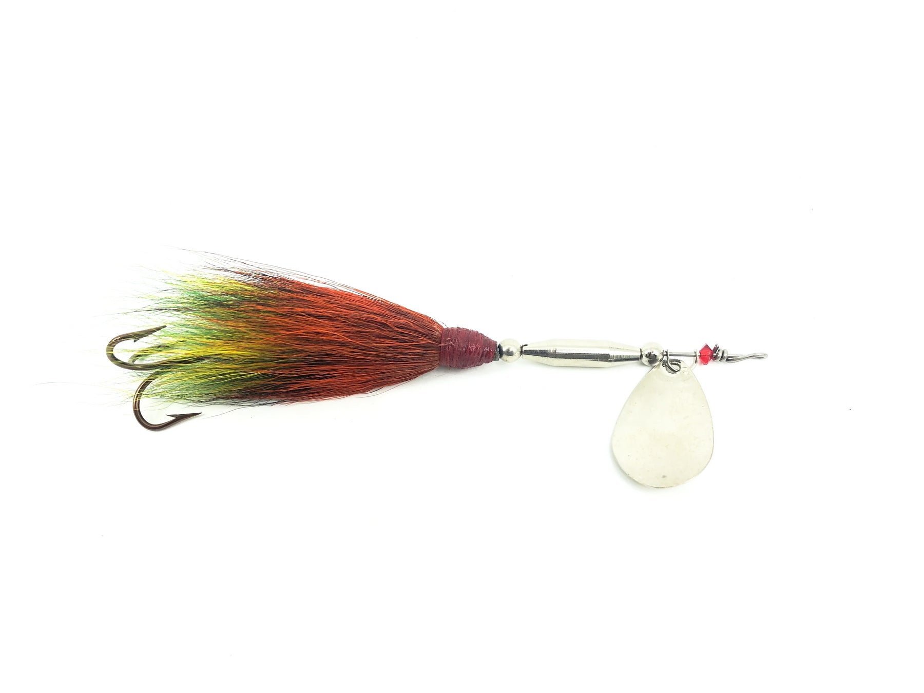 Pike Bucktail Spinner, Silver Blade/Perch Tail Color. Great spinner here from an unknown maker. Lure is about 6 1/2" long from hook to body and weighs about 0.8oz. Lure is used but is in good condition. Fish this deal!
