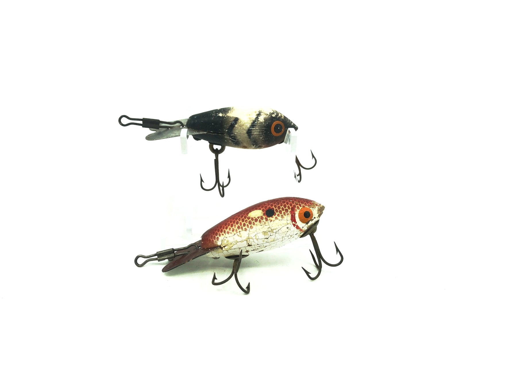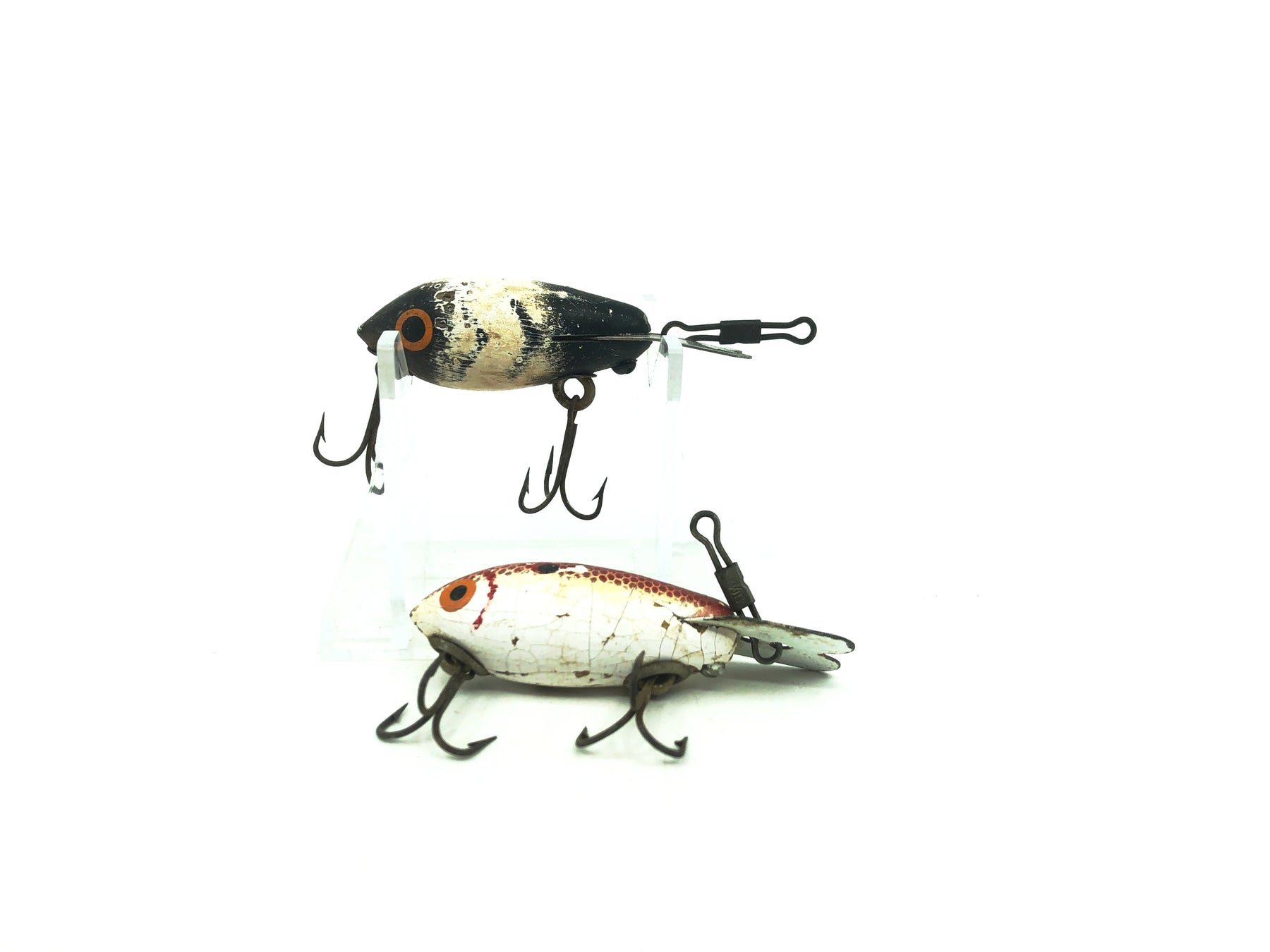 Wooden Bomber 200/300 Series Combo, #06 White Black Ribs/#18 Brown Shad Color. Ranging from 2 1/2" long to 2 3/4" long these Bombers are in rough condition with wear as shown. Both lures also have some missing paint. Classic lure that isn't made anymore fish or collect. See photos. Fix these guys up and take back out fishing or display as vintage warrior baits. Priced to move.