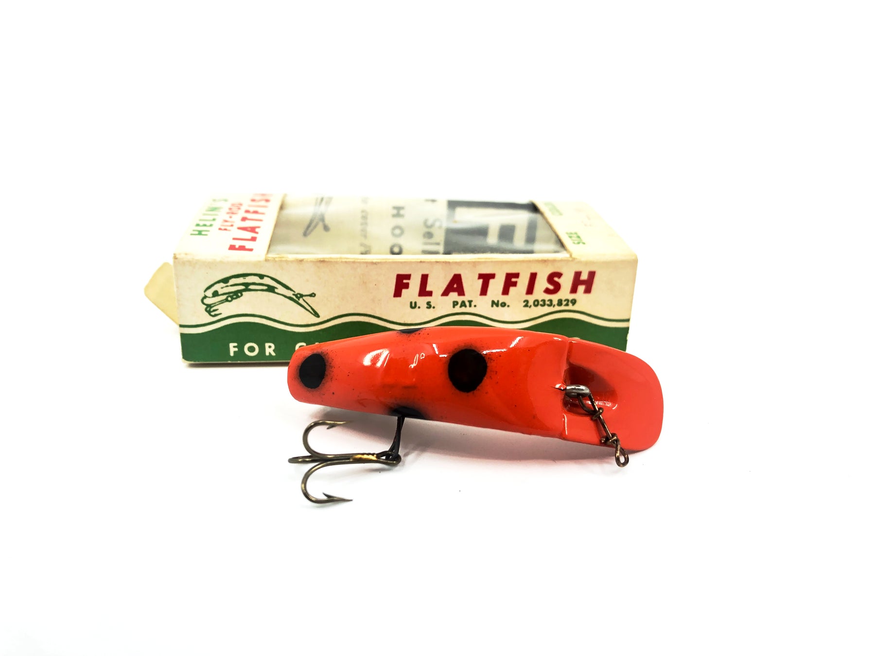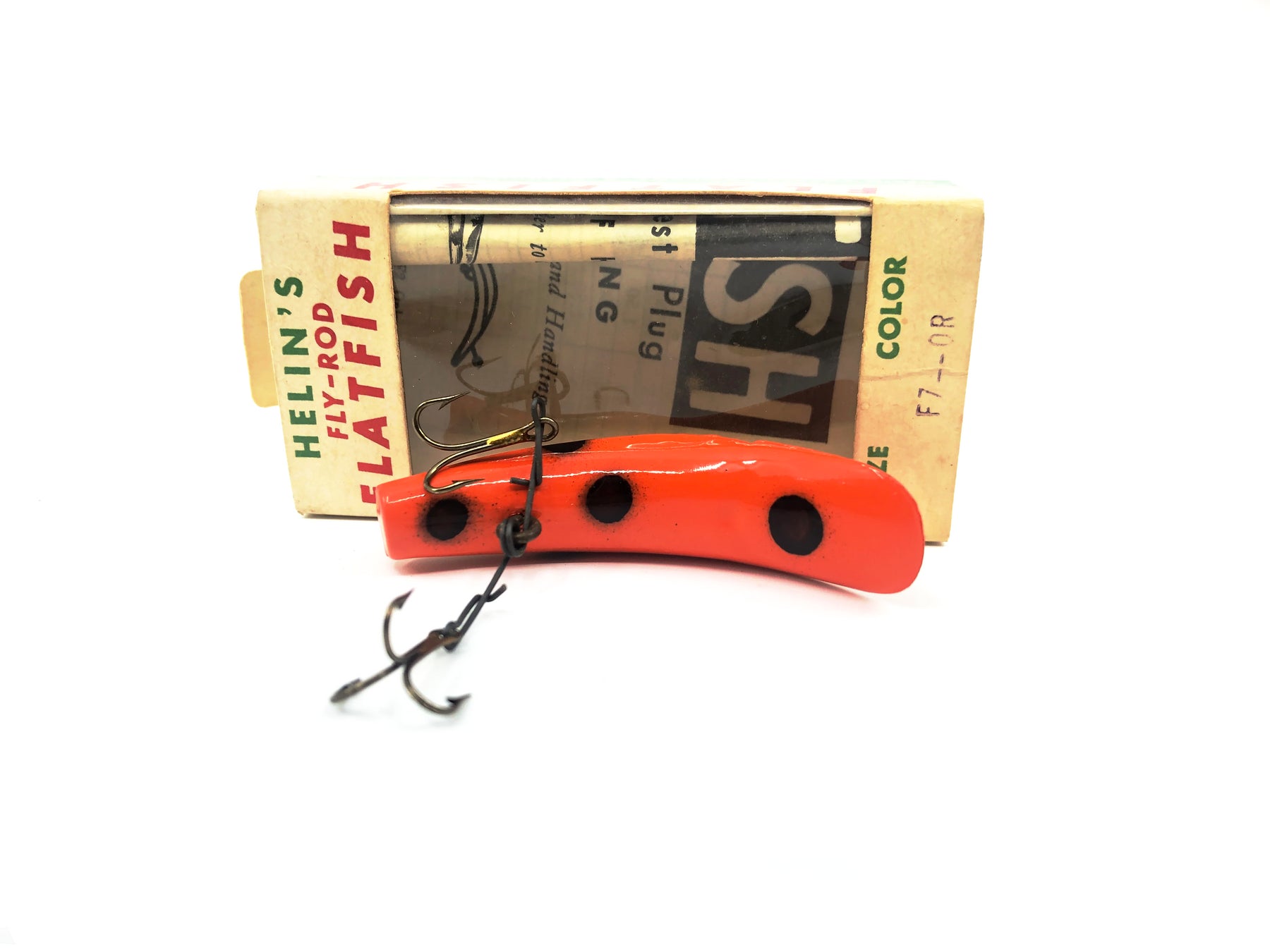 Vintage Helin Flatfish F7, OR Orange Color with Box. Lure is about 2 1/4" long. Lure has some minor wear and marks from storage. Matching box has some wear but is in overall good condition. See photos.