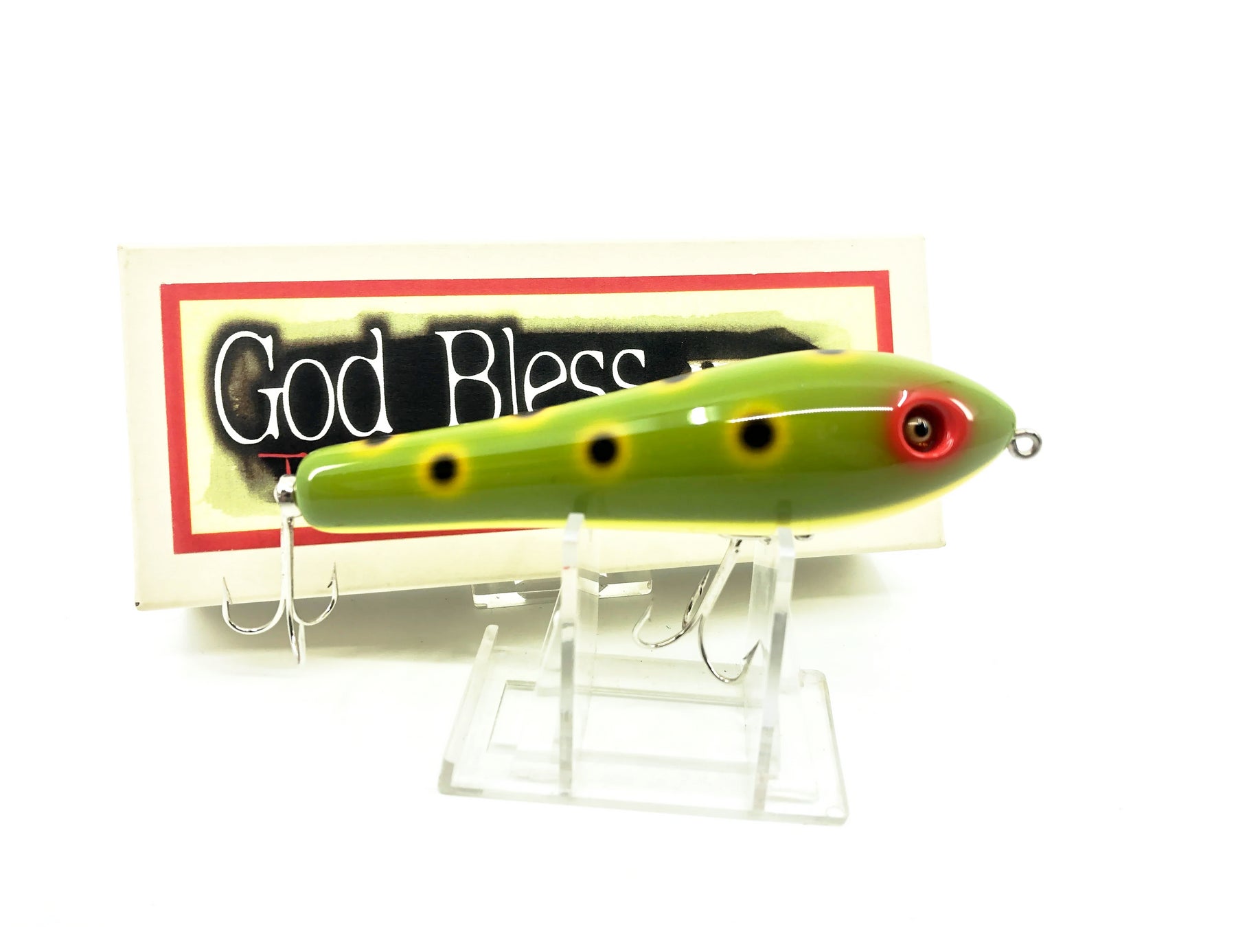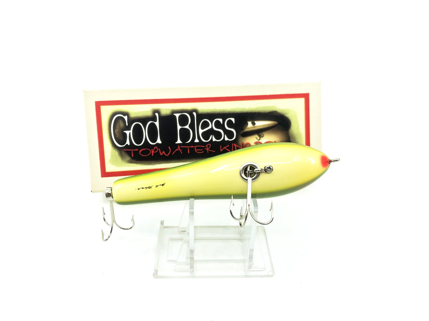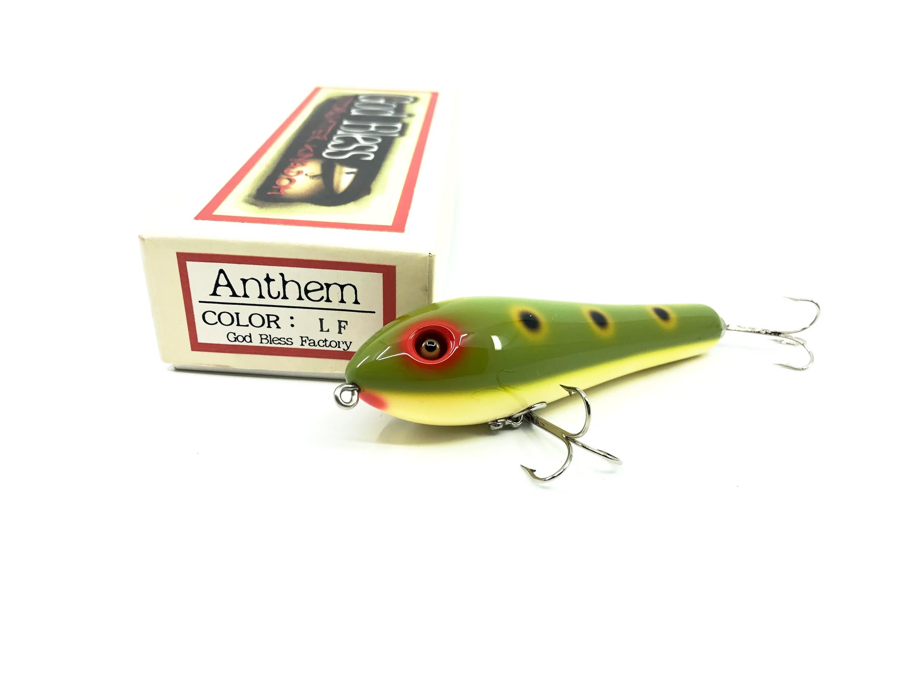 God Bless Factory Topwater Kingdom Anthem Lure, LF Light Frog Color with Box. Unique Japanese lure here. Lure is about 4 1/2" long. Lure is new in box and the box is in great condition as well. Fish or collect, see photos.