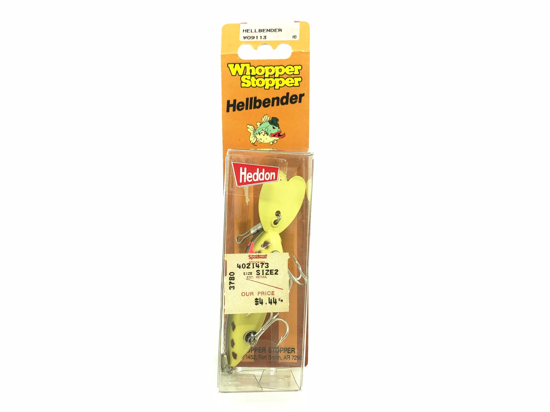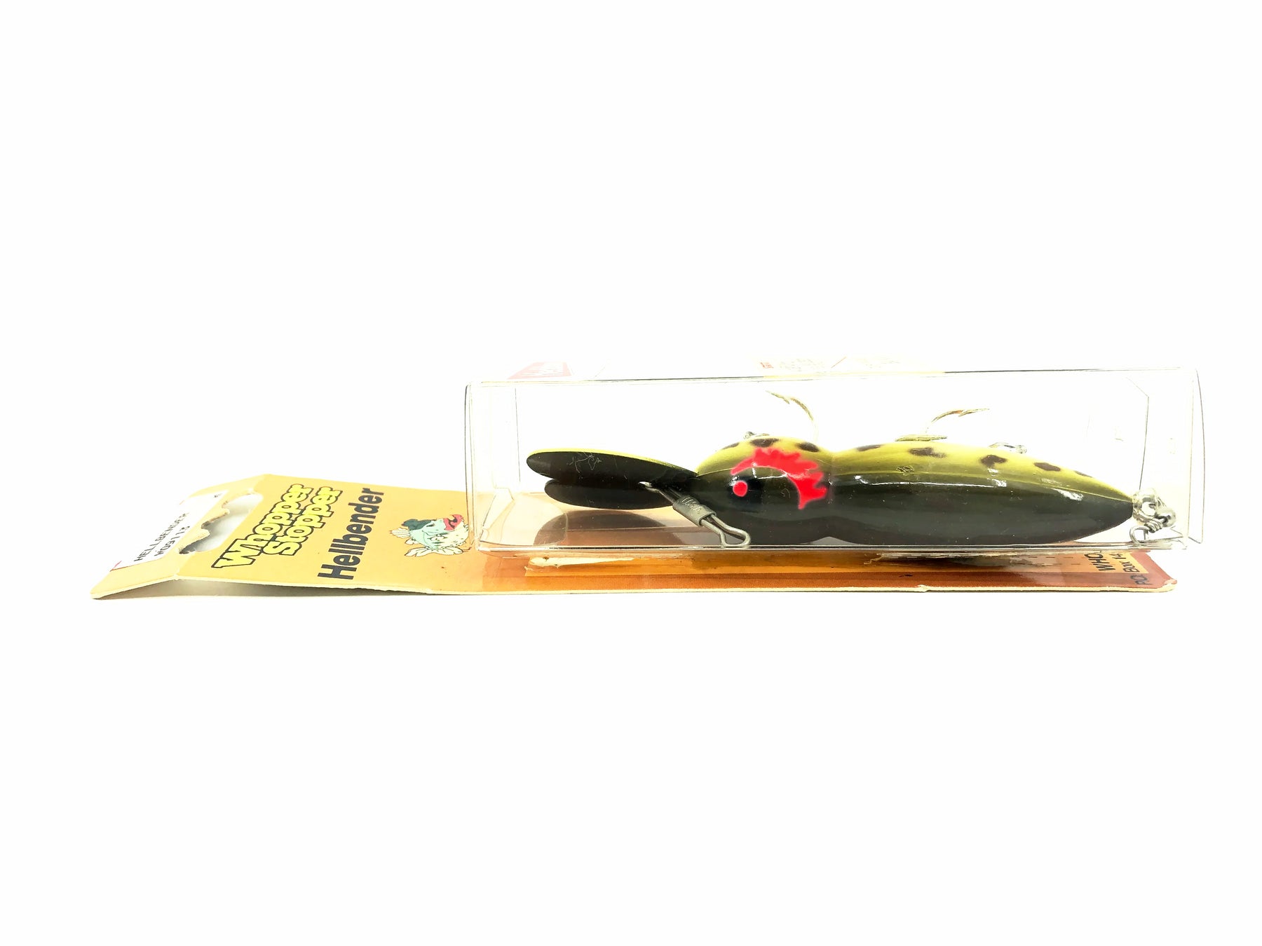 Hellbender Whopper Stopper, Frog Spot Color with Card. Old stock from 1987. About 4 1/4" long including lip. Card is in good condition with some minor wear and the bubble is loose, lure new inside. see photos. Great classic lure here great for your collection or tackle box! See Photos.