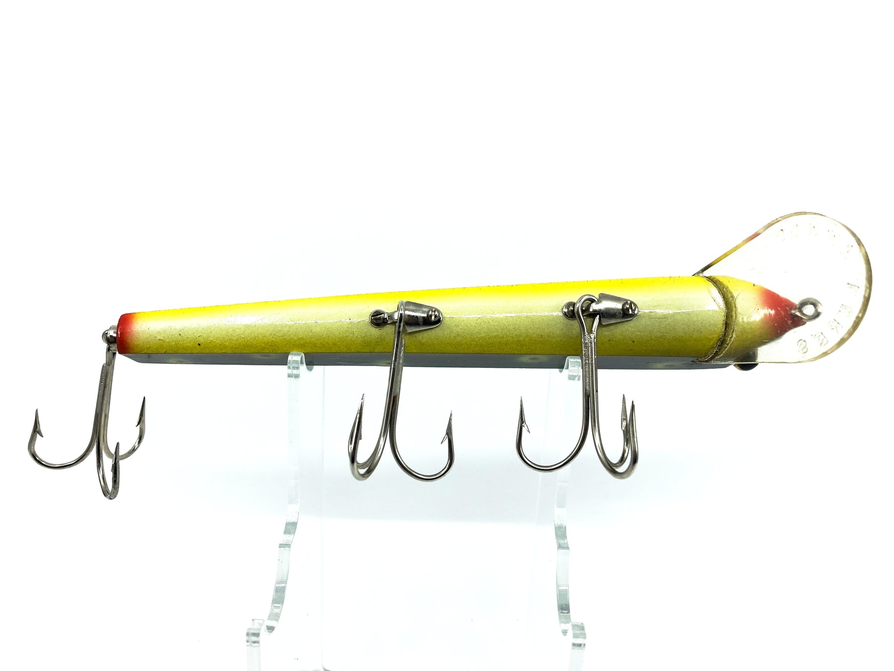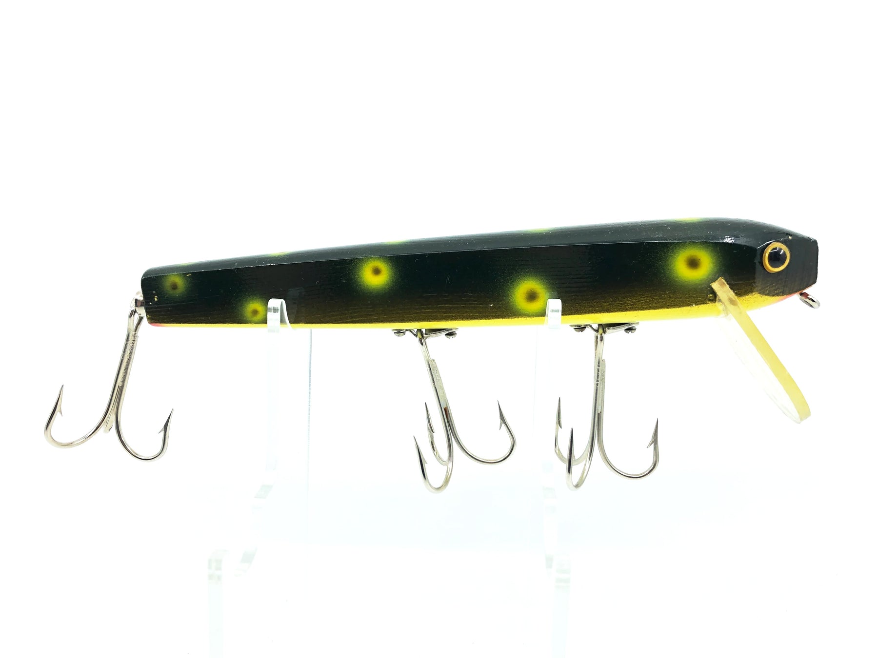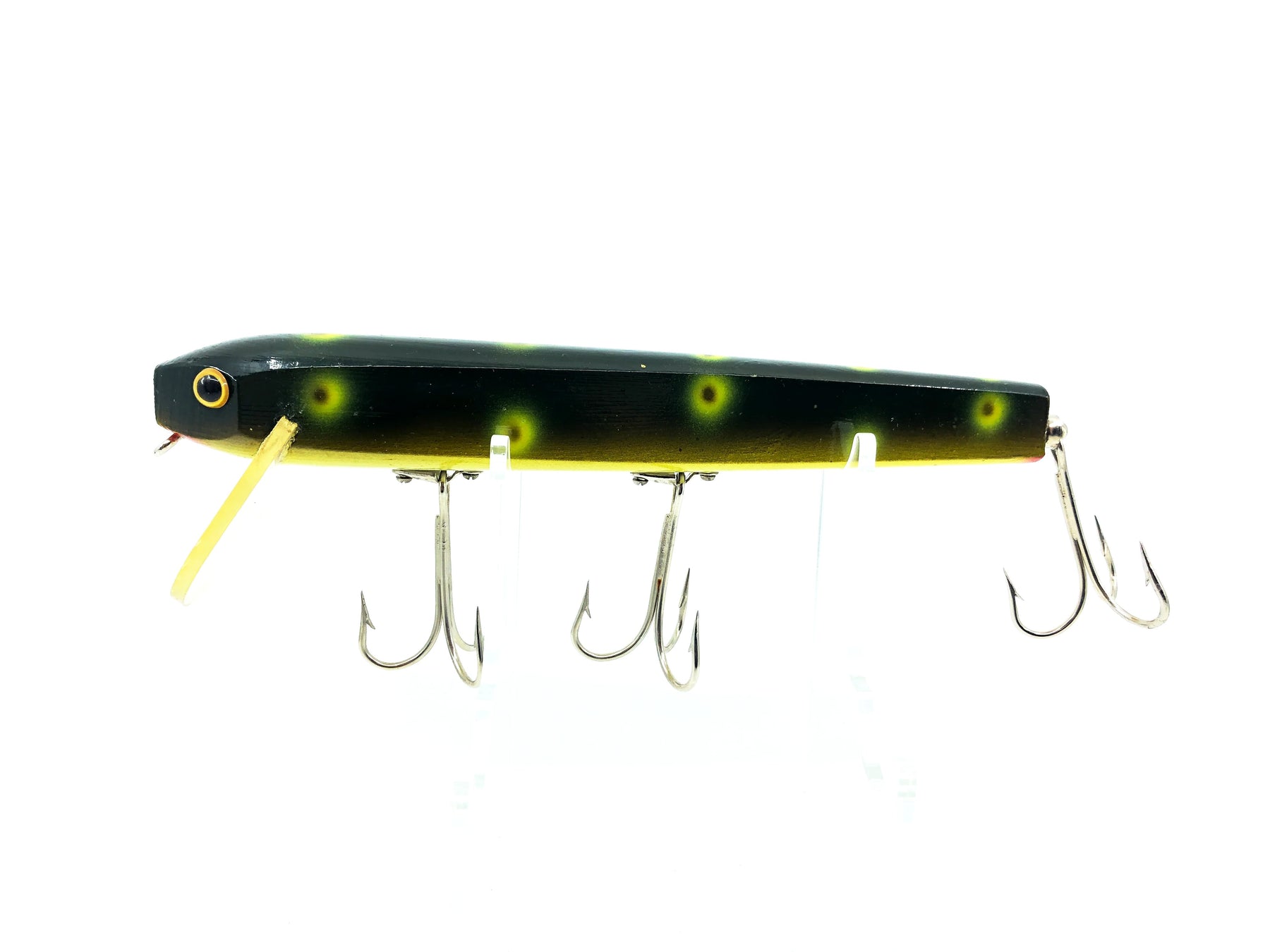 Jimmy Lure's 7" Musky Bait, Bullfrog Color. Great lure here about 7 1/4" long. This lure is in new like condition. Older wooden lure here that you can't get anymore. Fish or collect, see photos.