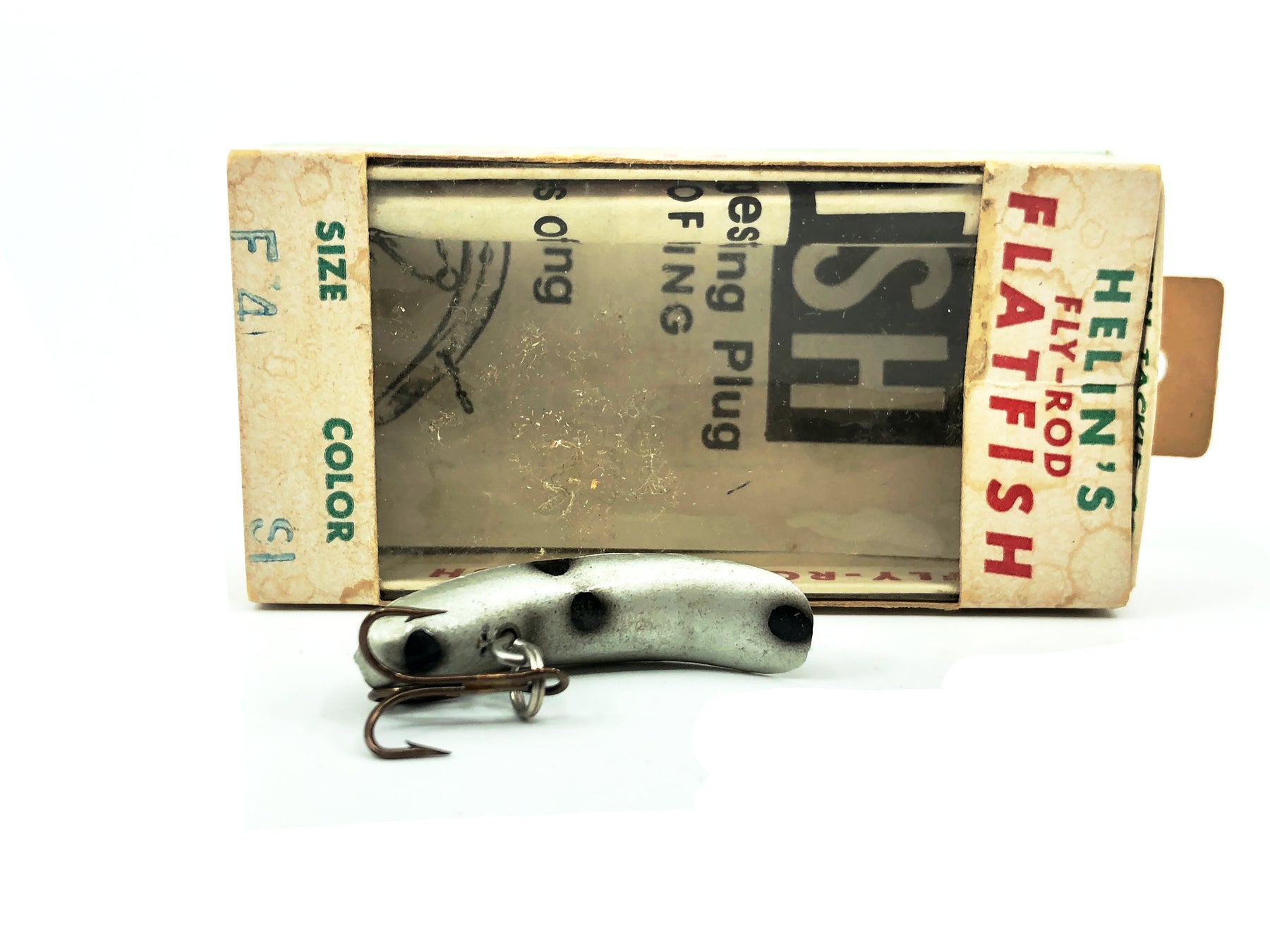 Helin Flatfish F4, SI Silver Color in Box. Box includes paperwork. Box in good condition with some wear and dirt on it. Lure in nice condition. About 1 1/2" long. See photos. Grab this great vintage lure and fish or collect!