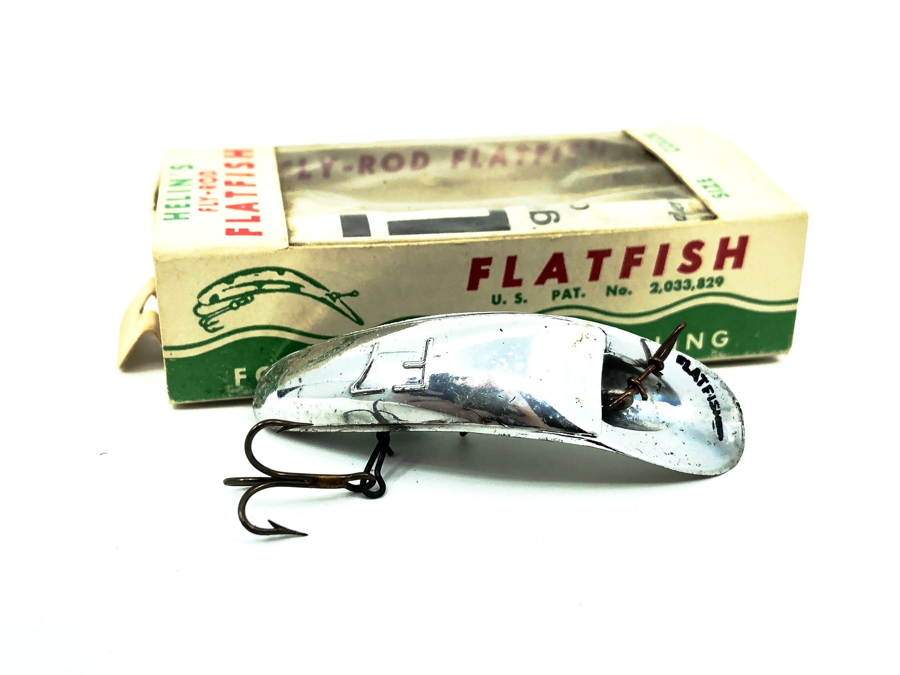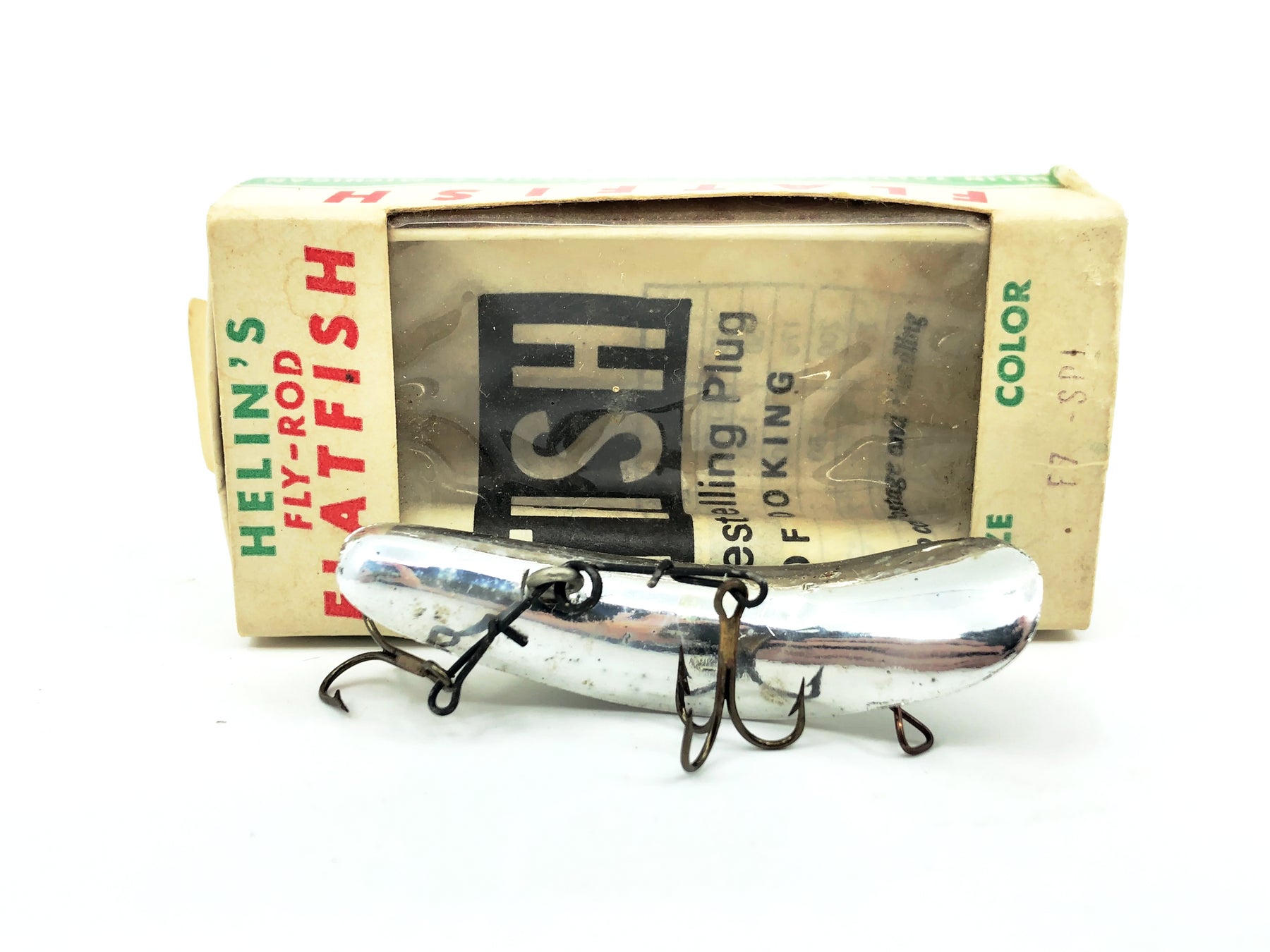 Helin Flatfish F7, SPL Silver Plated Color in Box. Box includes paperwork. Box in good condition with some minor wear. Lure has some minor wear and marks but in overall good condition. About 2 1/4" long. See photos. Grab this great vintage lure and fish or collect!