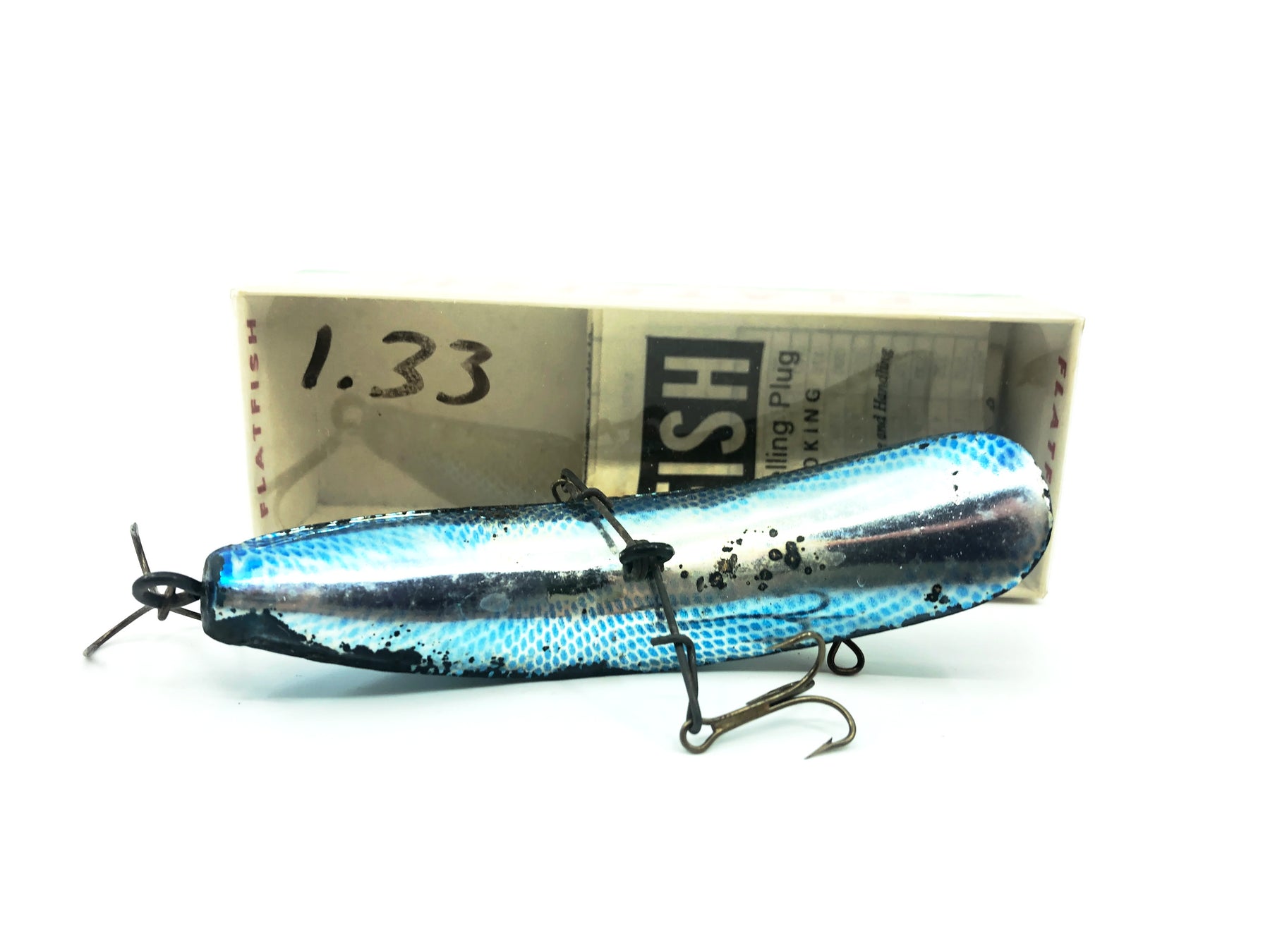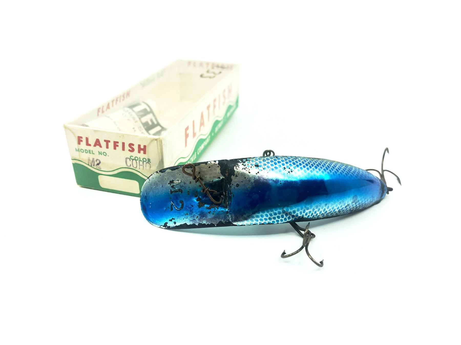 Helin Flatfish M2, COHO Silver Plate Blue Color with Box. About 4 3/8" long. This lure has a good amount of wear and marks but in overall ok condition. The box is in good condition with some minor wear from storage, see photos. One of the most successful fishing lures ever made. Fish or collect! Vintage plastic version.