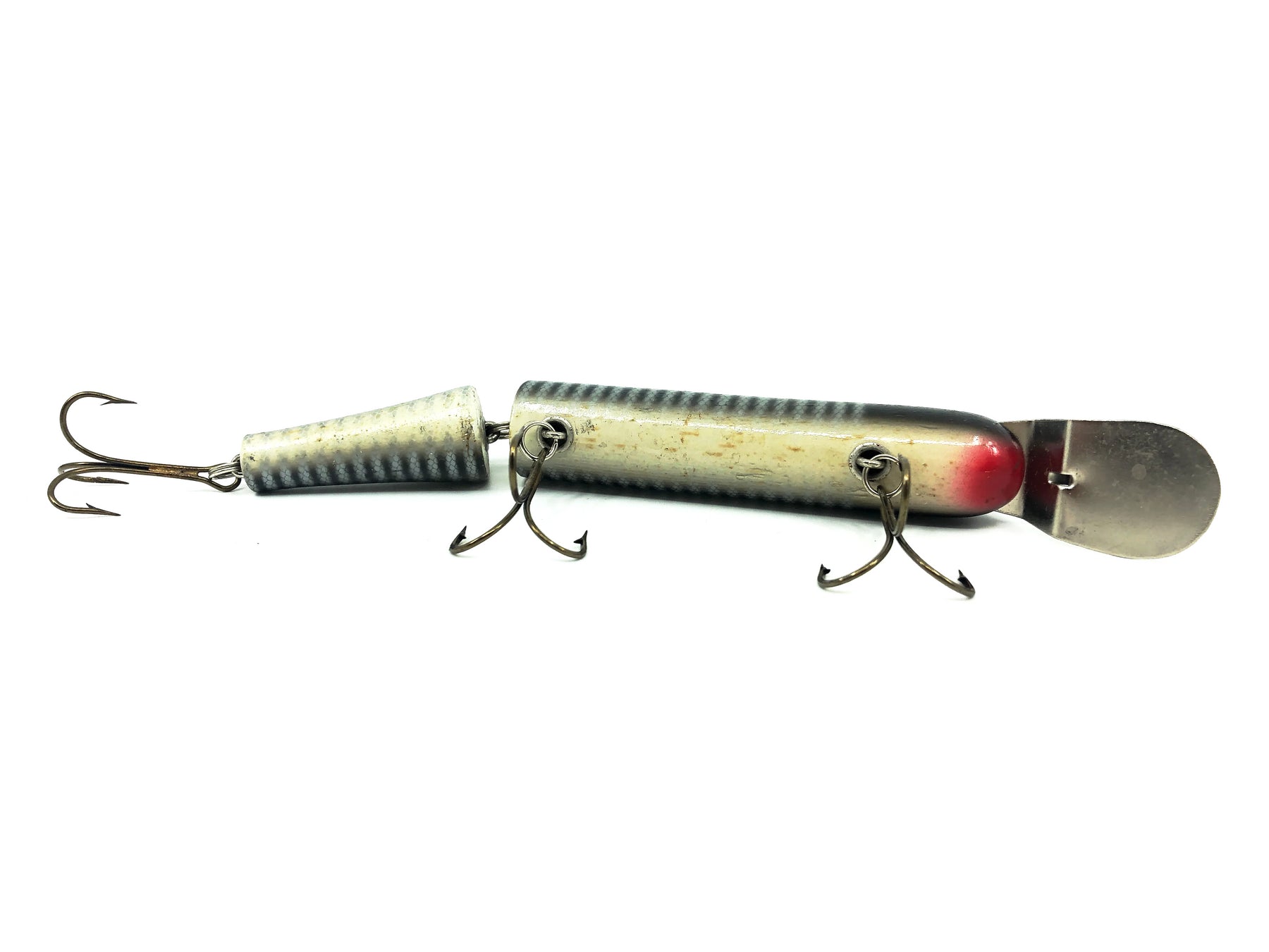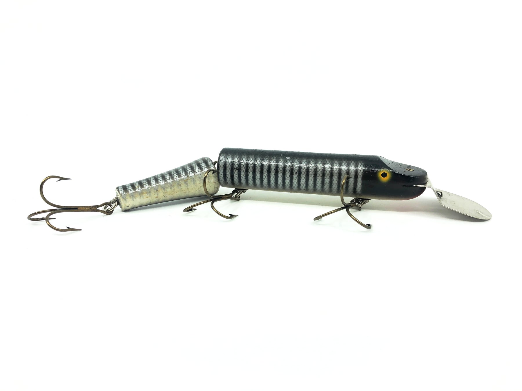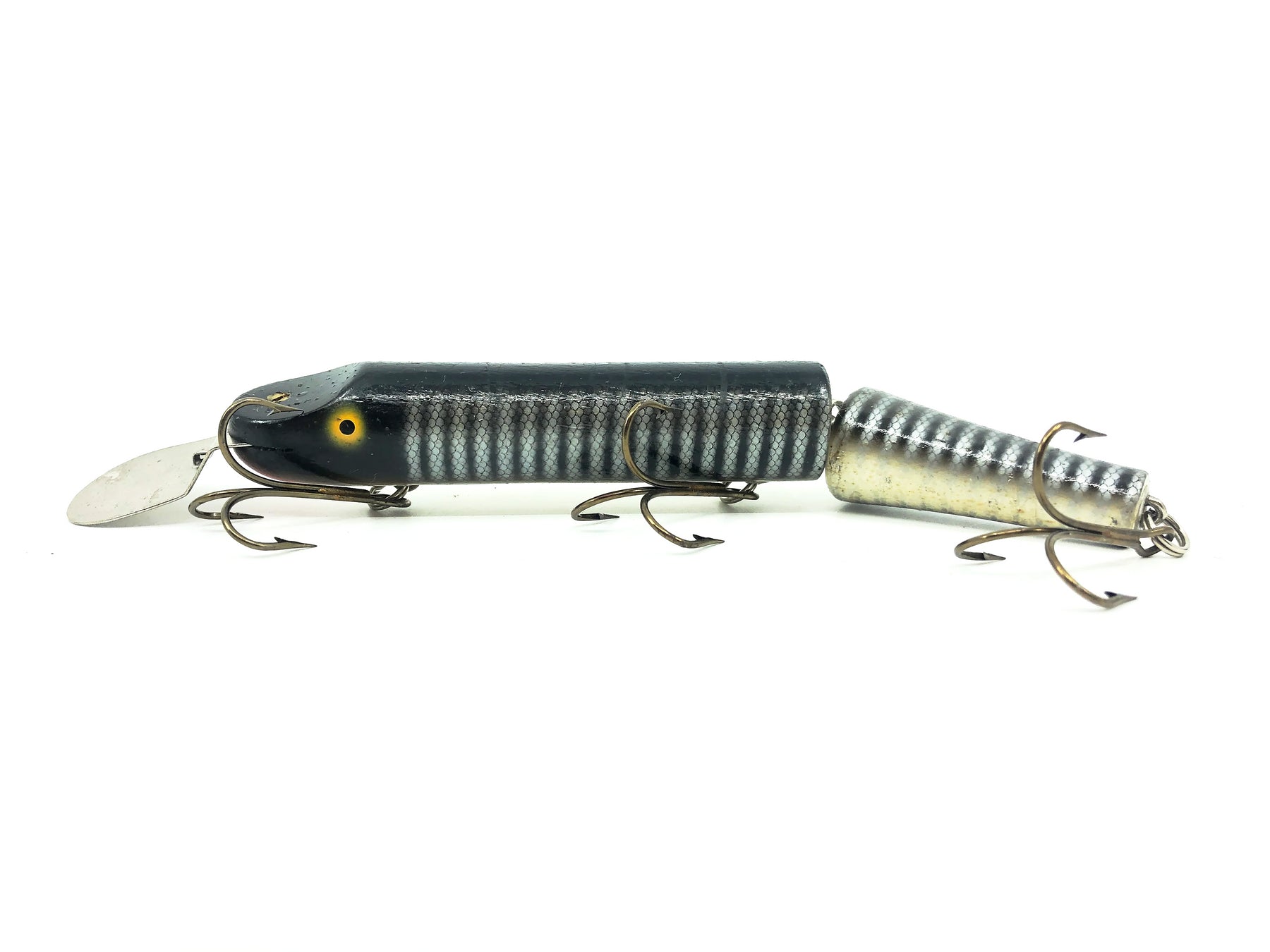 Wooden Jointed Pikie Lure, Black Scale Color. Unknown make on this bait. This lure is about 7 7/8" long including the lip. Used with some minor wear but in overall good condition. Fish this bait or if you know what it is get a deal on a bait for your collection. See photos.
