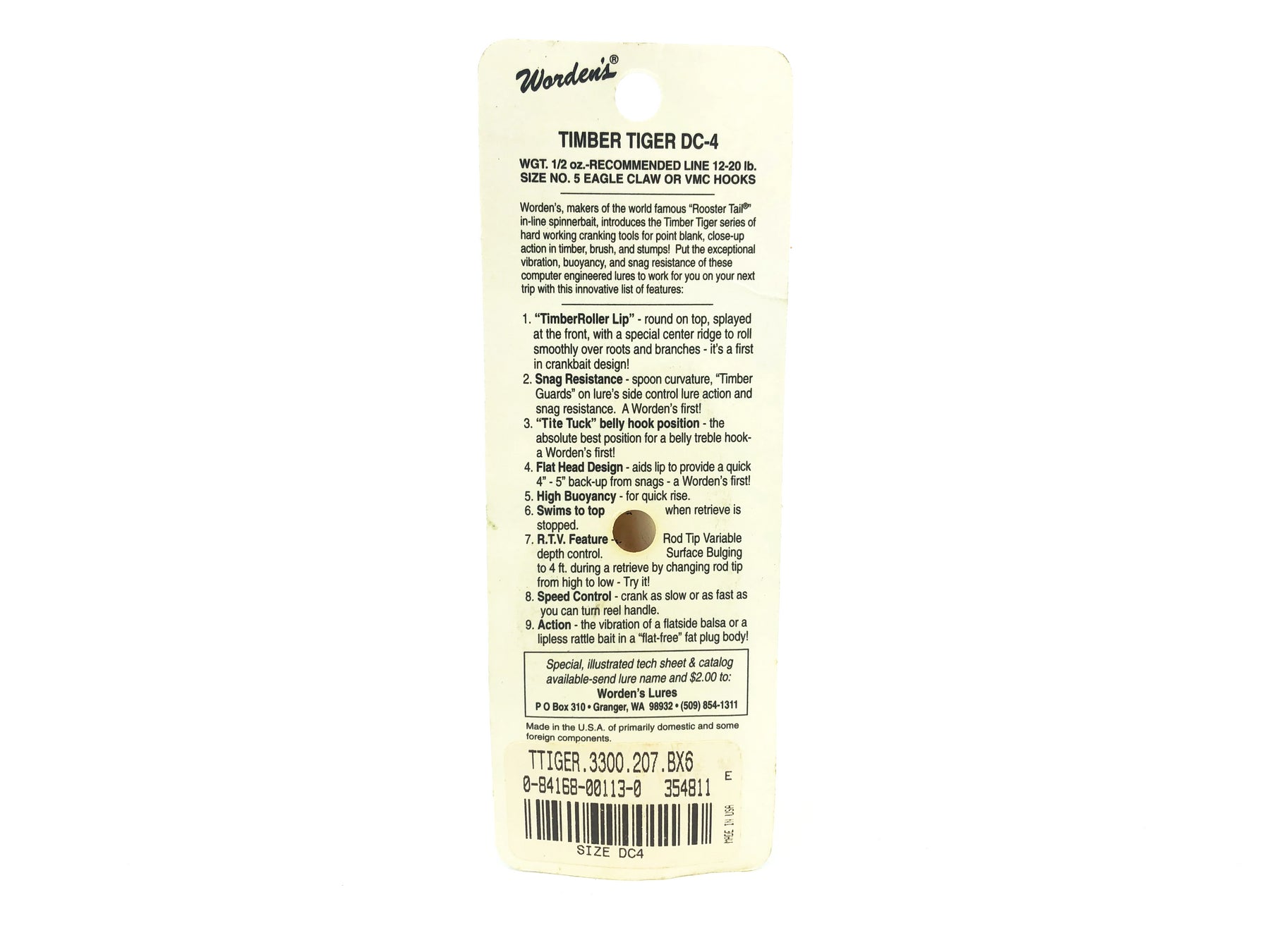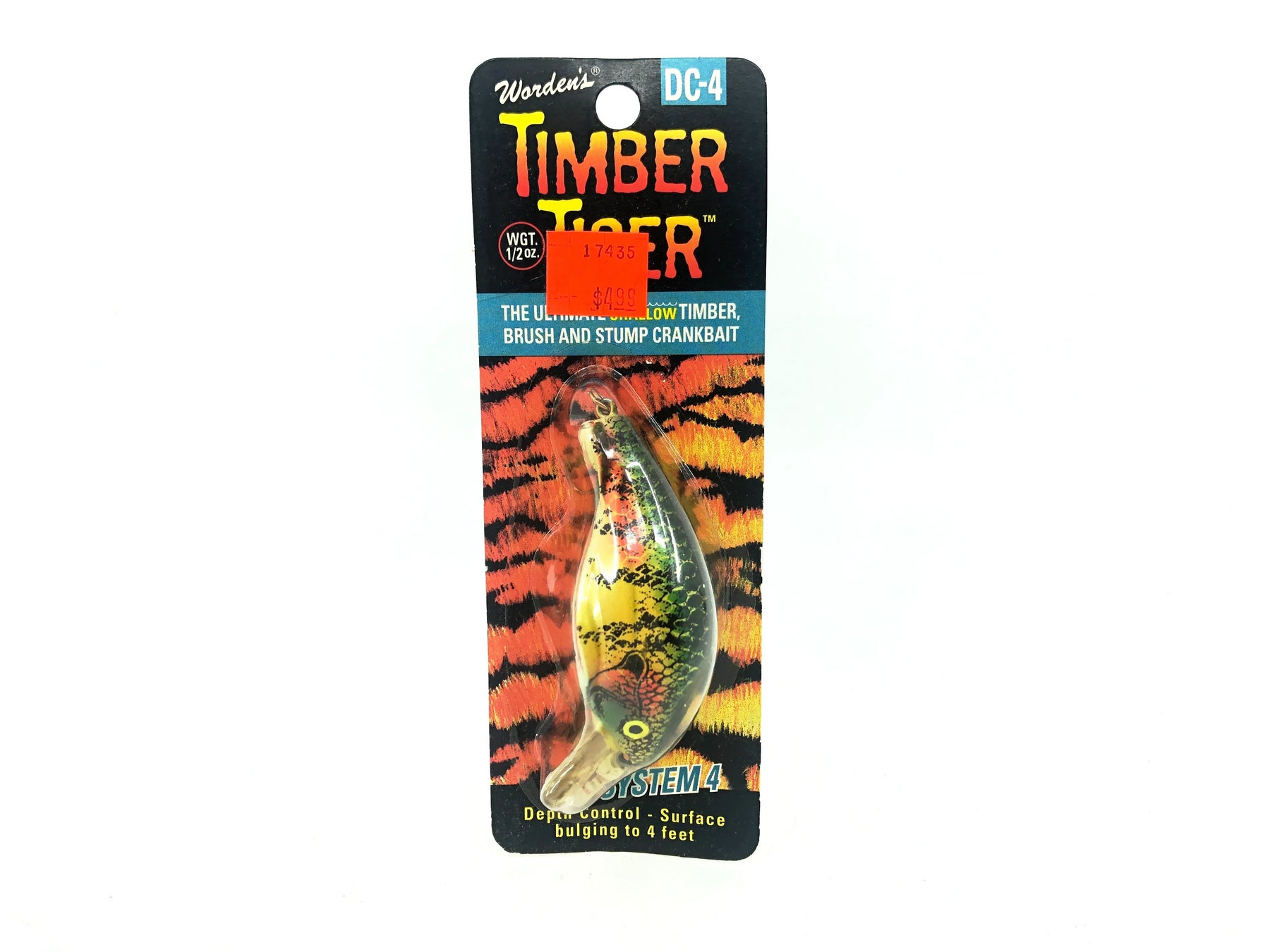 Timber Tiger Deflector DC-4, #207 Worden's Bluegill/Perch Color on Card. Discontinued old stock here. SKU for this lure is 3300-207. Body is about 2 1/2" long. Lure is new on card and the card is in good condition.