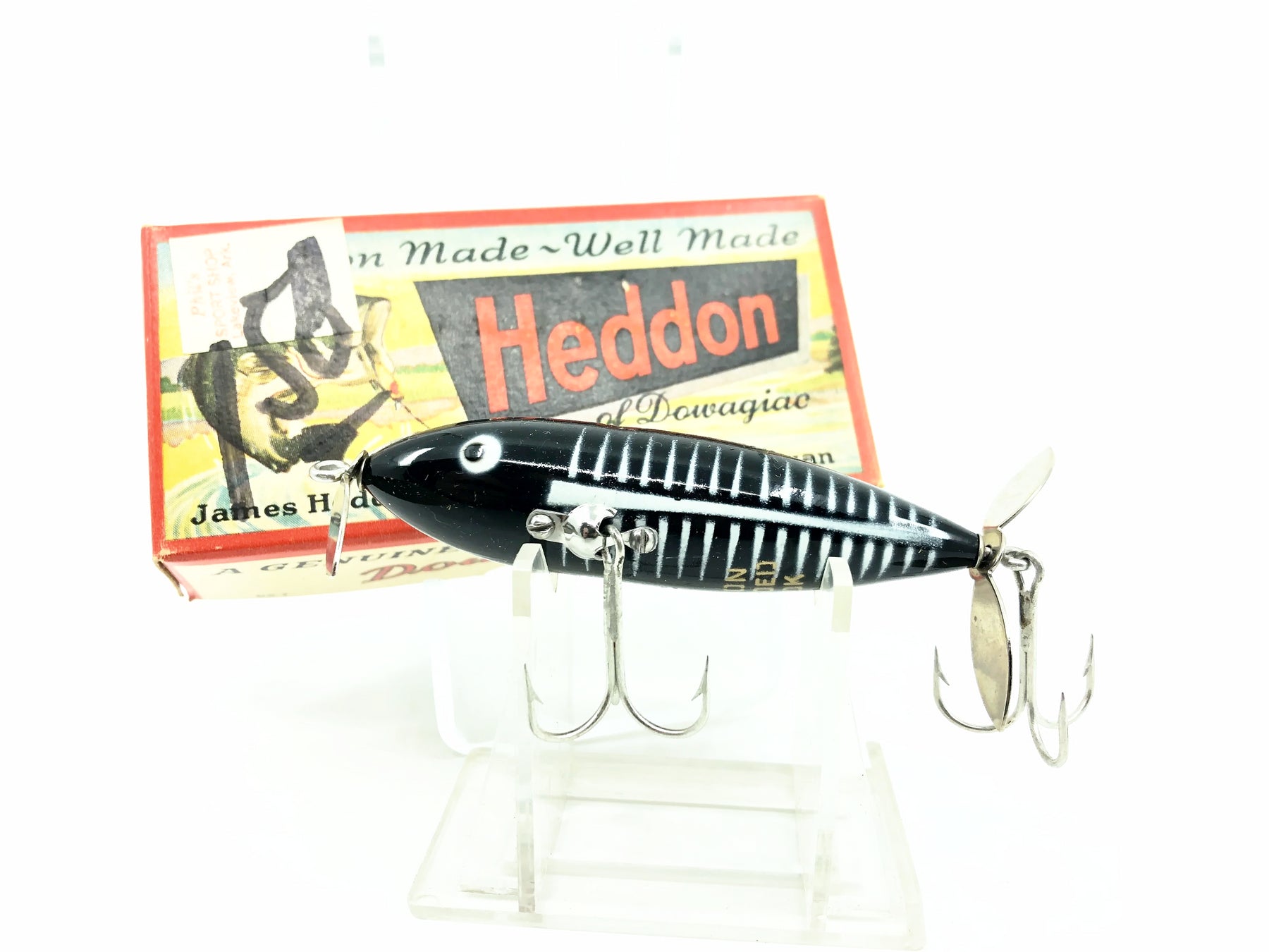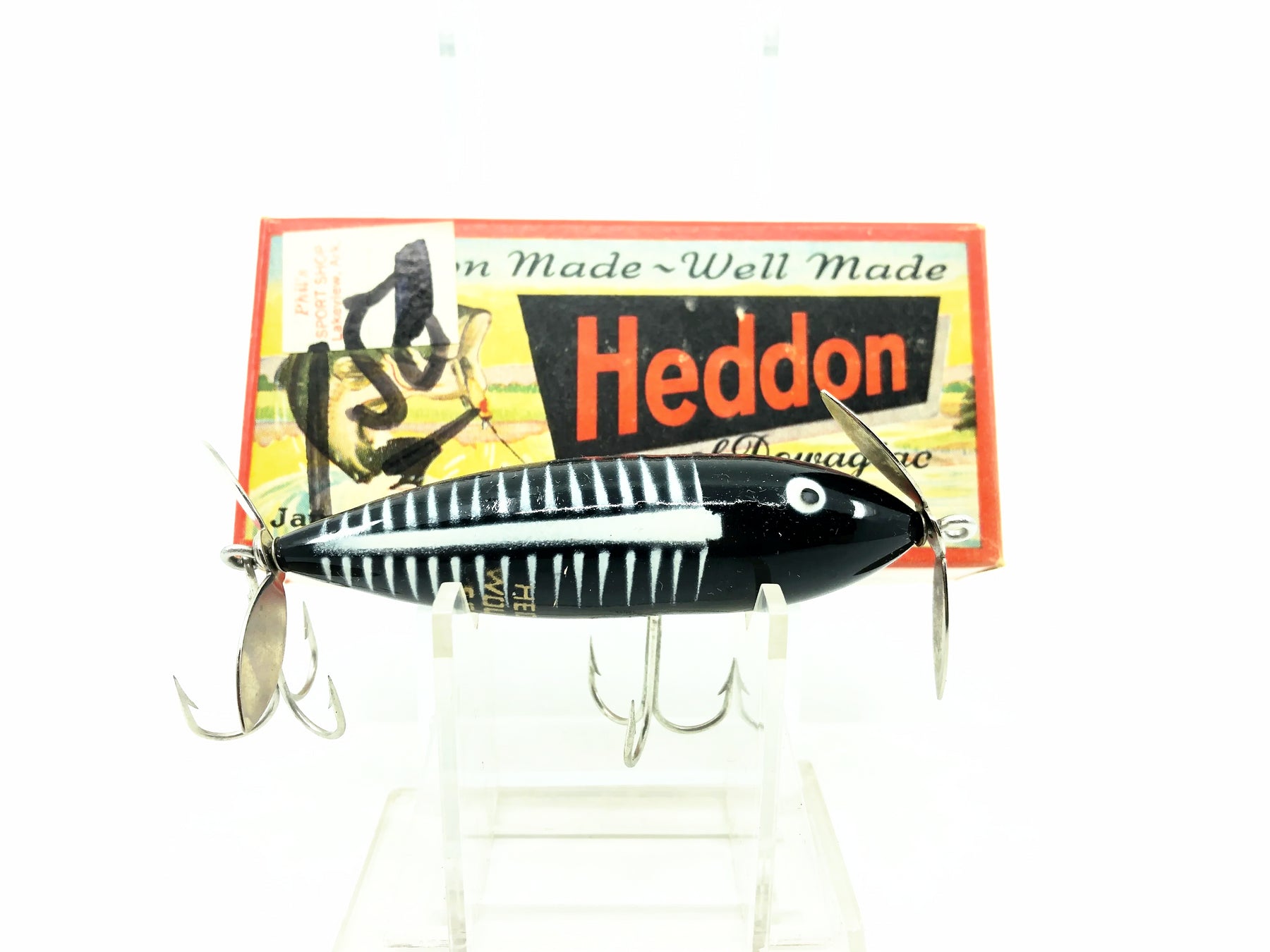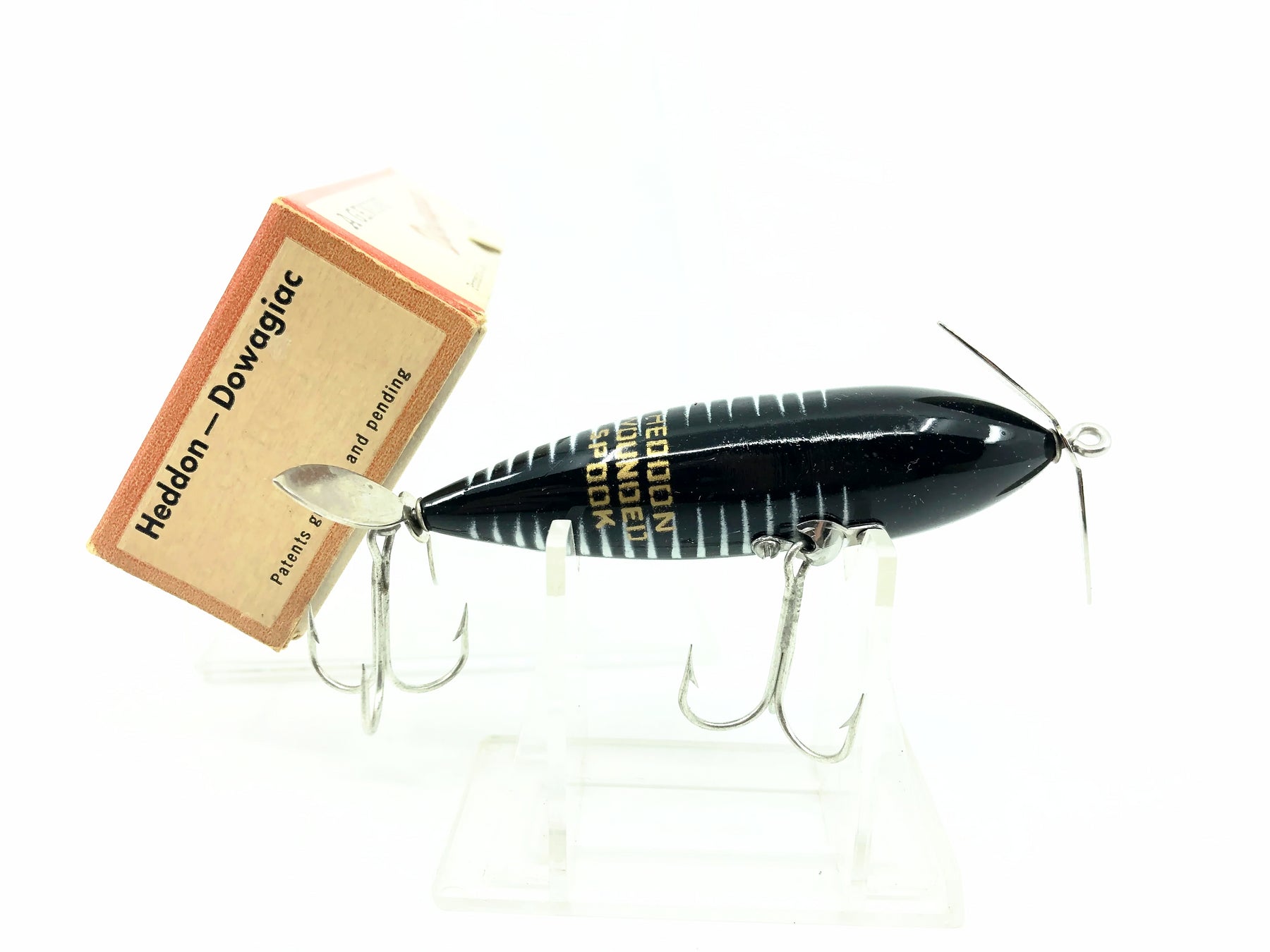 Heddon Wounded Spook 9140, XBW Black Shore Minnow Color w/Box. Box is a mismatch, still a great combo though. Lure is about 3 1/4" long body. Bait is in great condition and the box is in good condition as well (some wear to one end). Great color and great for fishing or collection. Tougher lure to find.