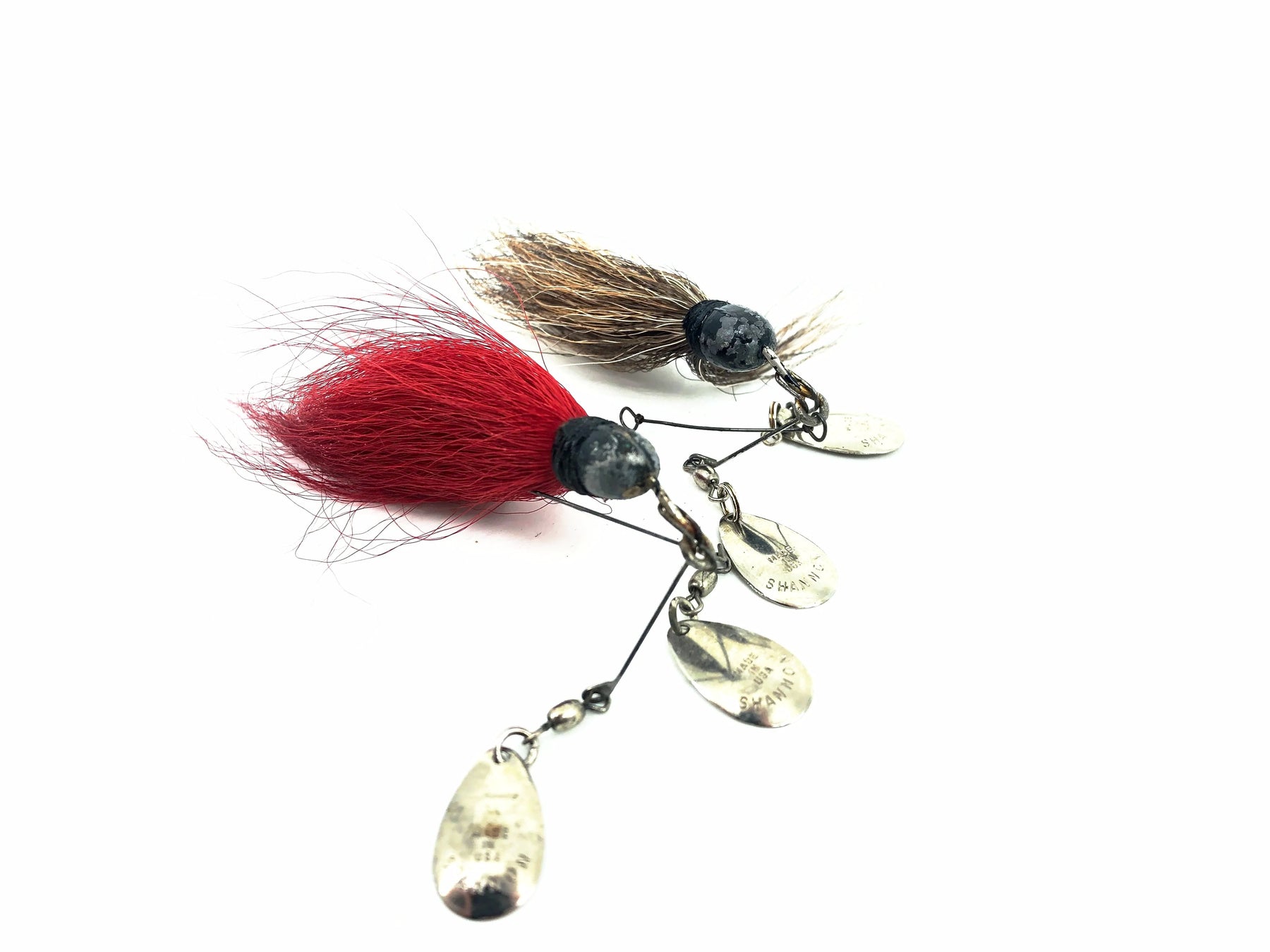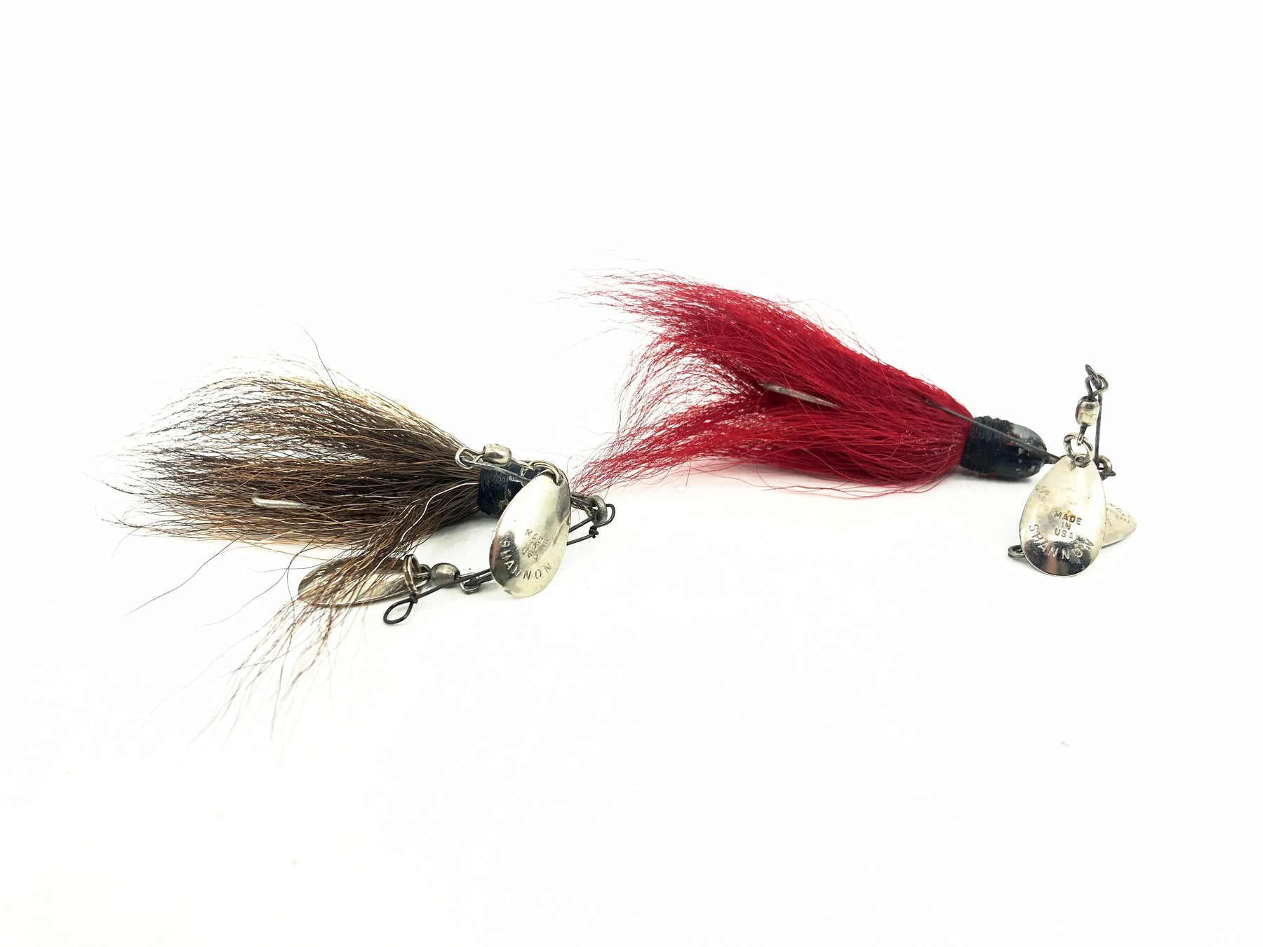 Shannon Twin Spin Two Pack. Earlier twin spins here that are both about 1 7/8" from hook to head of the lure. Both are used but in good condition with a little wear. This is definitely one of the most collectible spinners out there, see photos