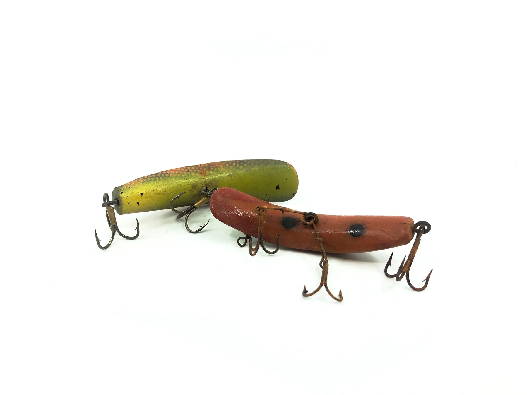 Helin Flatfish X4 Combo, PS Perch Scale/Orange Black Stripe Color. This pack includes one plastic X4 and an older wooden X4. At about 2 1/2" long these lures are used with wear and waxing, but not too much to make the lure lose its classic Flatfish look. See photos. Fish or collect!