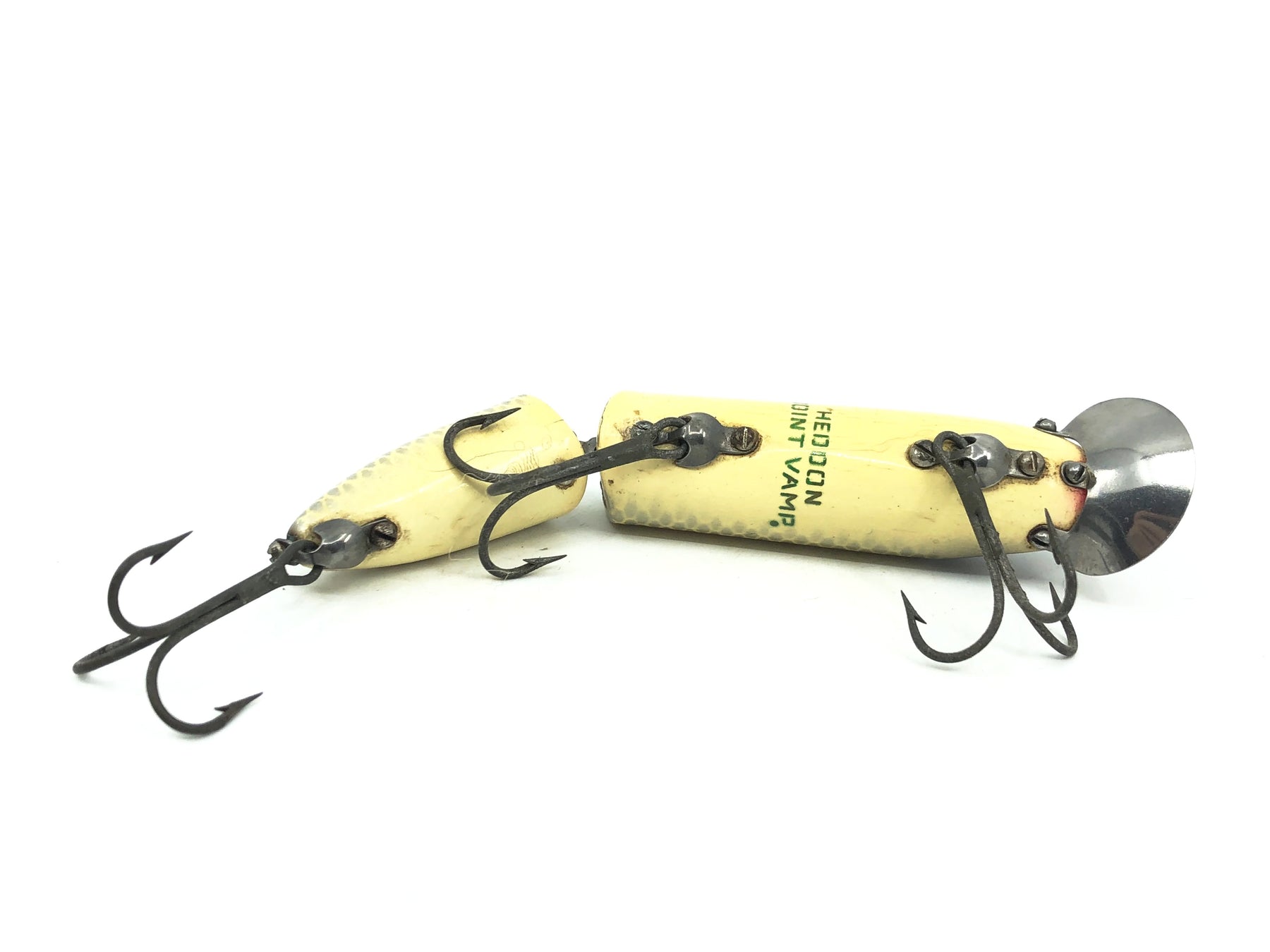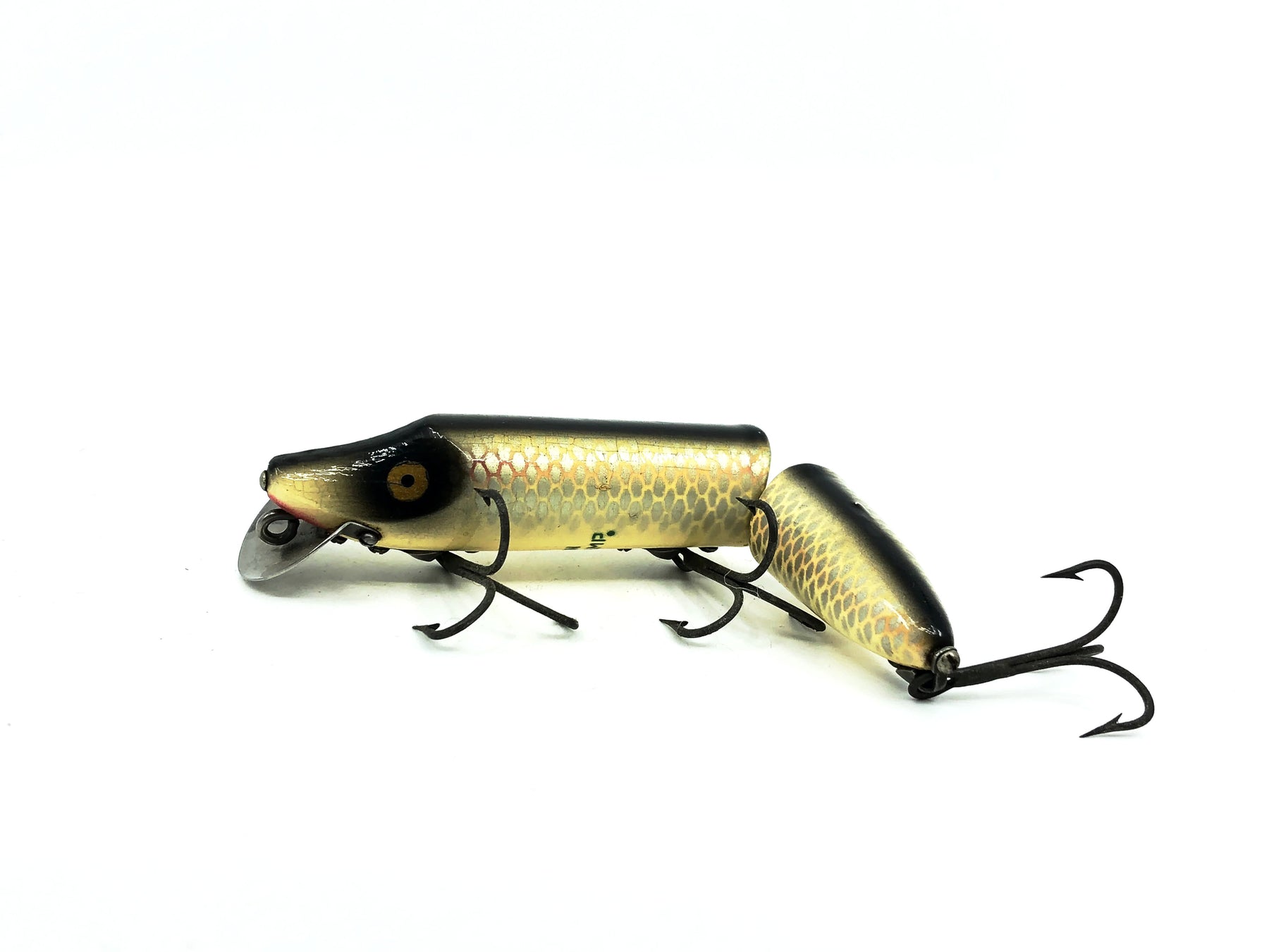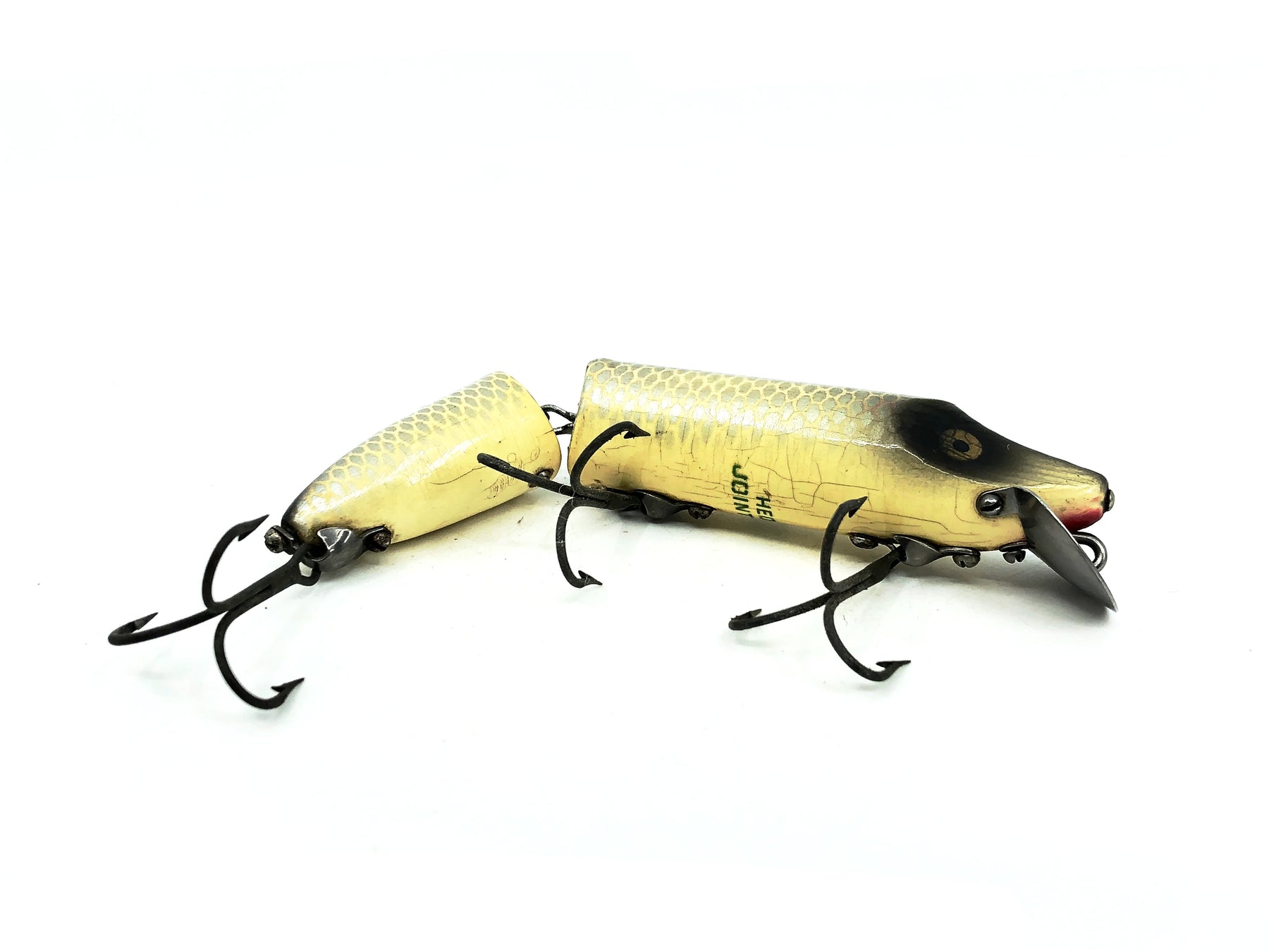 Heddon Jointed Vamp, P Shiner Scale Color. Vintage wooden lure, a Heddon classic. Lure is about 4 3/4" long overall. Used with some wear but still in good condition. Classic Heddon bait to fish or collect. See photos. One of the best baits ever made!