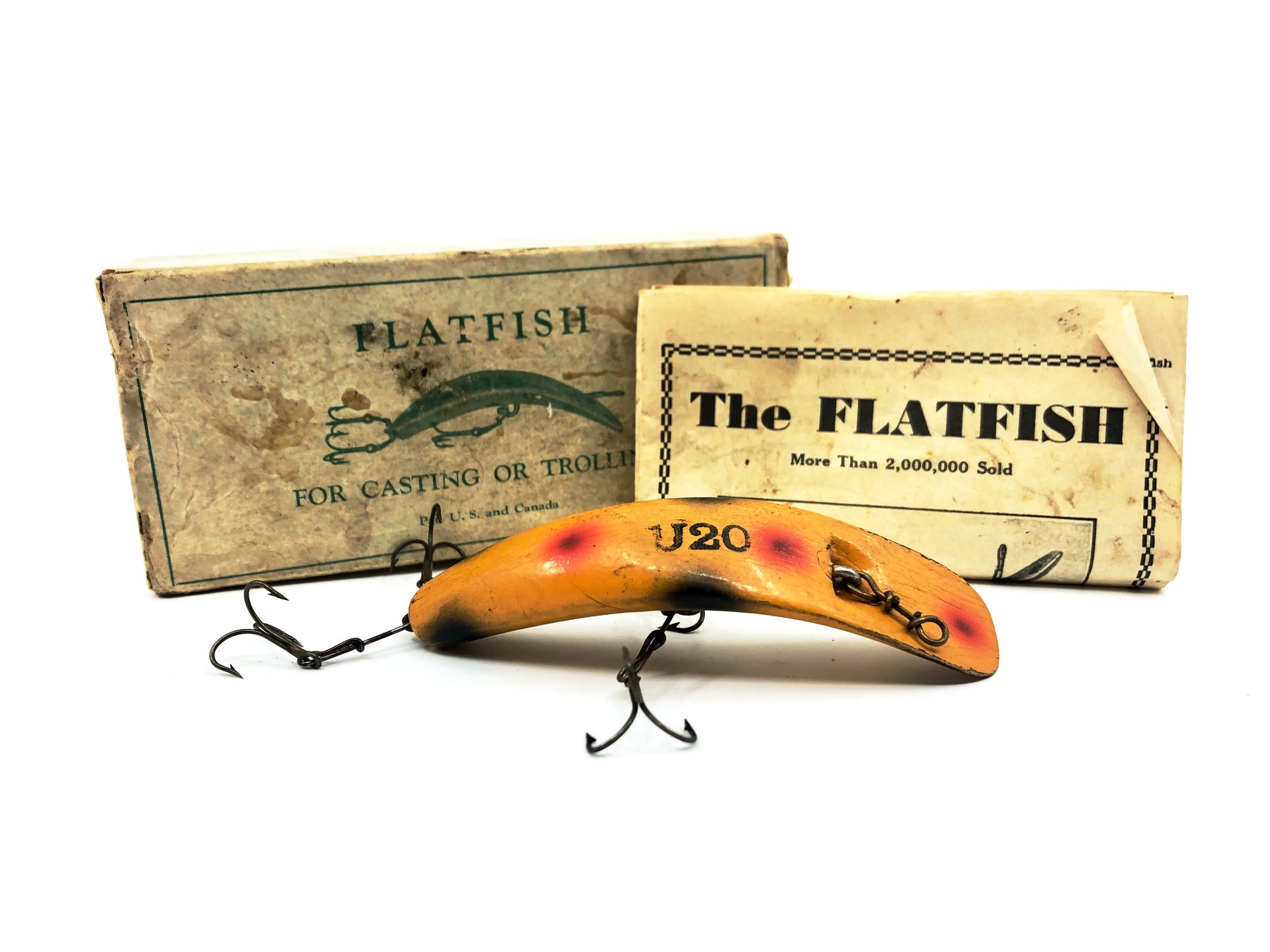 Vintage Helin Flatfish U20, O Orange Color with Box. Great wooden Flatfish combo from 1945. Lure is about 3 1/2" long. This lure has some minor wear from storage but in overall good condition. The box has some minor wear but is in overall good condition. See photos.