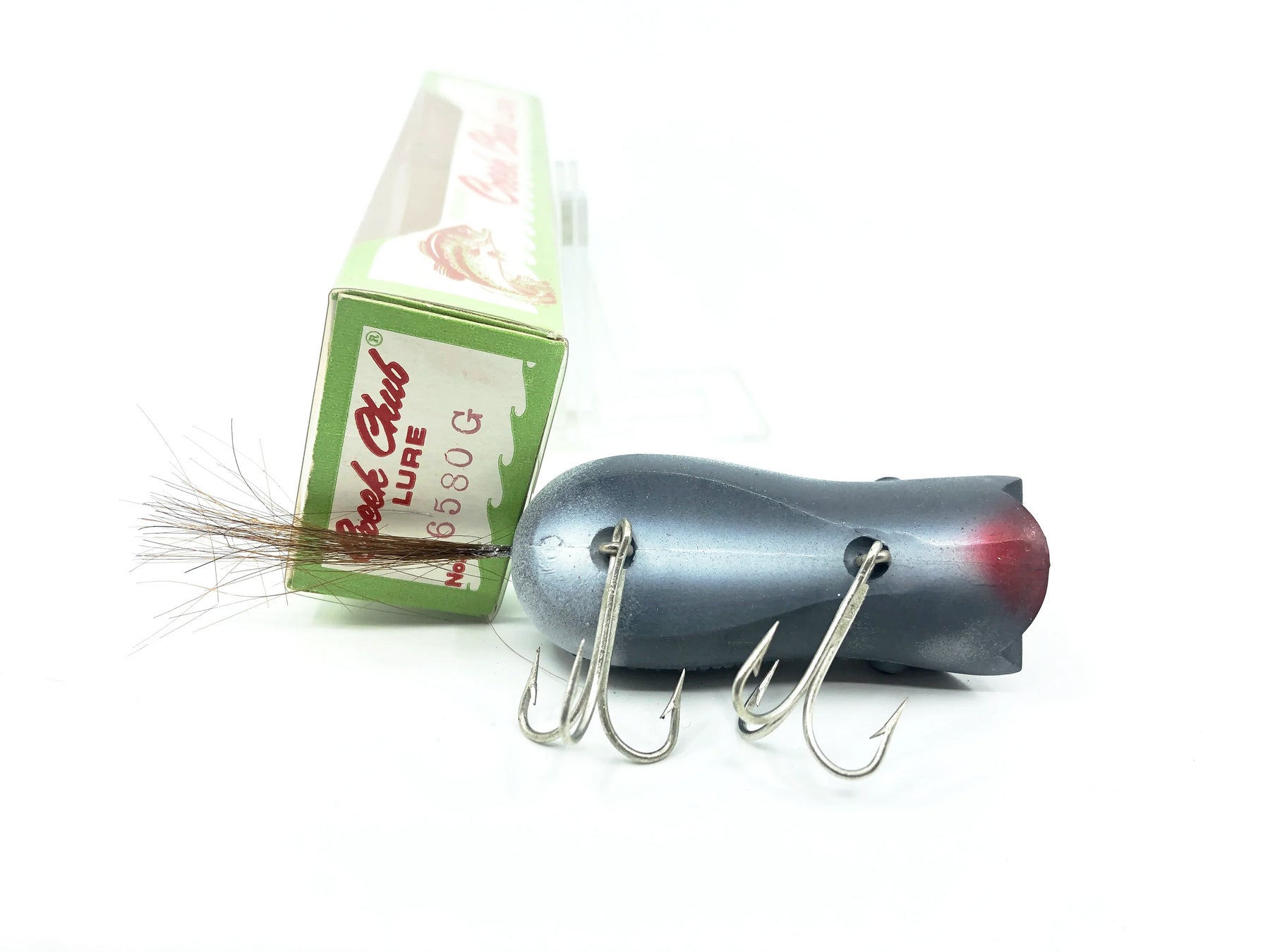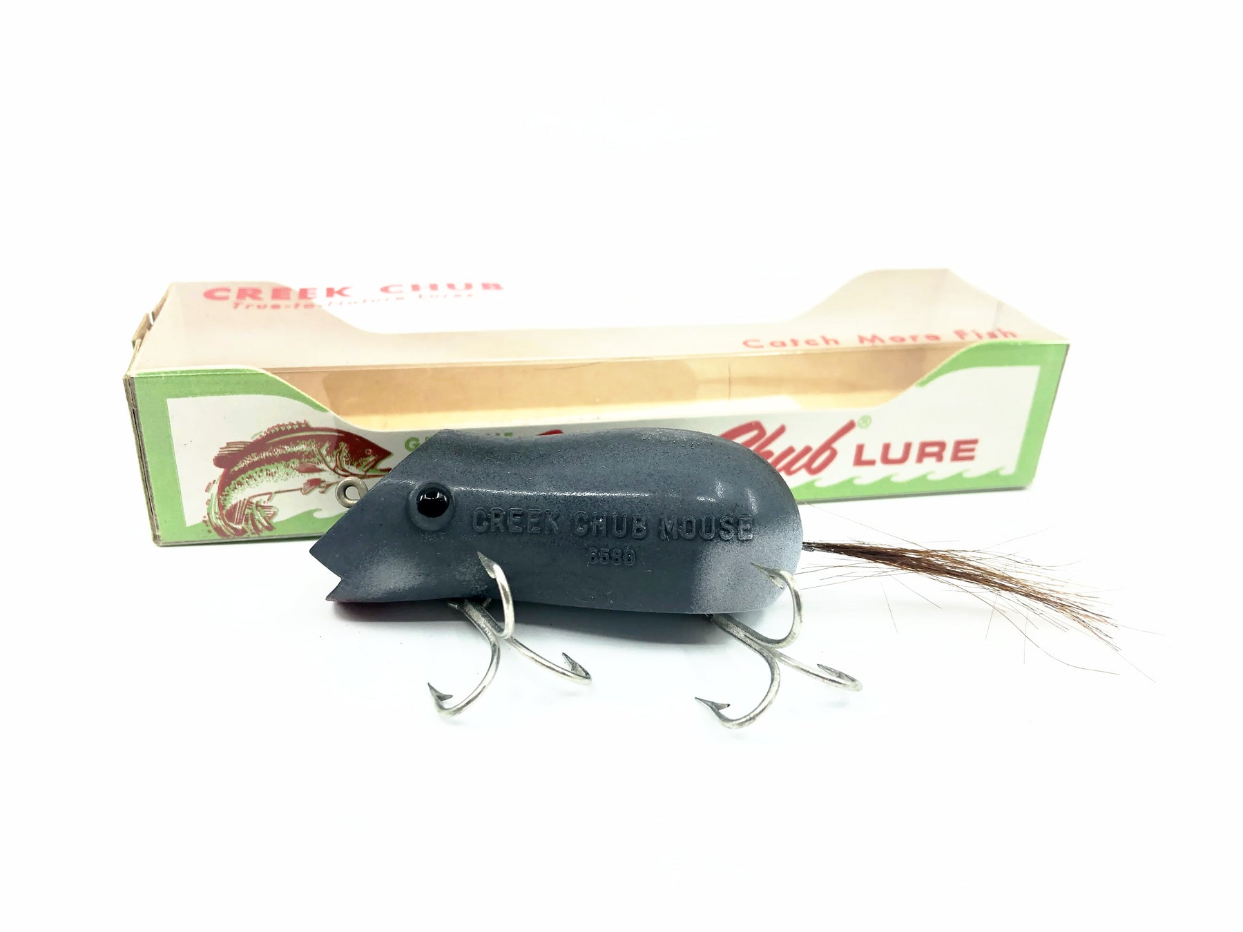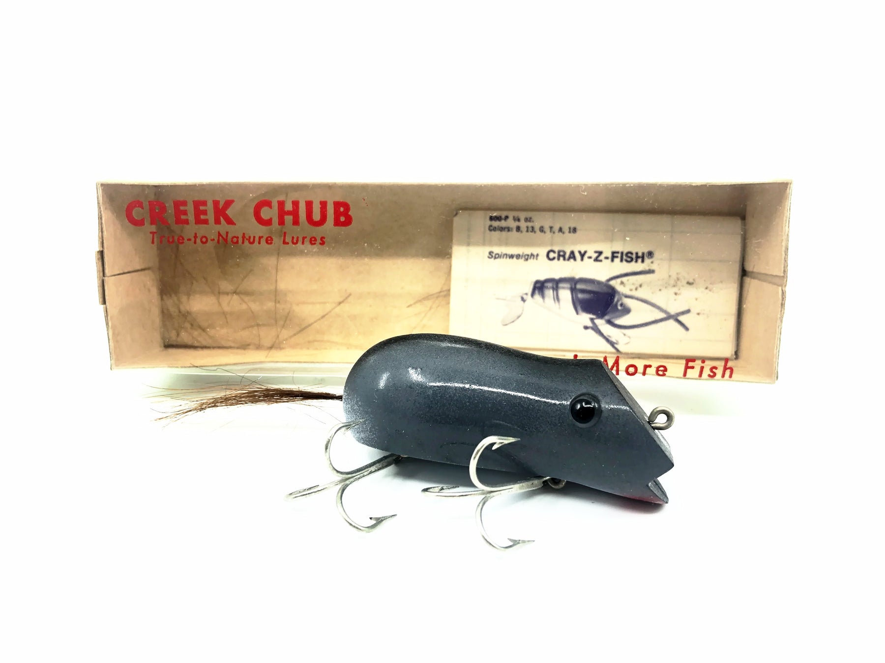 Creek Chub 6580 Mouse, Grey Color w/Box. About 2 3/4" long body. Used vintage lure with some wear and waxing as shown but still in overall good condition. Box is in great condition. See photos. Made from 1957-1978 by the Creek Chub Bait Company.
