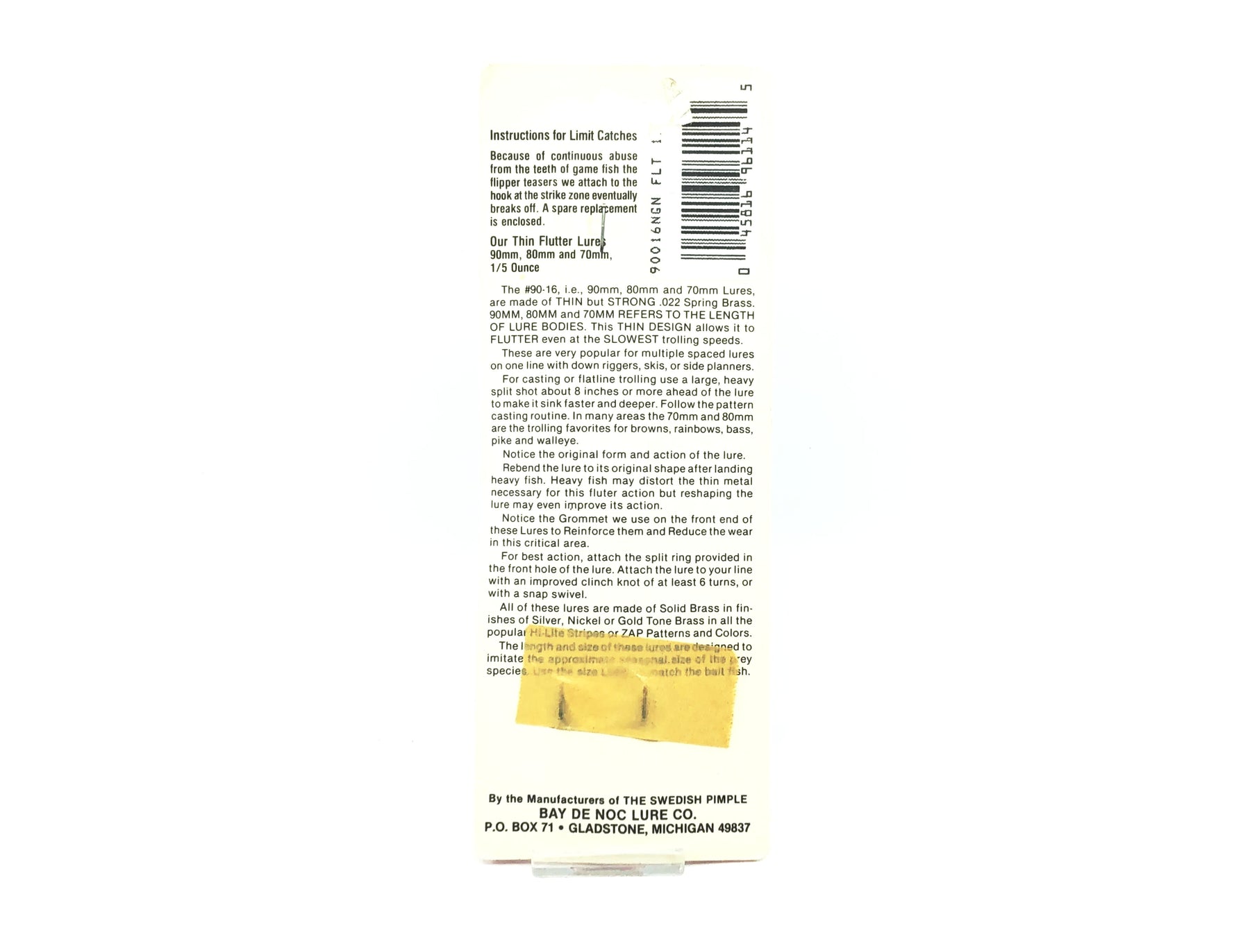 Flutter Laker Takers are made of .020 spring brass—flutter spoon version. With a sharp bend in the treble hook end, this makes them very popular for slow trolling or multiple lure use on down riggers.