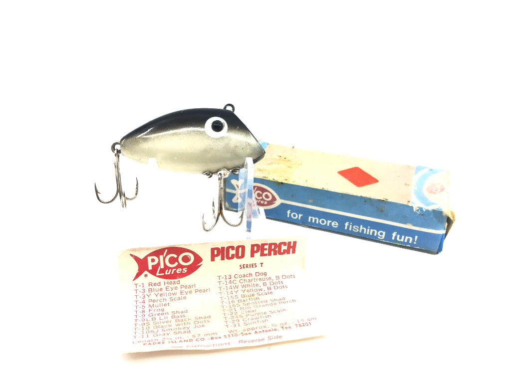 PICO Perch Series T Smokey Joe Color with Box. Lure is about 2 1/4" long and appears unfished. Box has some smudges on the sleeve and some minor wear. Fish or collect. See photos. Getting so tough to find these older models anymore.