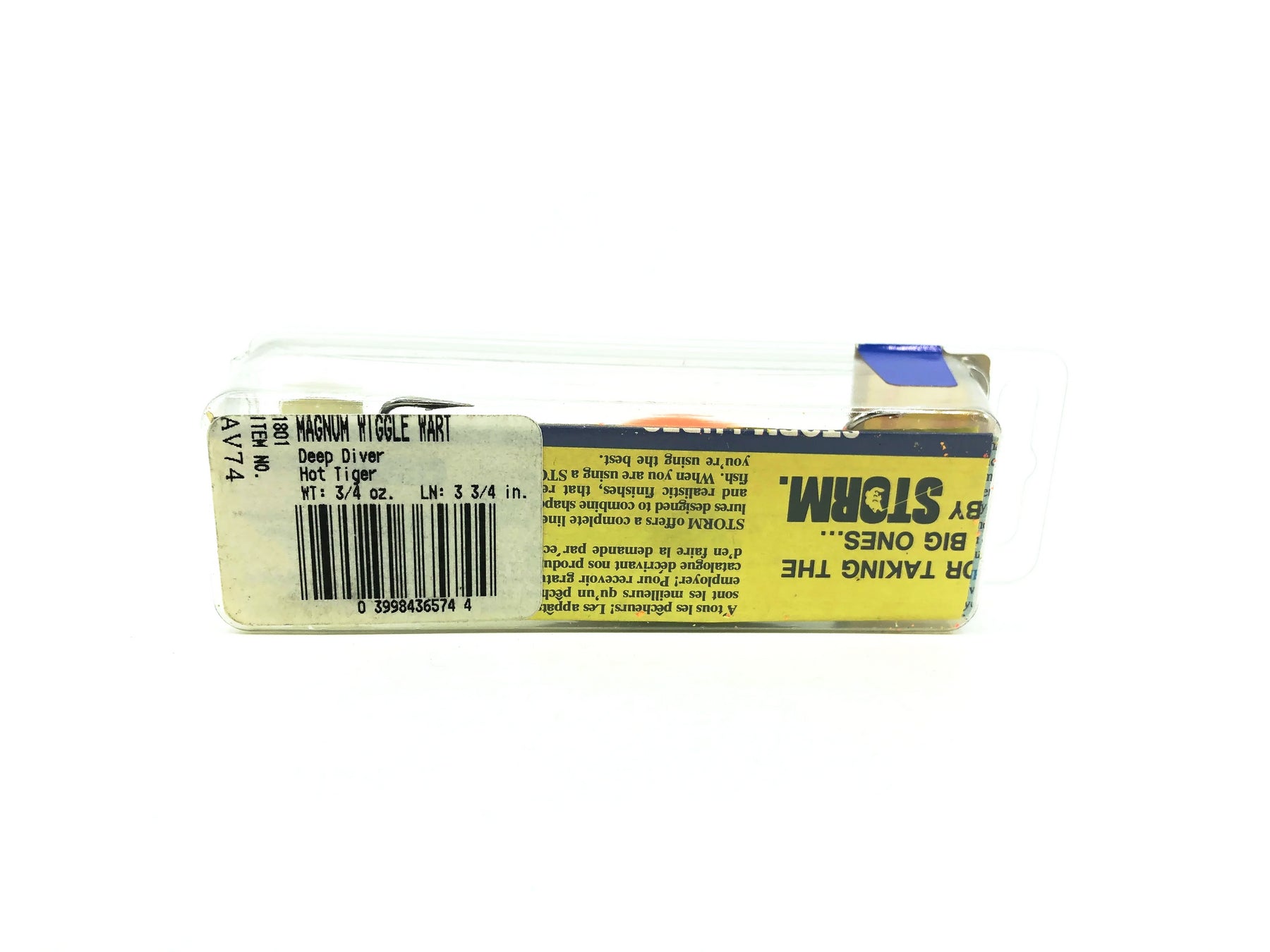 Storm Magnum Wiggle Wart AV74 Hot Tiger Color in Box.  Great pre-Rapala Storm bait here.  About 3 3/4" long including lip (2 1/2" body). This bait is new in box and the box is in overall good condition aside from some uv staining. See photos.