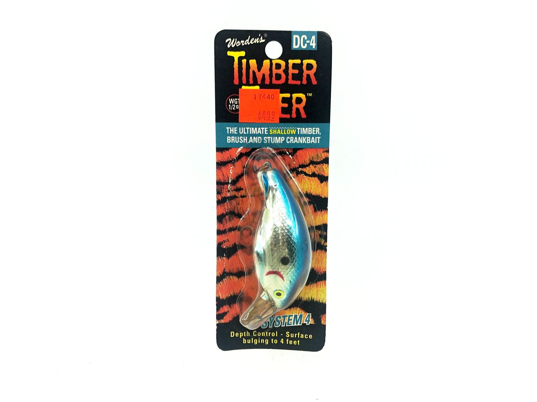 Timber Tiger Deflector DC-4, #218 Metallic Silver/Blue Back Color on Card. Discontinued old stock here. SKU for this lure is 3300-218. Body is about 2 1/2" long. Lure is new on card and the card is in good condition.