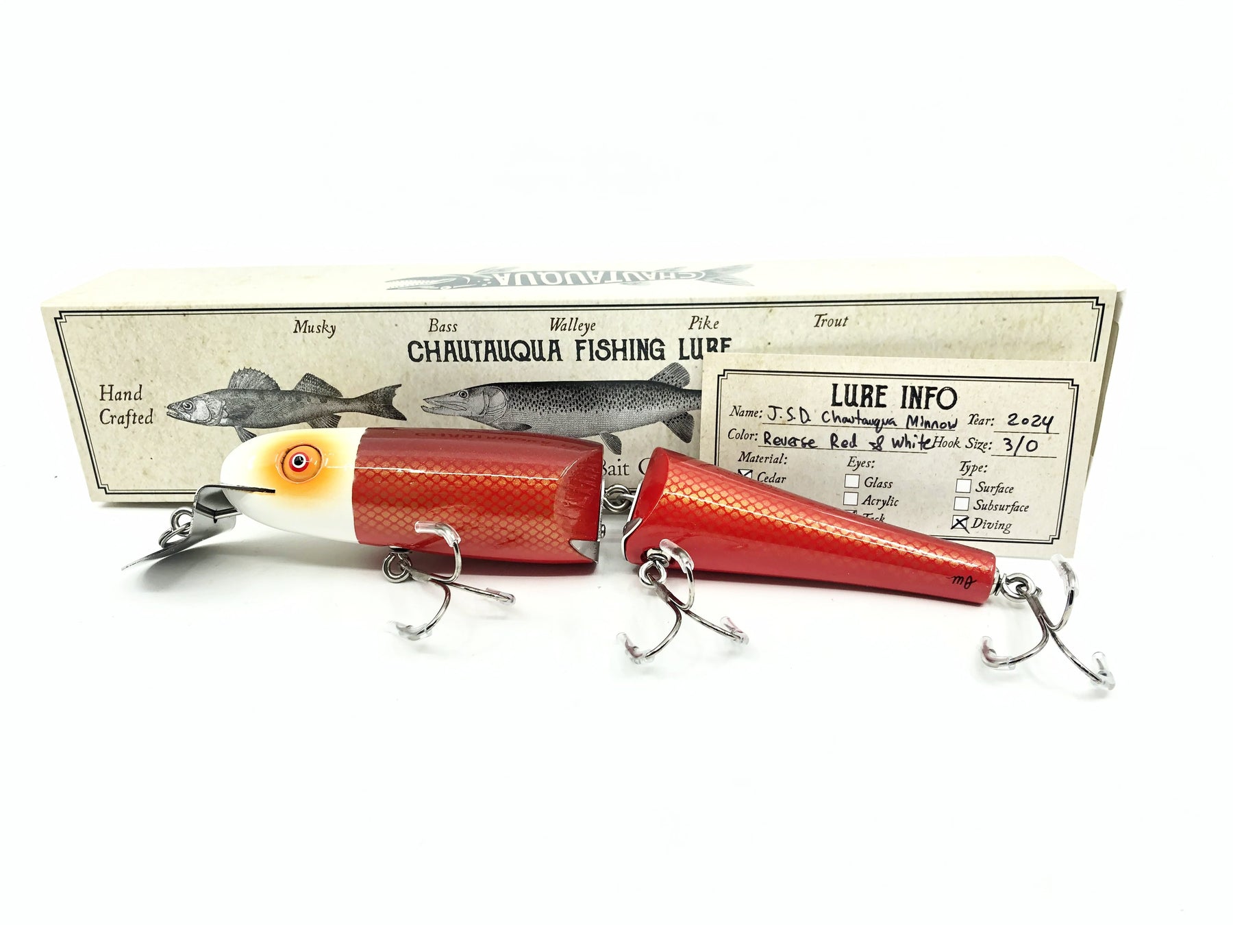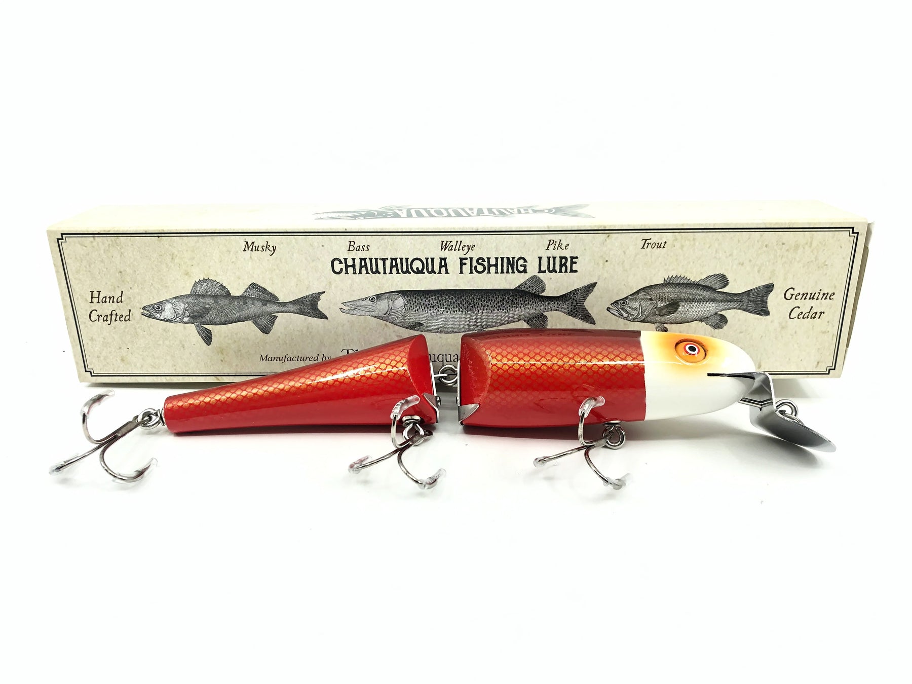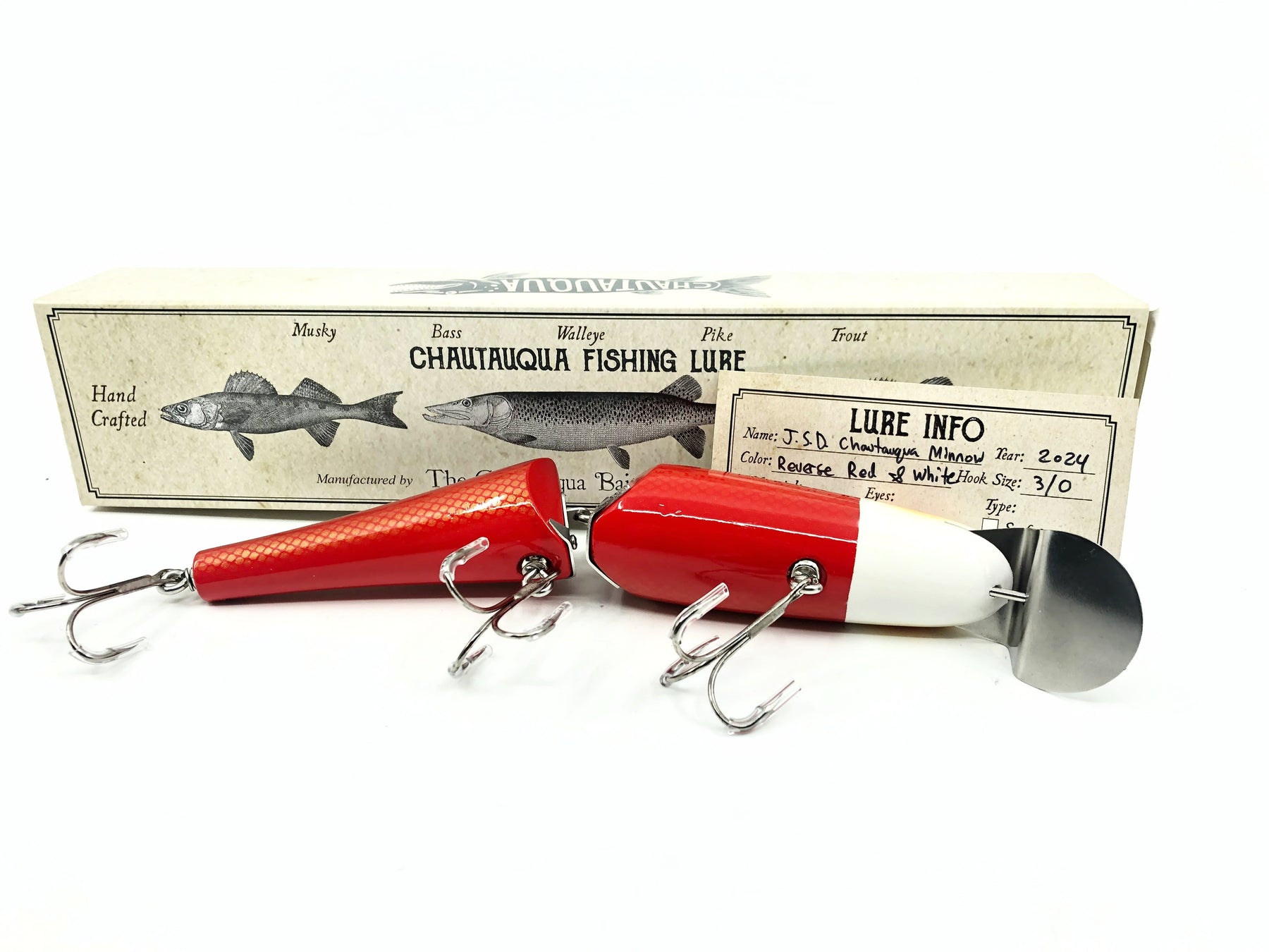 Jointed Chautauqua 8" Shallow Diver, Reverse Red & White Color. Get this very special bait and add to your collection or better yet take fishing! That's what it was made for!