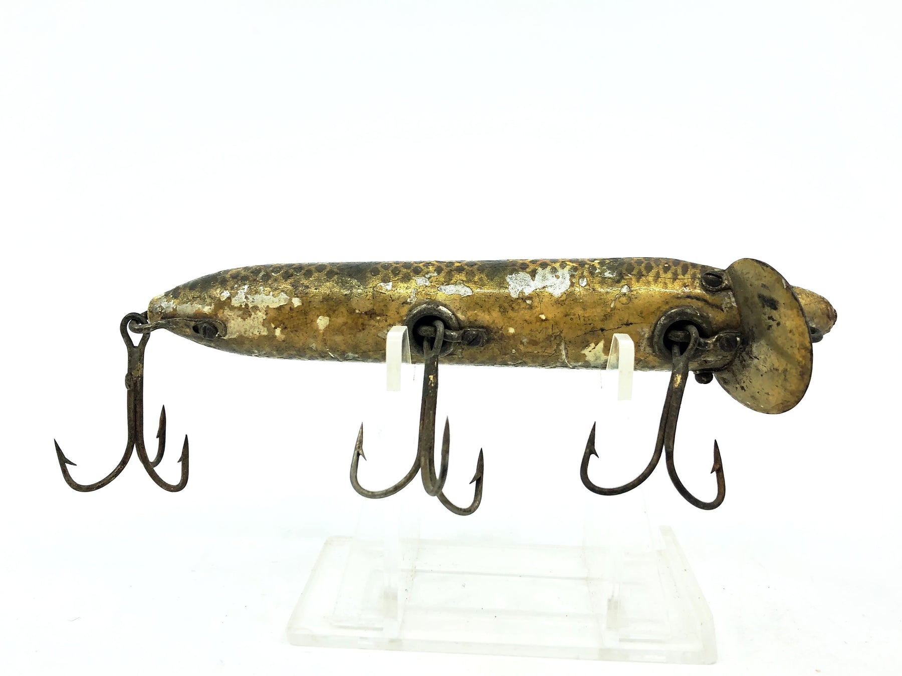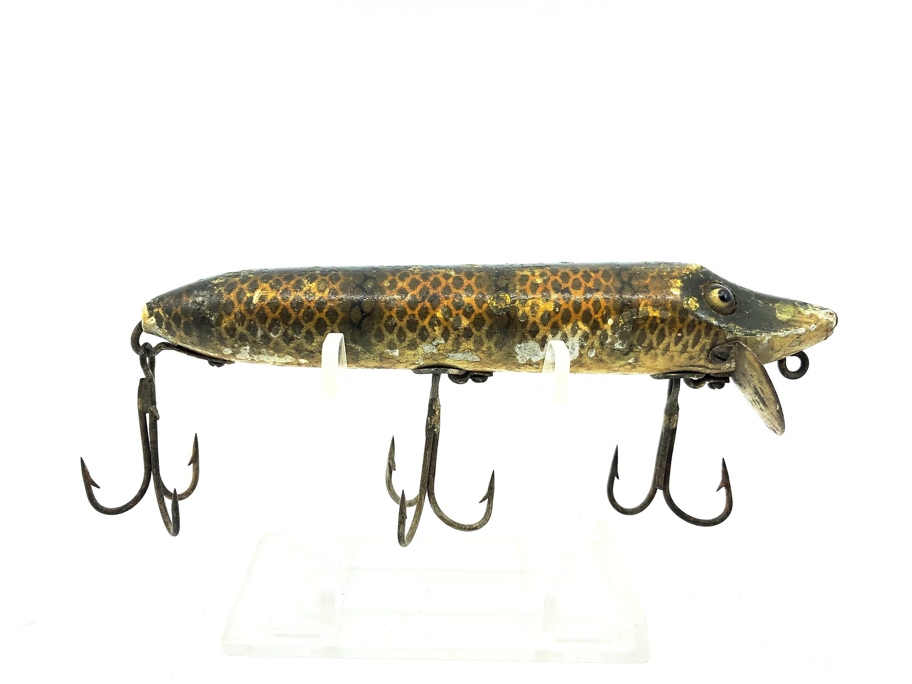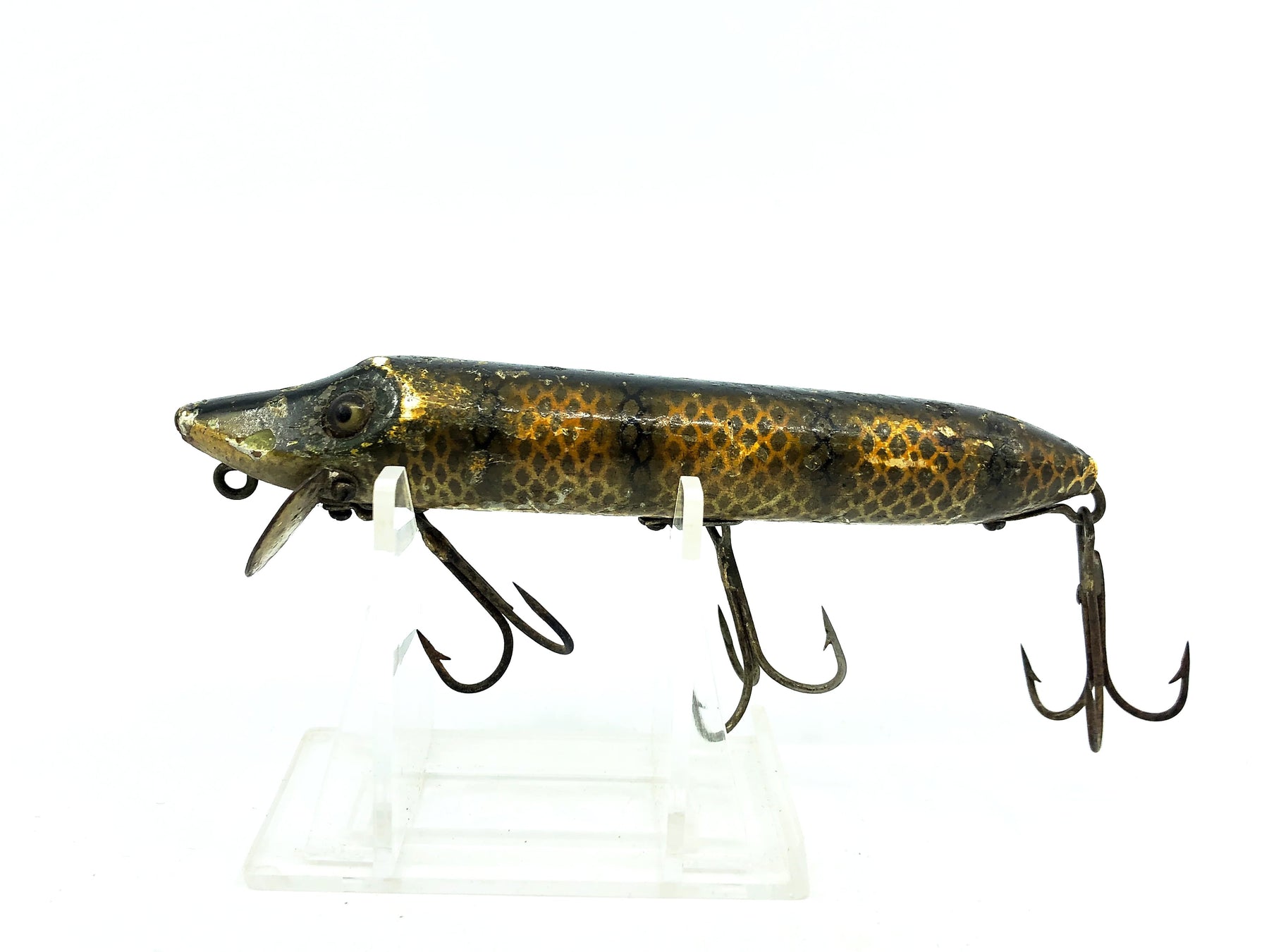 Heddon Vamp, Pike Color, L-Rig Hardware. Hard to find vintage bait here. Glass eyes and early L-rig hardware. Lure is about 4 1/2" long. Used with wear, marks, and a broken barb but in overall ok condition for this early lure, See photos. Grab this one for your collection. Tougher color to find in any condition.