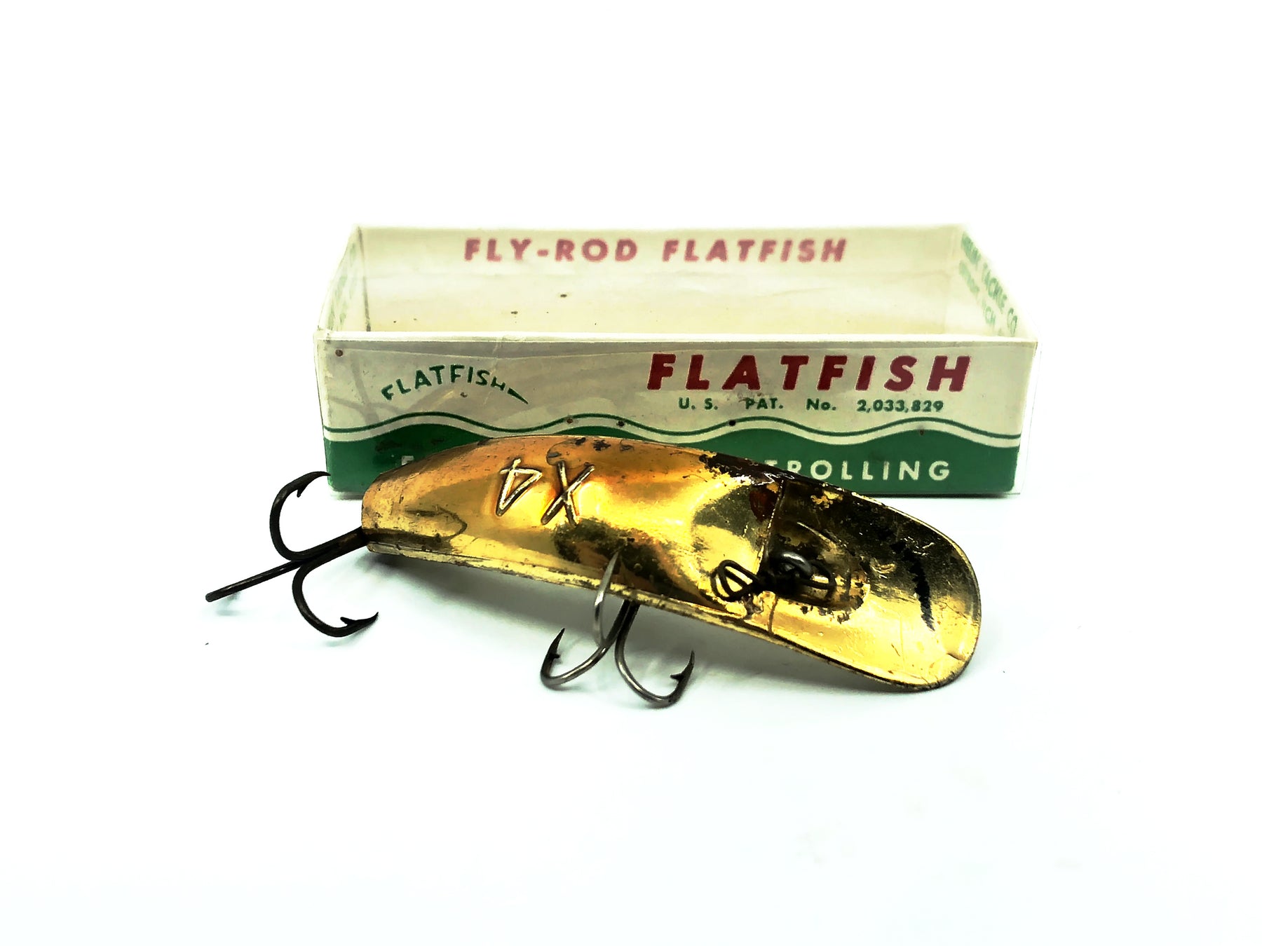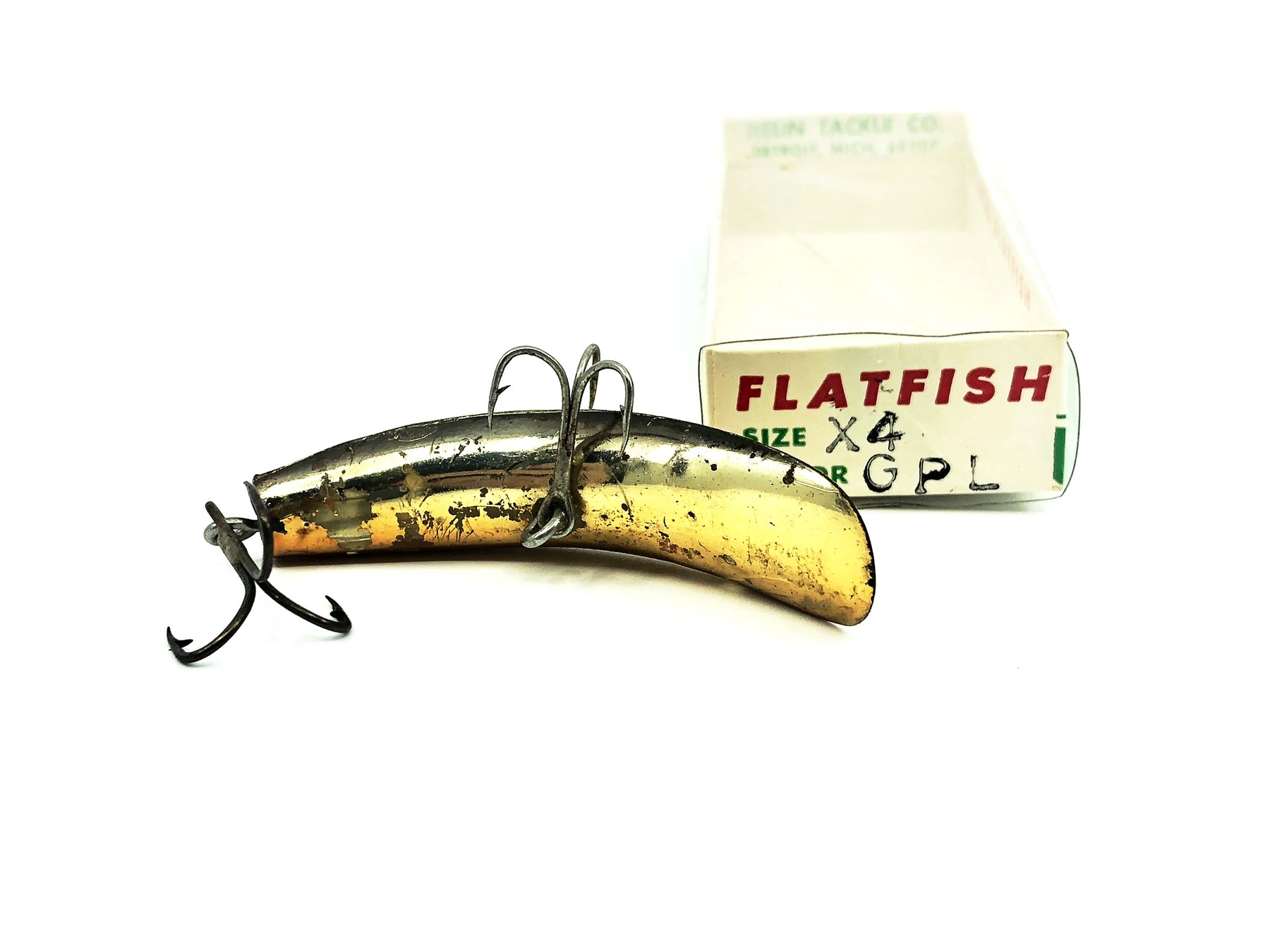 Vintage Helin Flatfish X4, GPL Gold Plated Color with Box. Lure is about 2 1/2" long. Lure has some dirt and marks from storage. Matching box has some wear but is in overall good condition. See photos.