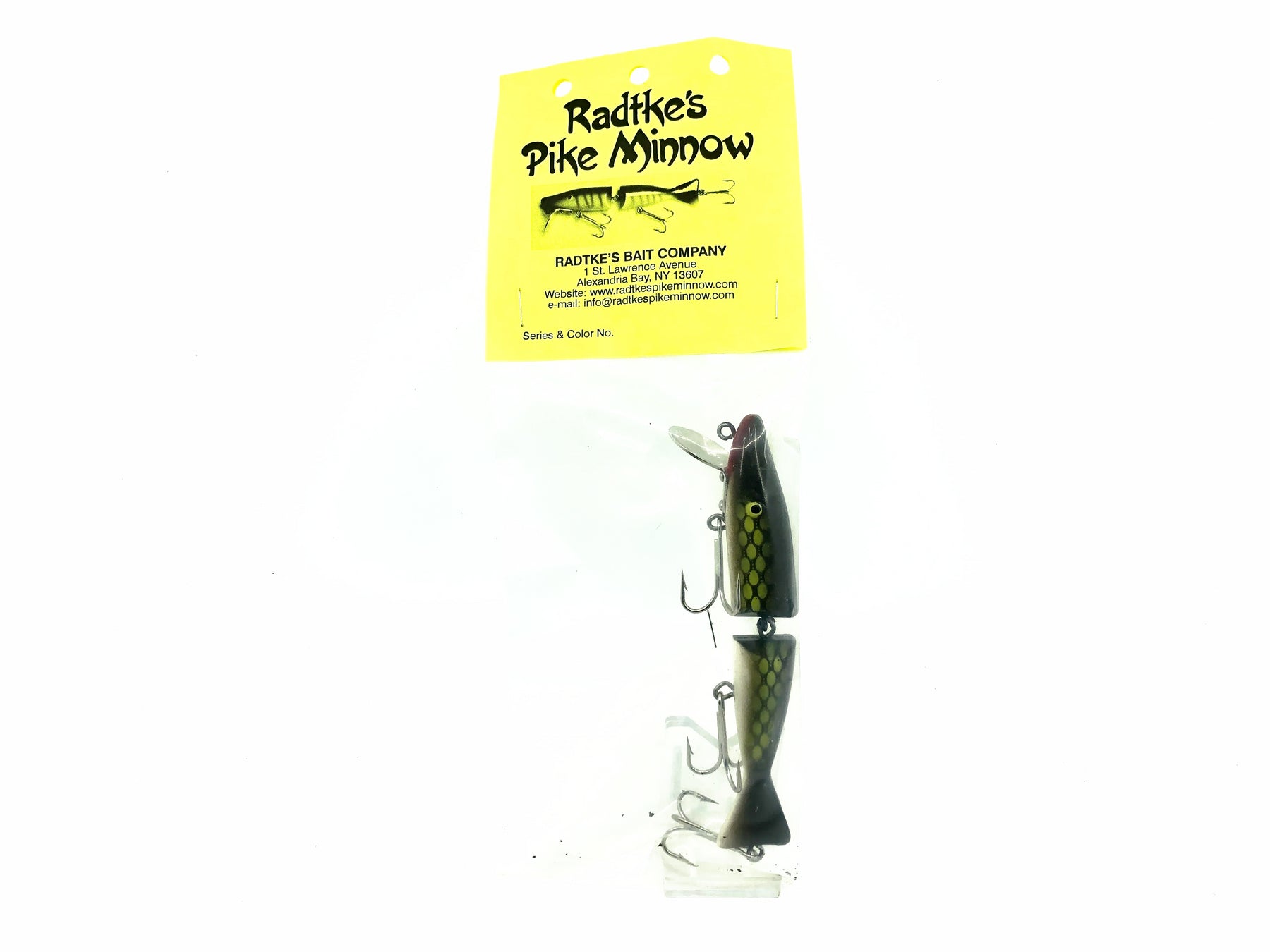 Radtke Pike Minnow, #205 Pikie Color on Card. About 5 1/2" long. Lure is new in packaging and packaging is in good condition. Classic Muskie, Pike, Walleye and Bass lure.  See photos.  Great lure to fish or collect.