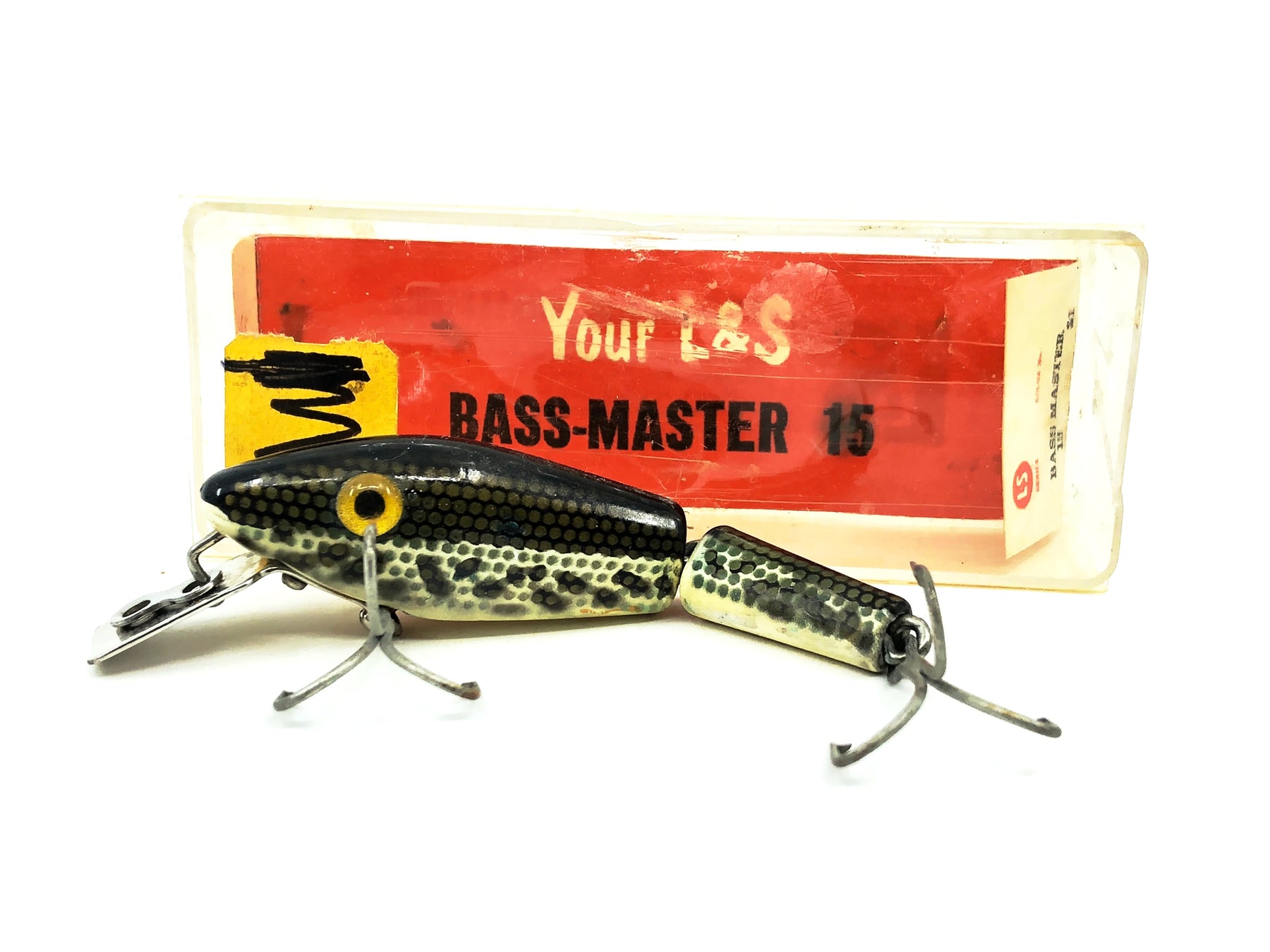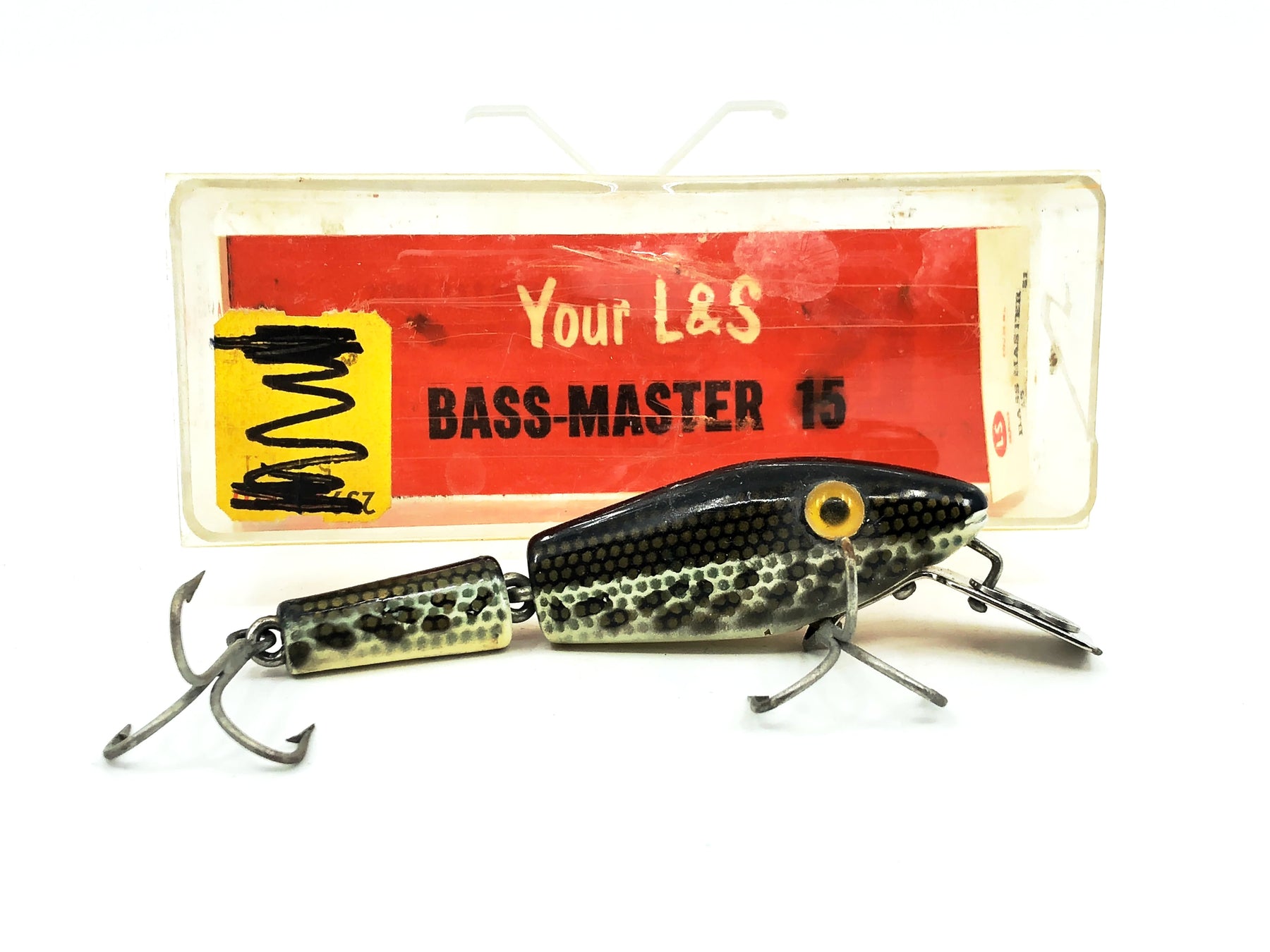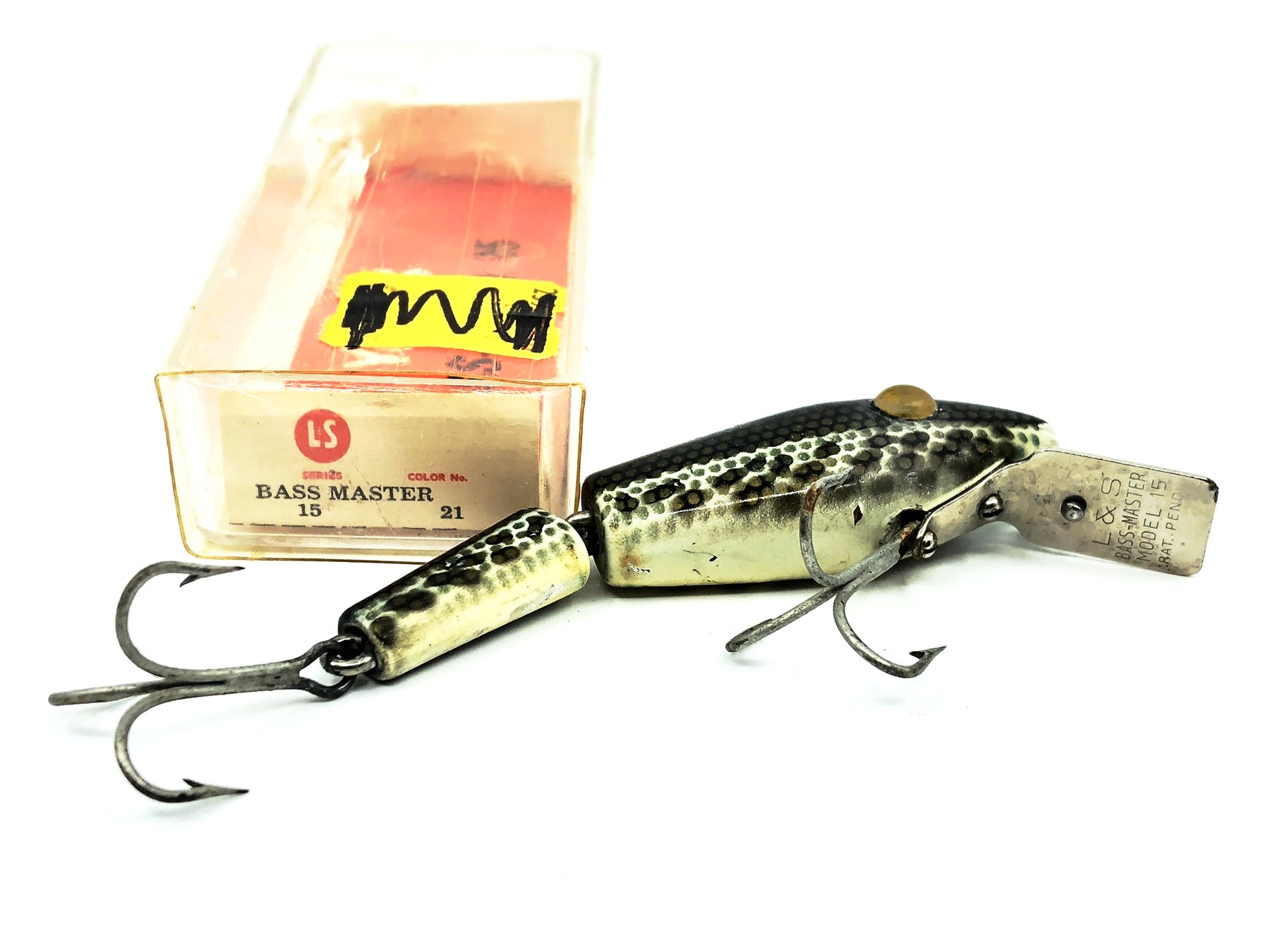 L & S Bass-Master Model 15, #21 White Belly-Black Back/Speckles Color with Box. About 3" long. Lure is great shape, box is in good condition. Overall unique L & S combo. see photos. Fish or collect a classic lure.