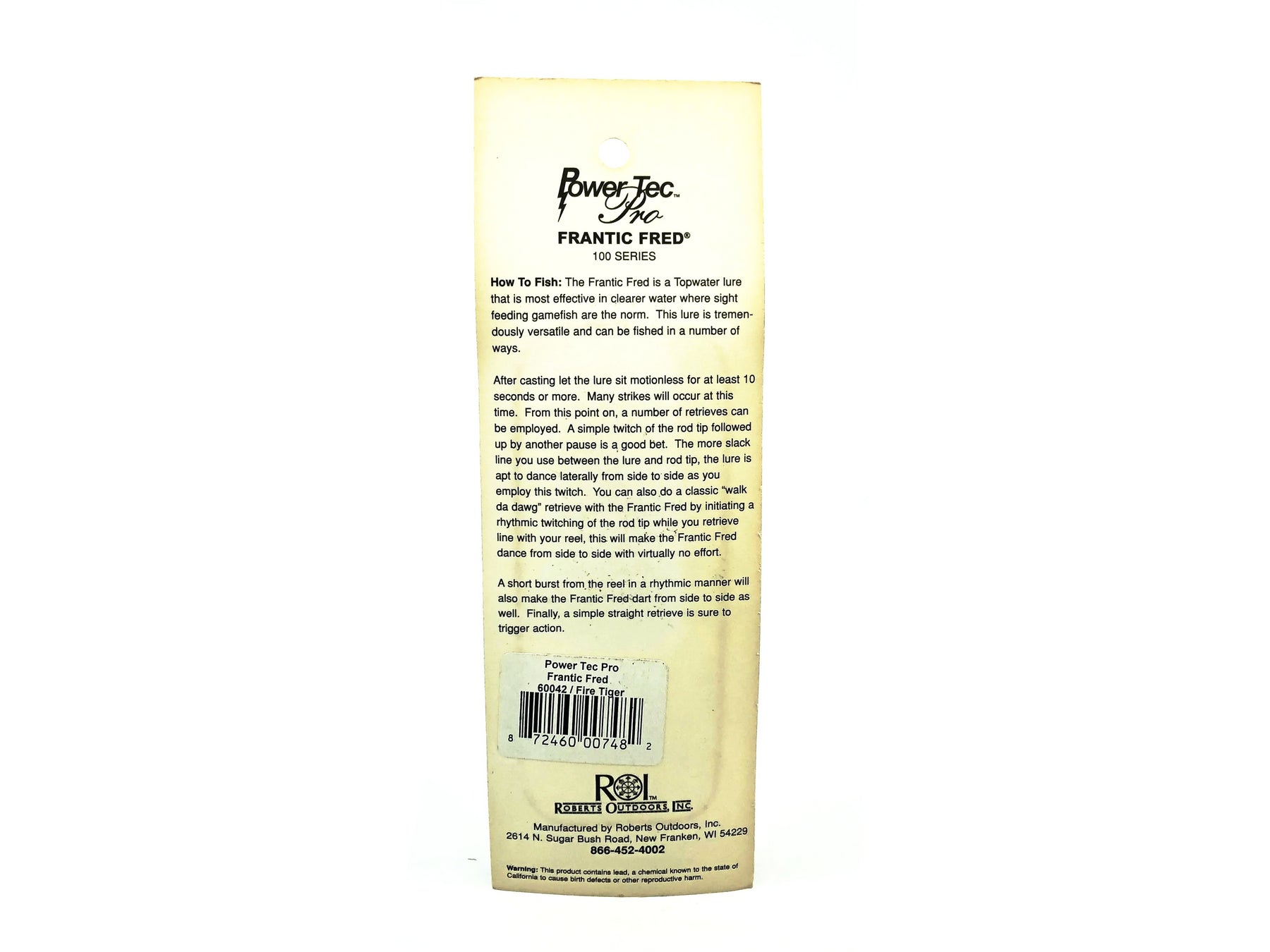Joe Bucher Power Tec Pro Frantic Fred, Fire Tiger Color on Card. Unique bait here. About 4" long. Card is in good condition and the lure is new on card. Fish or collect.