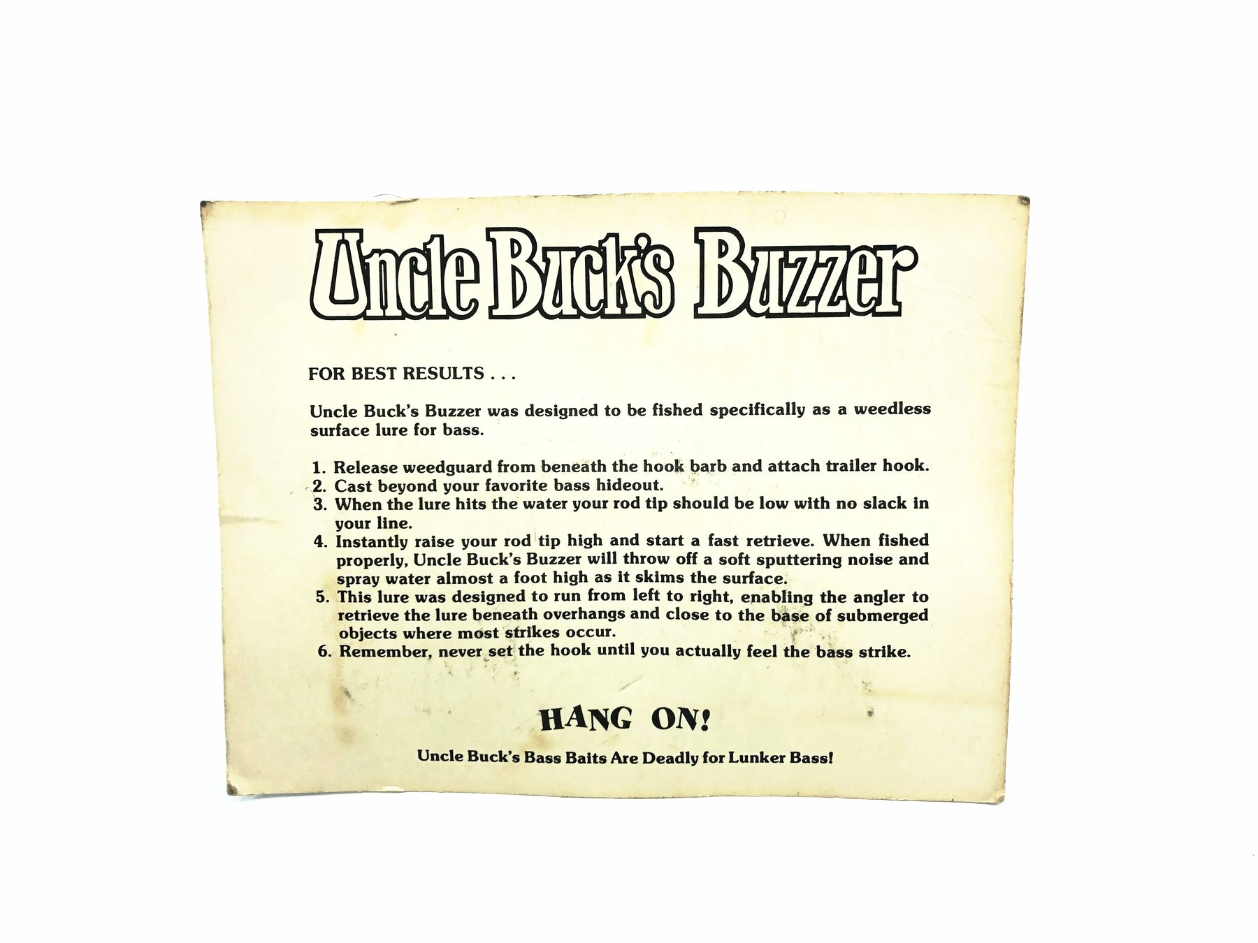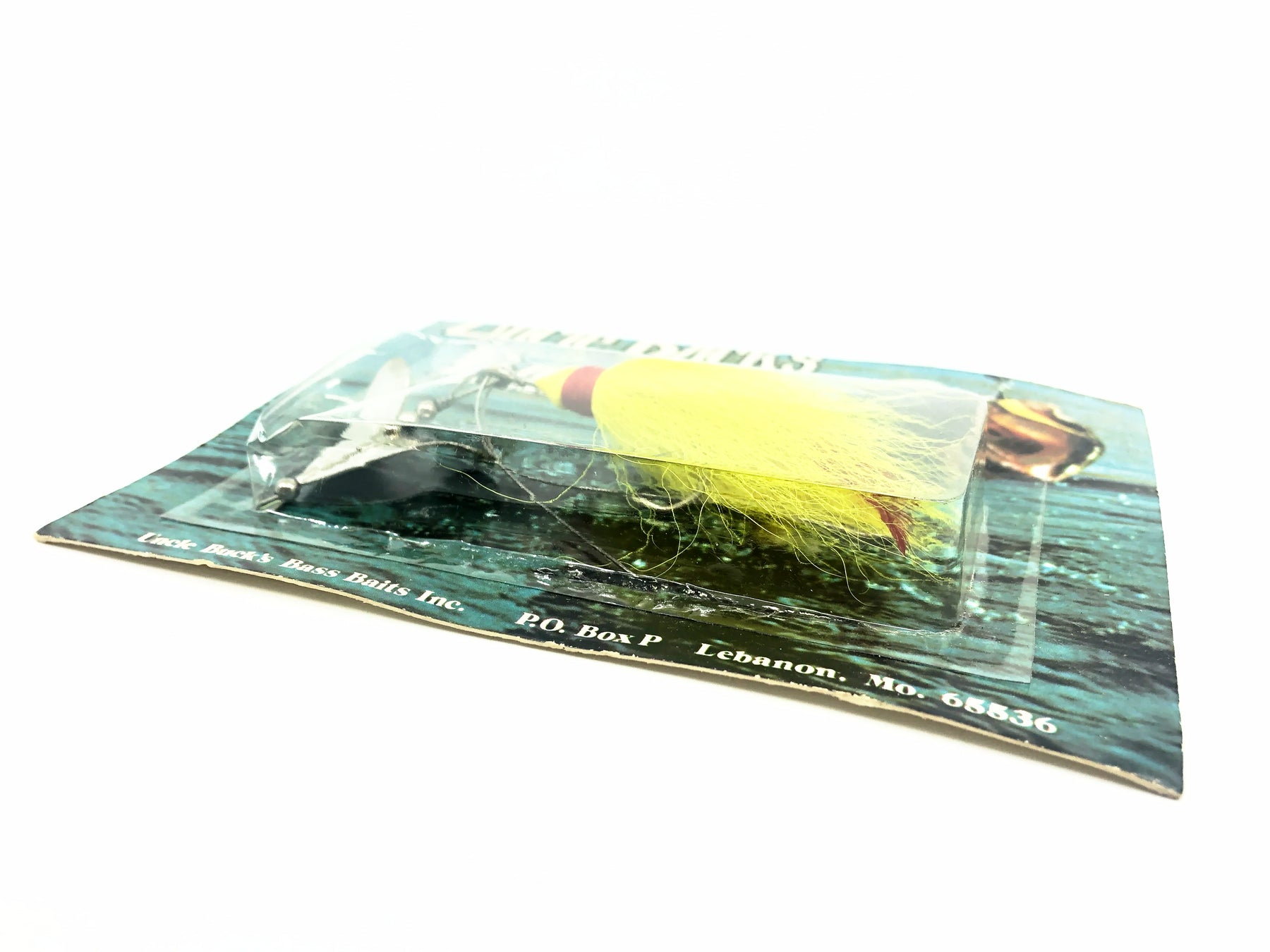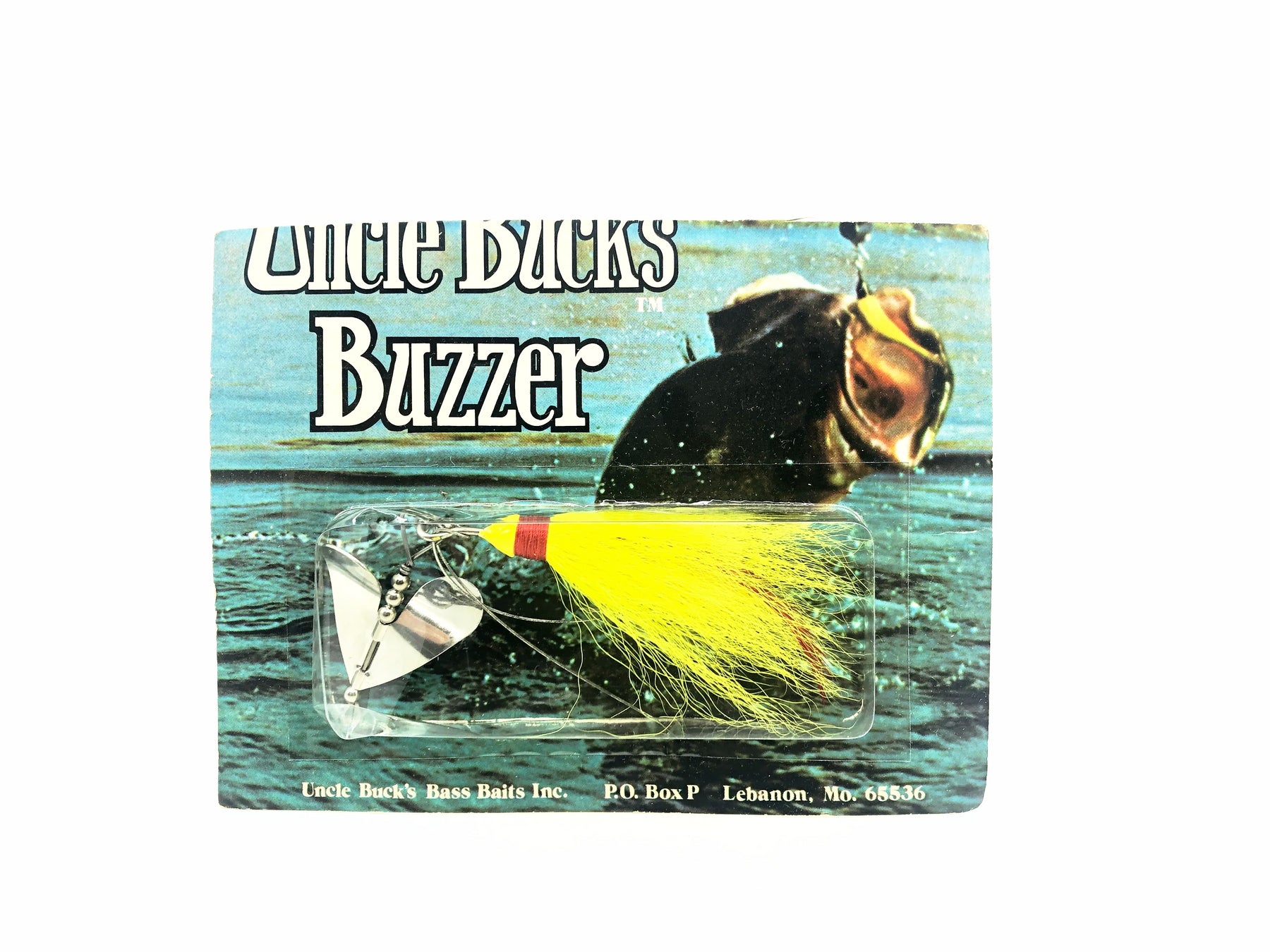 Uncle Bucks Buzzer, Silver Blade/Yellow Tail & Head on Card. Discontinued bait here. Lure is new on card. The card is in good condition aside from some of the top was cut off. See photos.