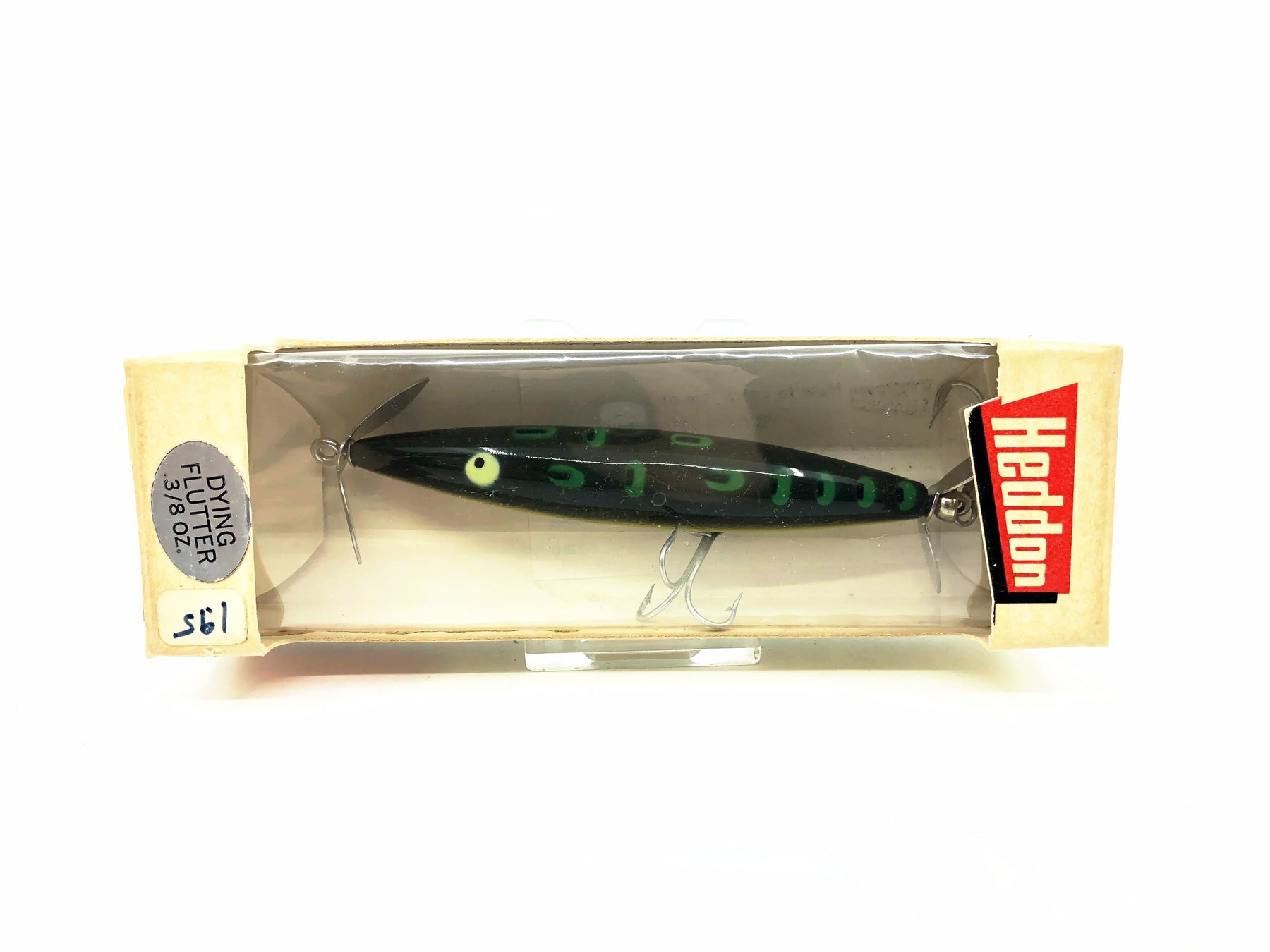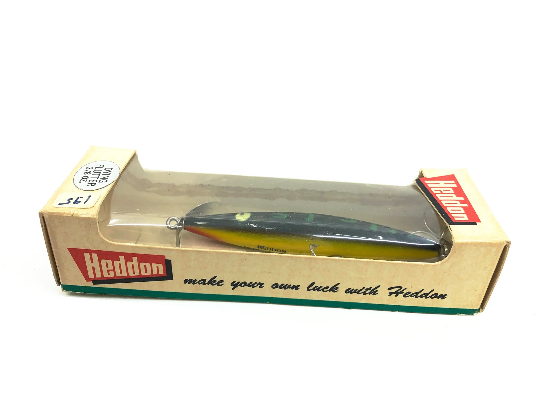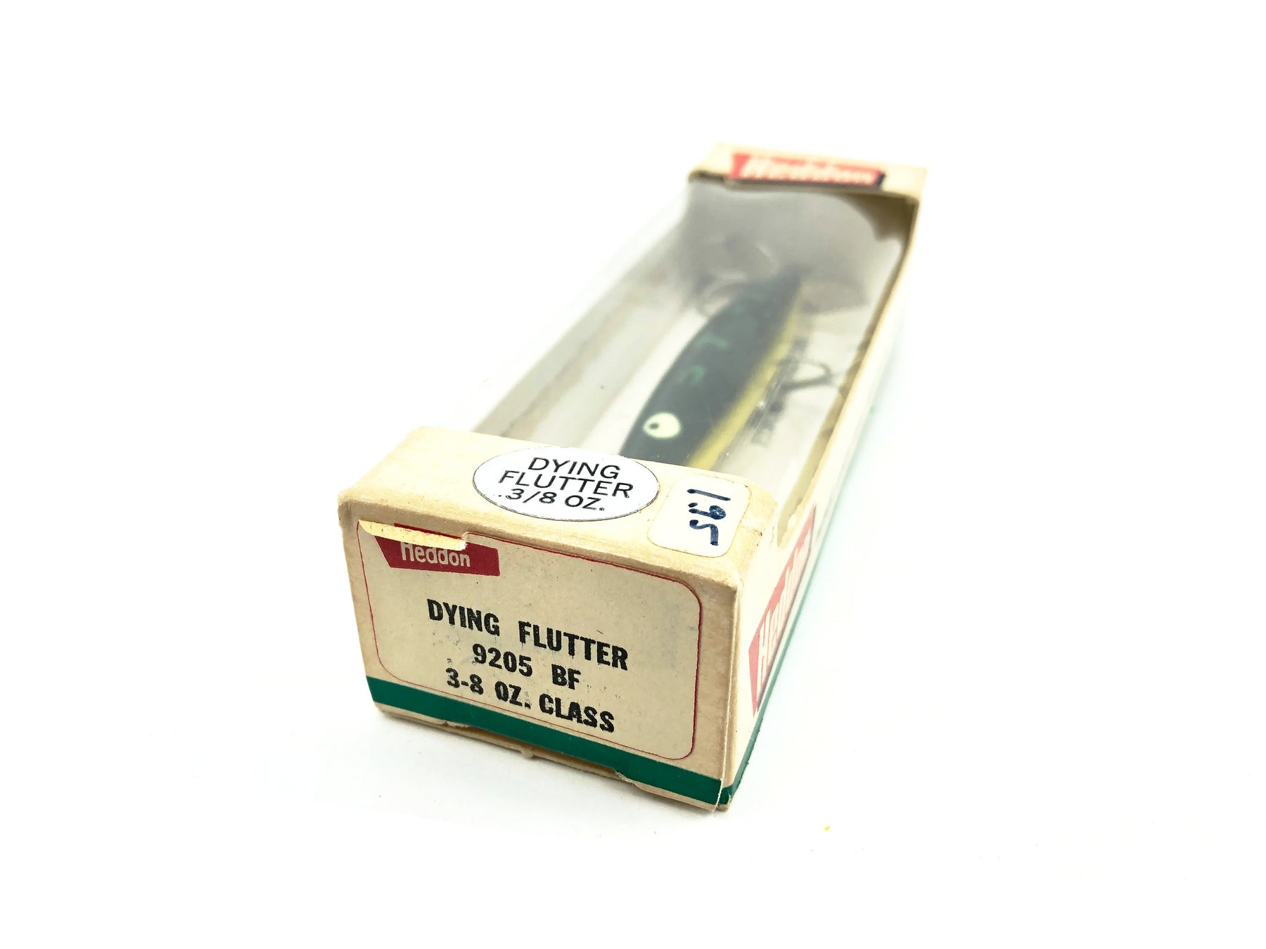 Heddon Dying Flutter, BF Bullfrog Color w/Box. Great Heddon combo here. About 3 3/4" long body. Lure is in new in box, and the box seems to have never been opened. Plastic/spook version. One of the true classic Heddon baits. Fish or collect. See photos.
