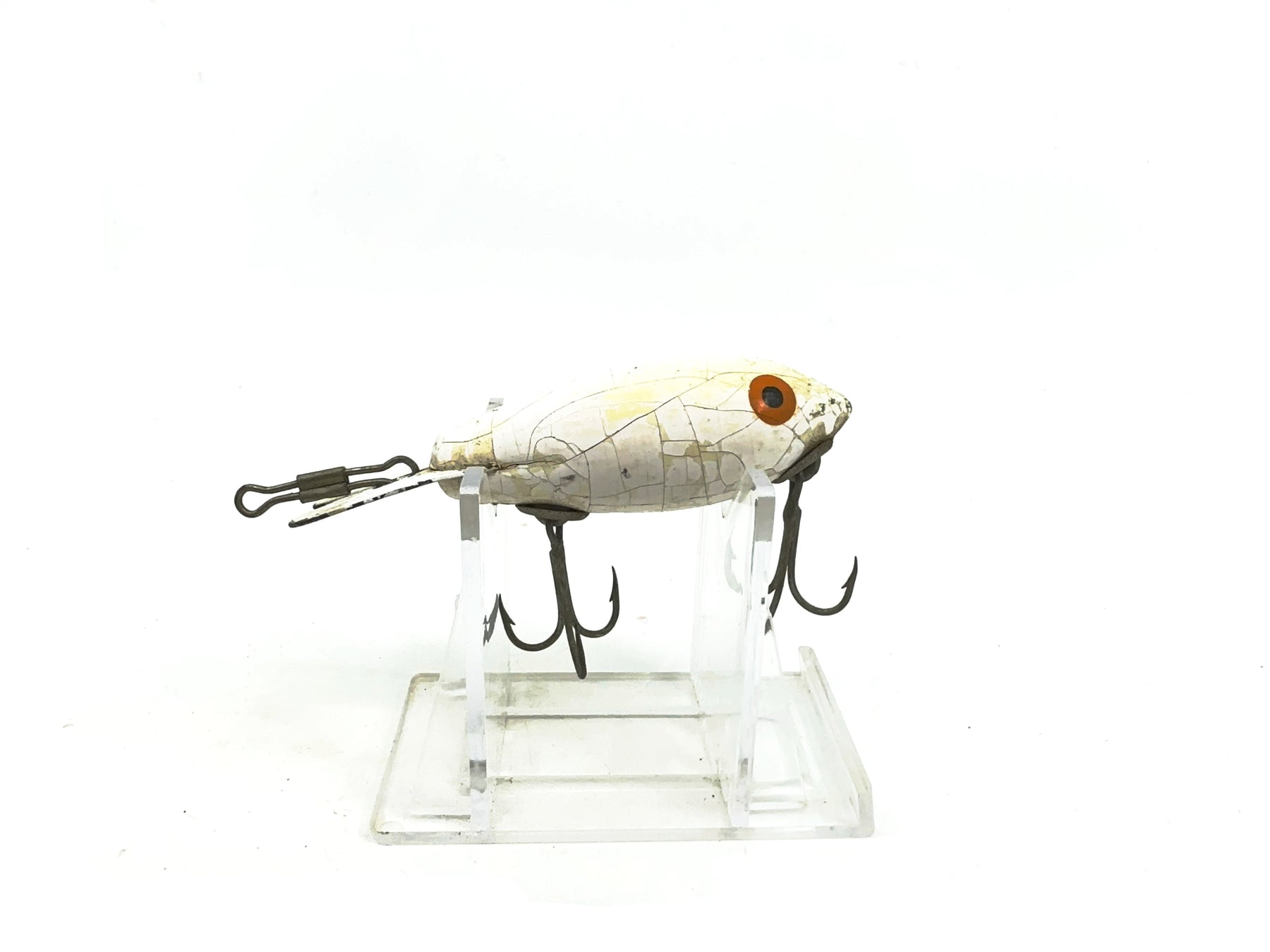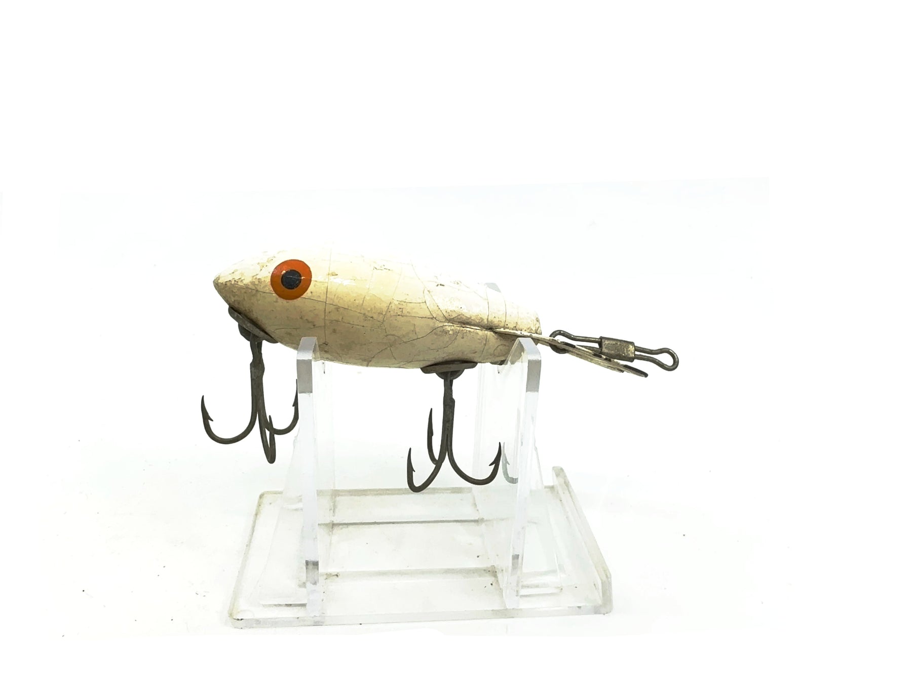 Wooden Bomber 300 Series, #01 White Color. About 3" long. This smaller Bomber is in ok condition with some wear and cracking of the paint. Classic lure that isn't made anymore fish or collect. See photos.
