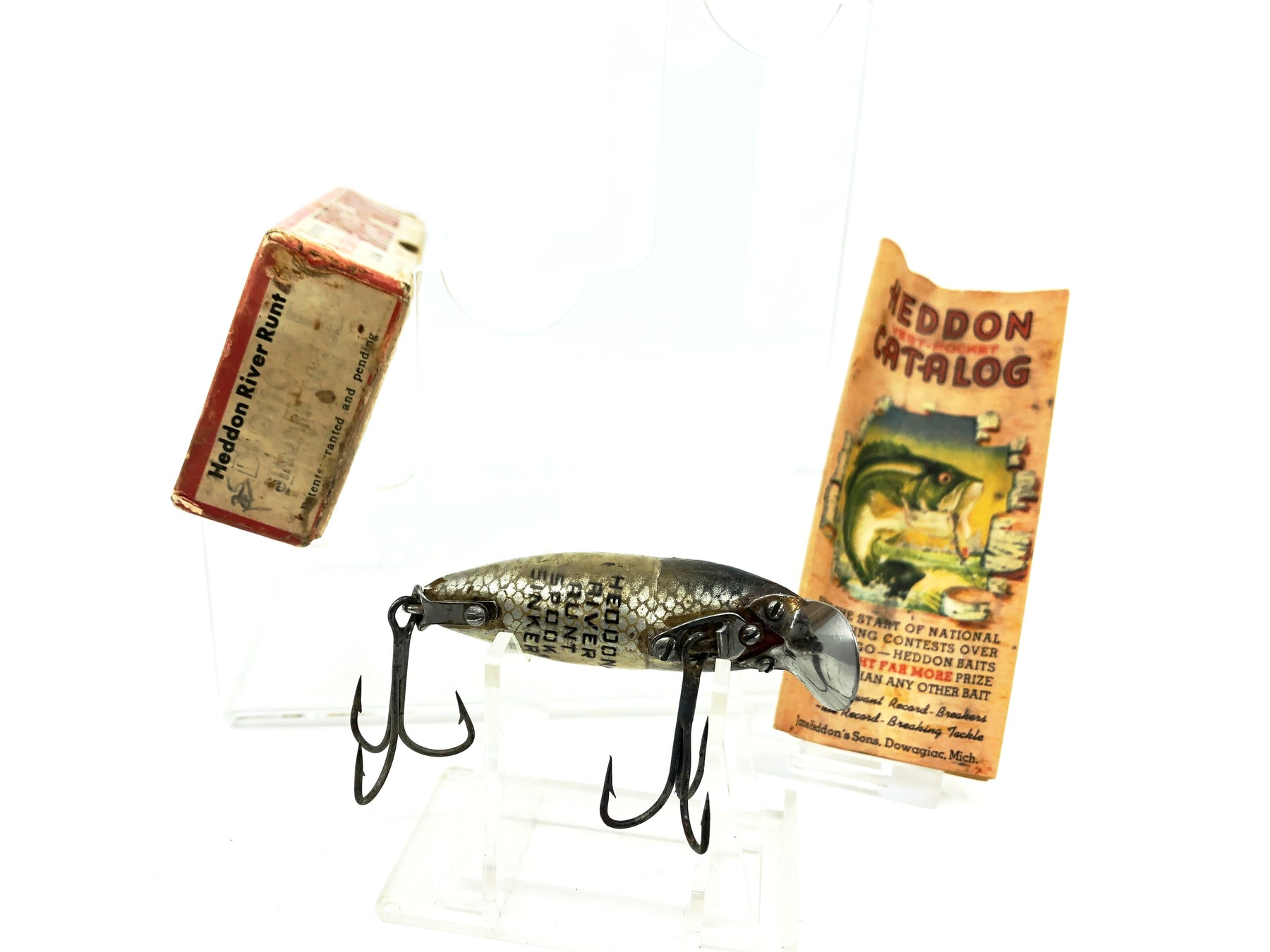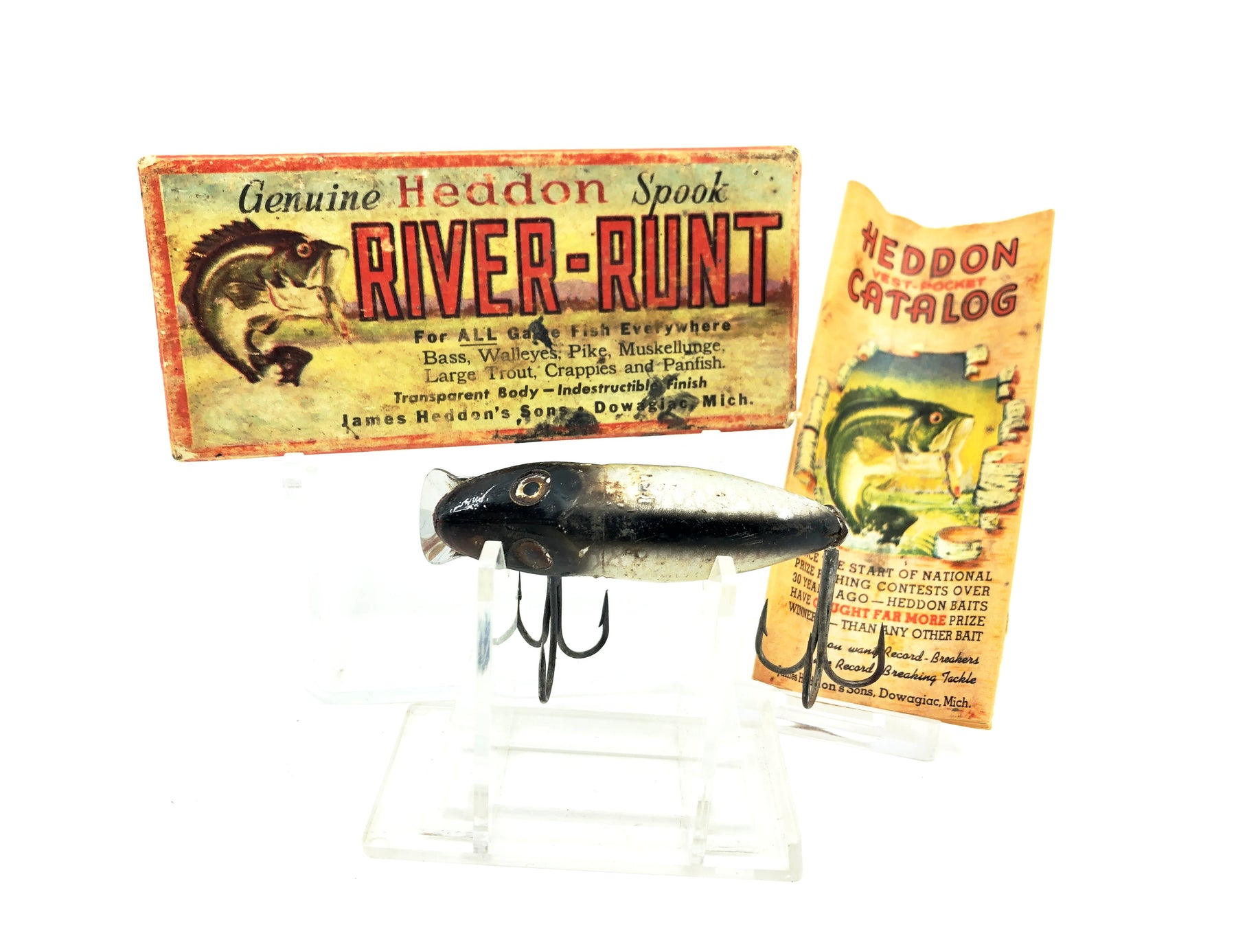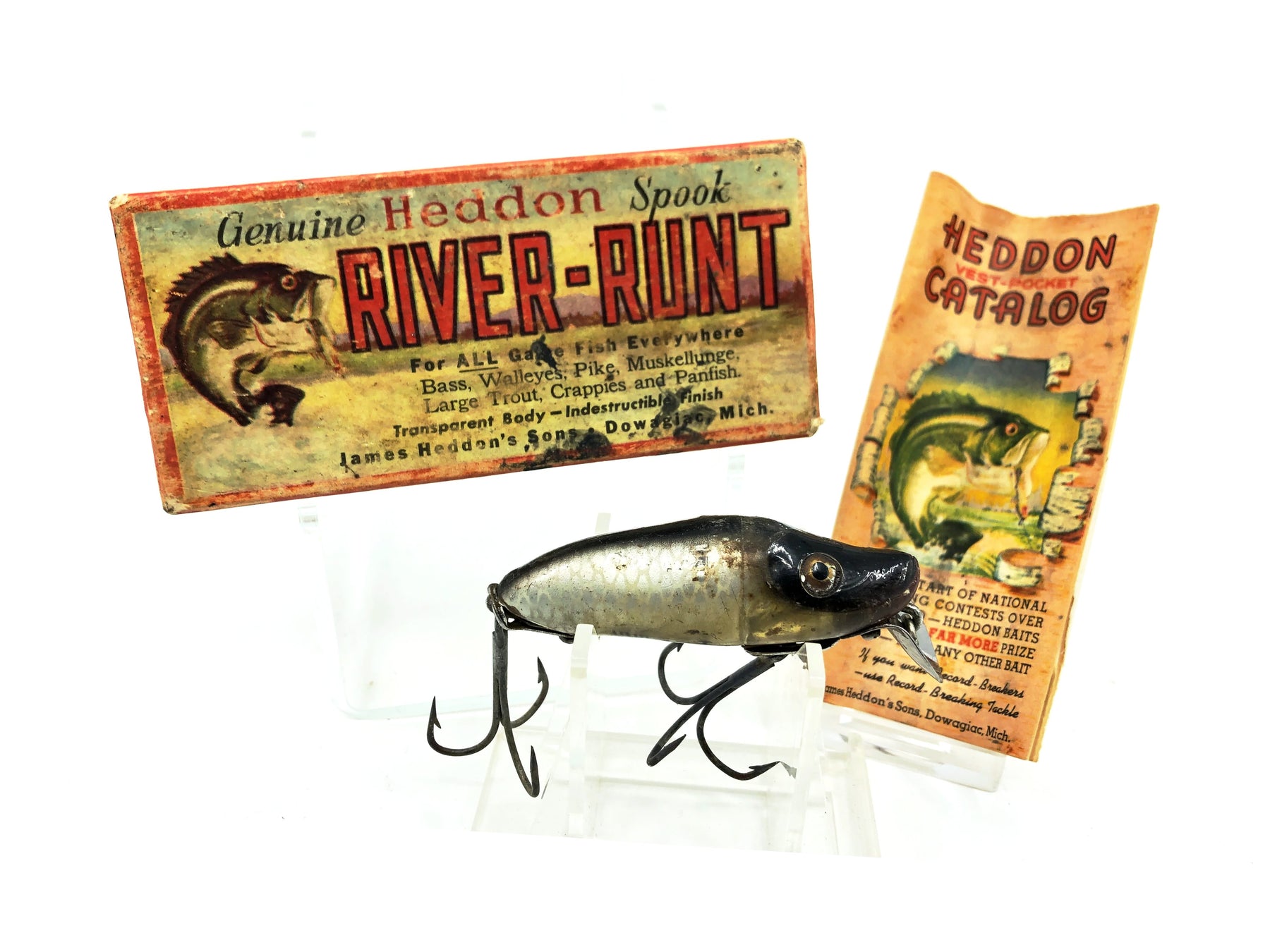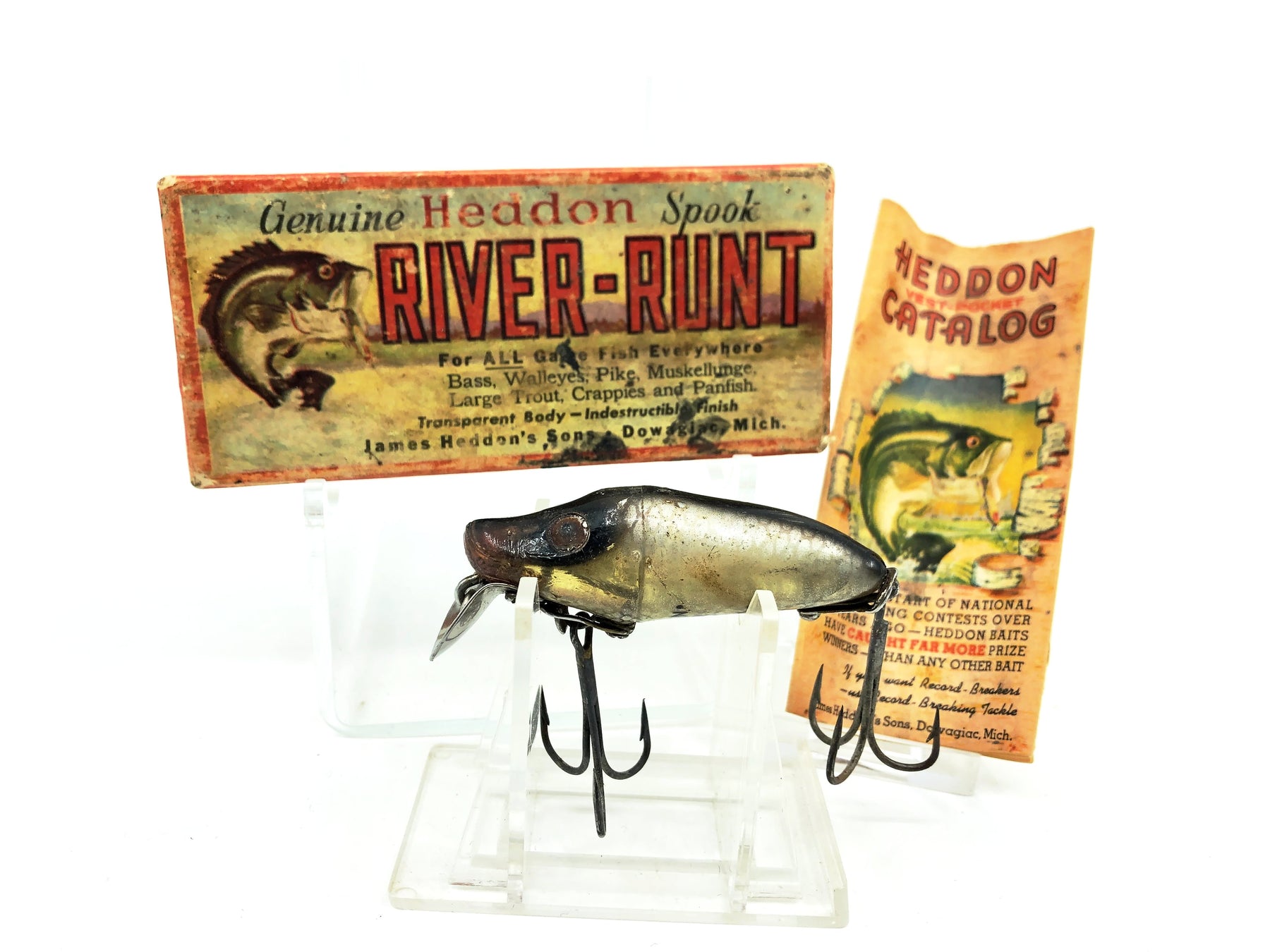 Heddon River Runt Spook Sinker 9110-P, Shiner Color with Box/Catalogue. Box is for a River Runt Go-Deeper in XRY. Runt matches boxes age. Has 1st gen hardware. About 2 1/2" long. Used lure with some wear and deforming of the body due to unstability of plastic over time. Box in ok condition with some wear. Box dates from 1946-1956. Matches lure. Includes matching box catalogue. Despite wear, still a nice combo overall. See photos. One of the most iconic fishing lures of all time. Collect or fish you can't go wrong with a Heddon River Runt.