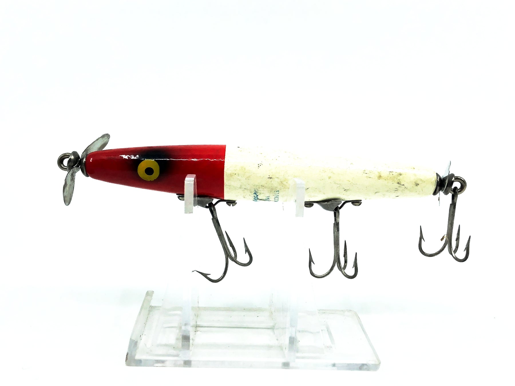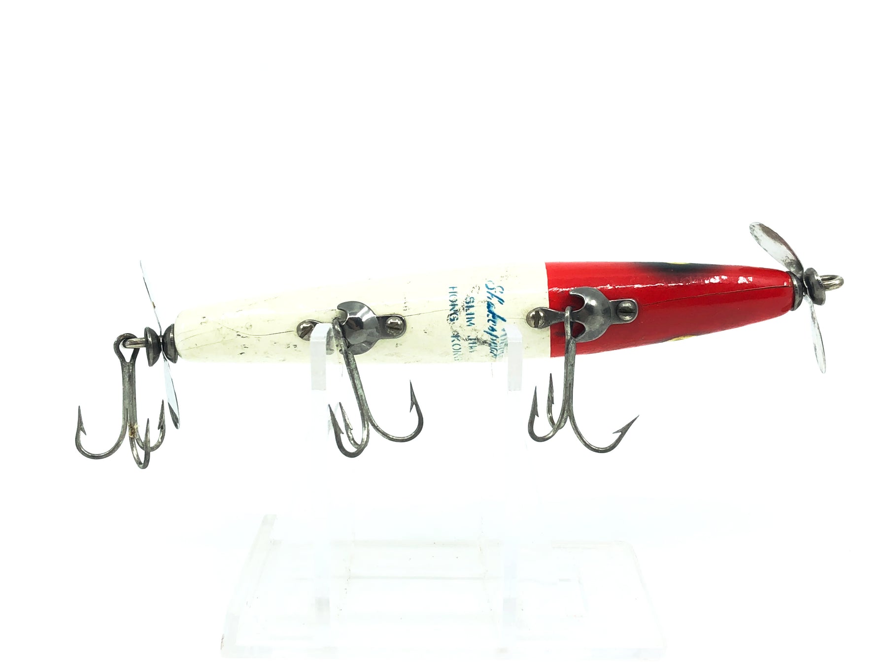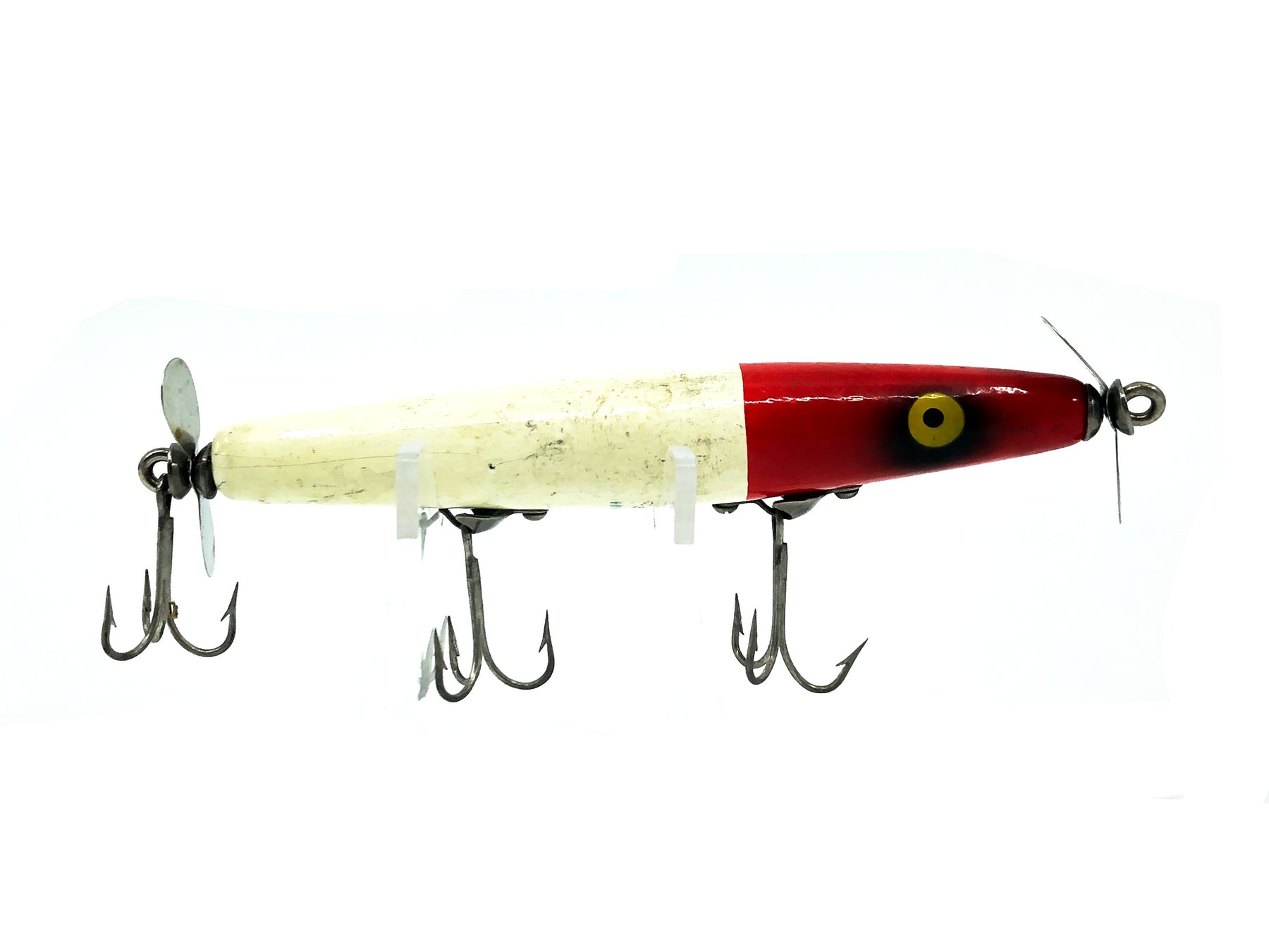 Shakespeare Slim Jim Vintage Wooden, Red Head/White. Newer Hong Kong Shakespeare here. About 3 7/8" long body. Lure is used with some minor wear and marks but in overall good condition. Fish or collect.