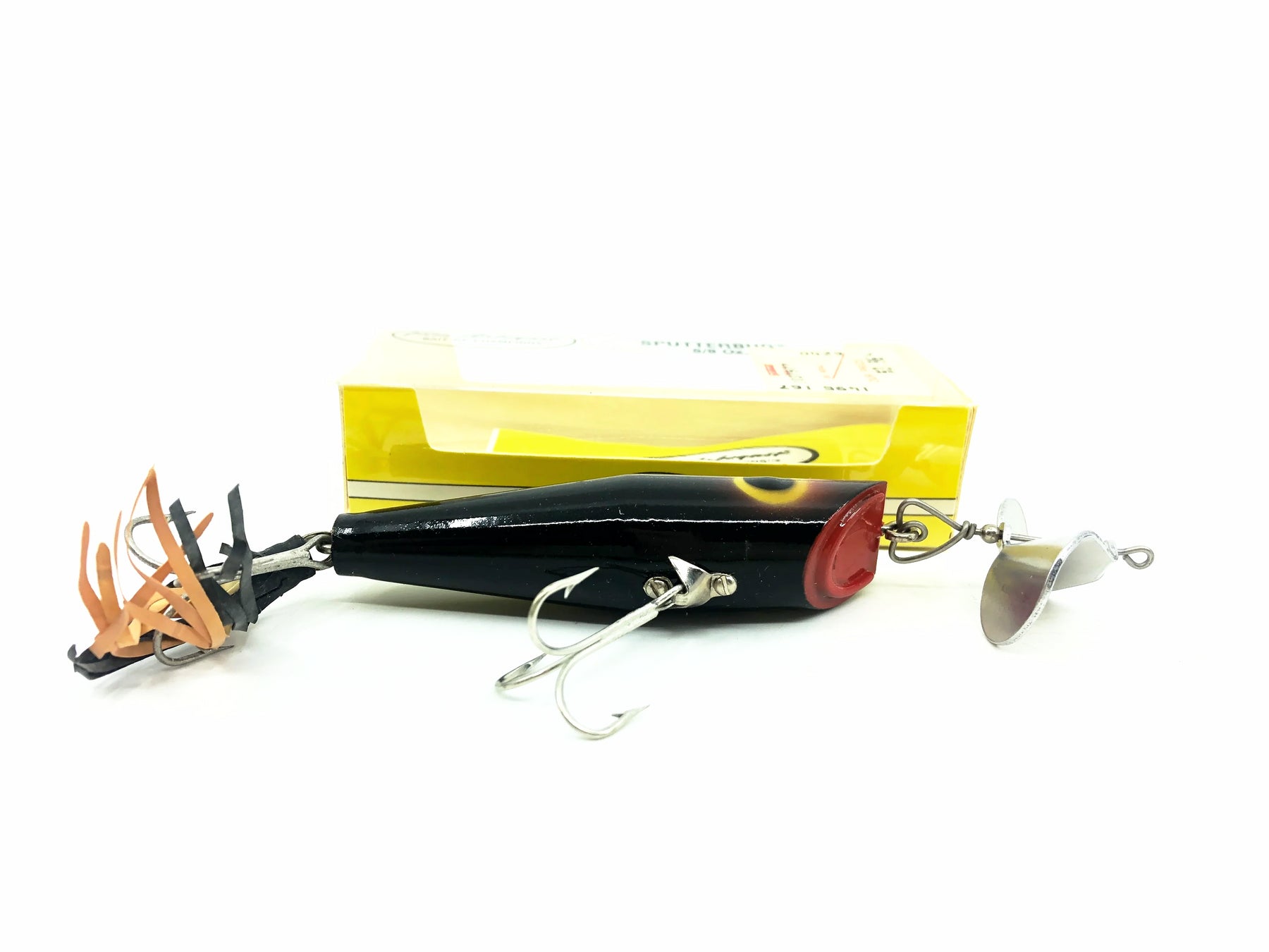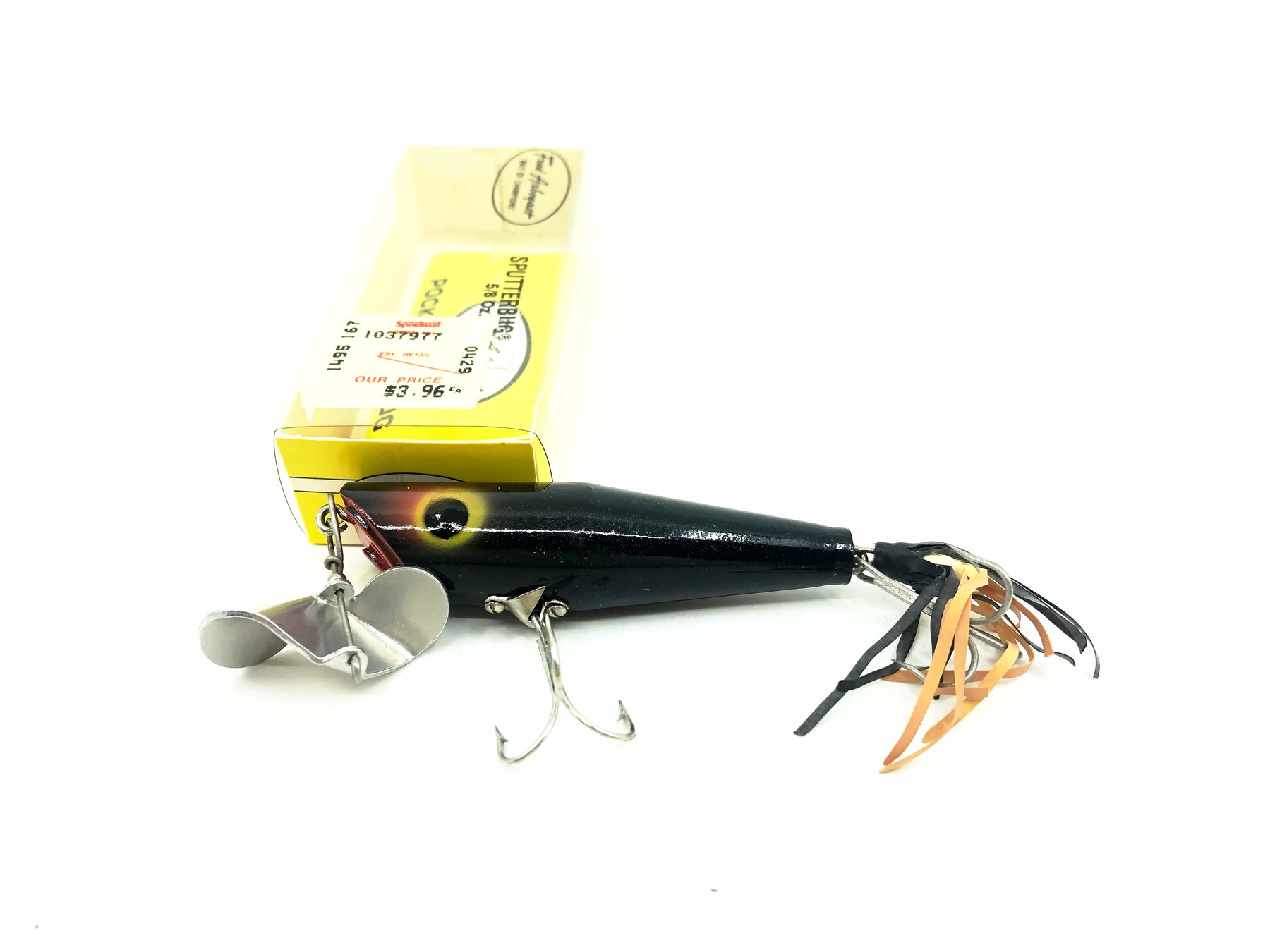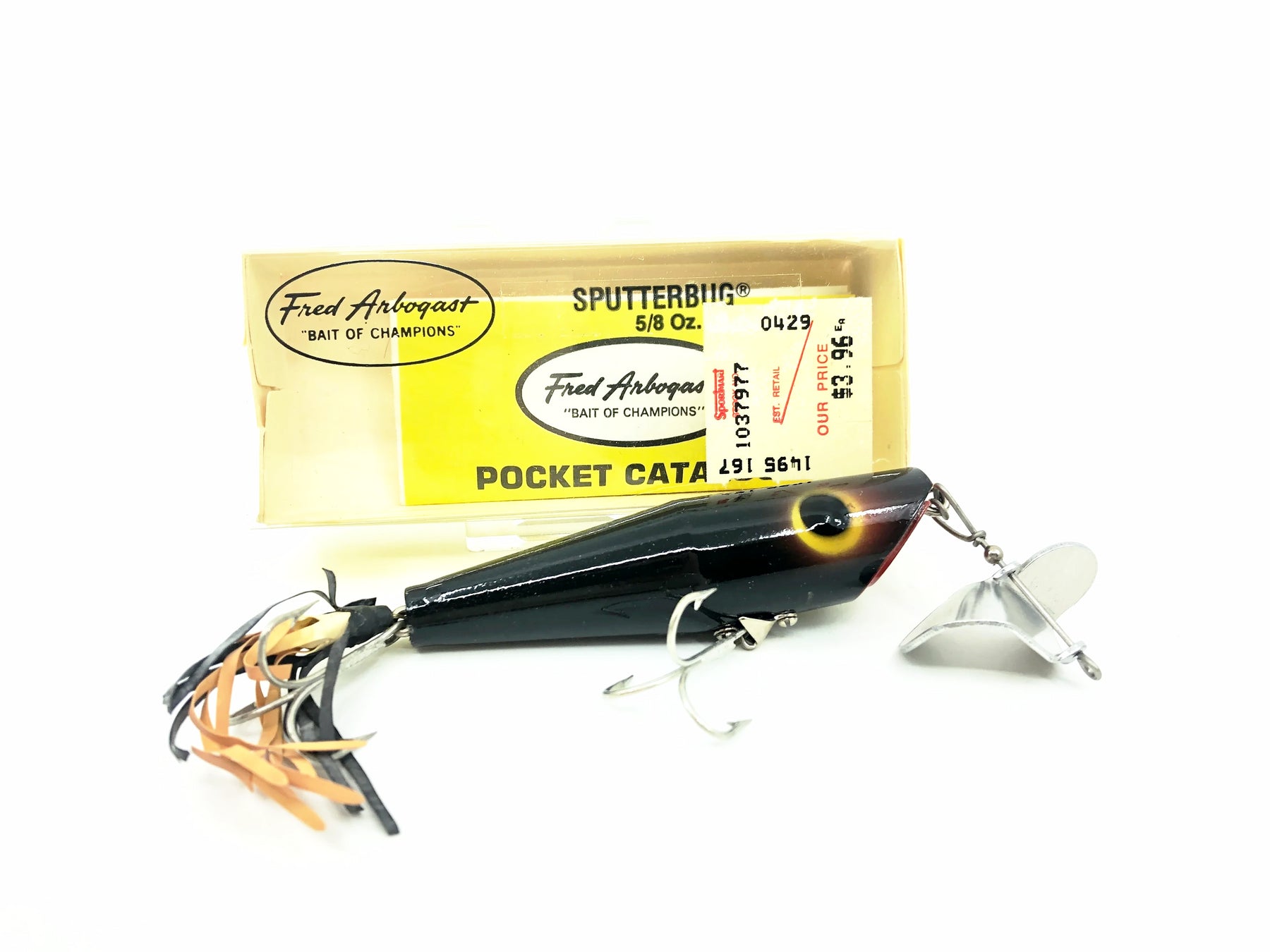 Arbogast Sputterbug, Black Color w/Box. Great discontinued Arbogast bait here. Body of lure about 3 1/4" long. This bait is new in box and the box is in overall good condition. The skirt is very brittle however. Collect or fish this one.