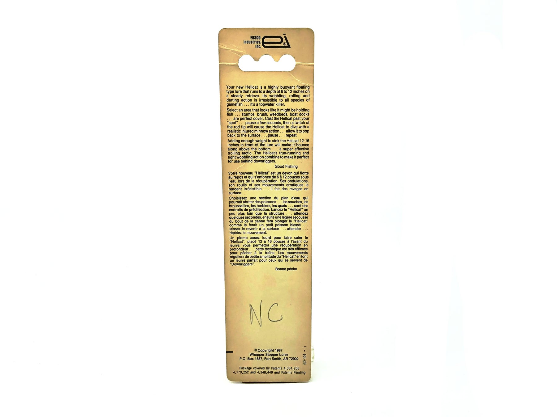Whopper Stopper Hellcat, Black Back/Gold/Orange Belly Color on Card. About 4 1/2" long. Lure is new in packaging and the card is in good condition aside from some minor uv fading. Fish or collect. See photos.