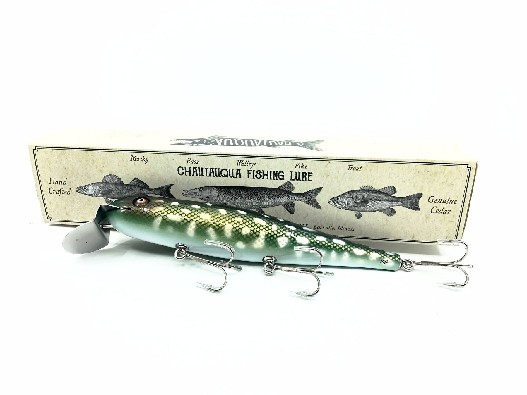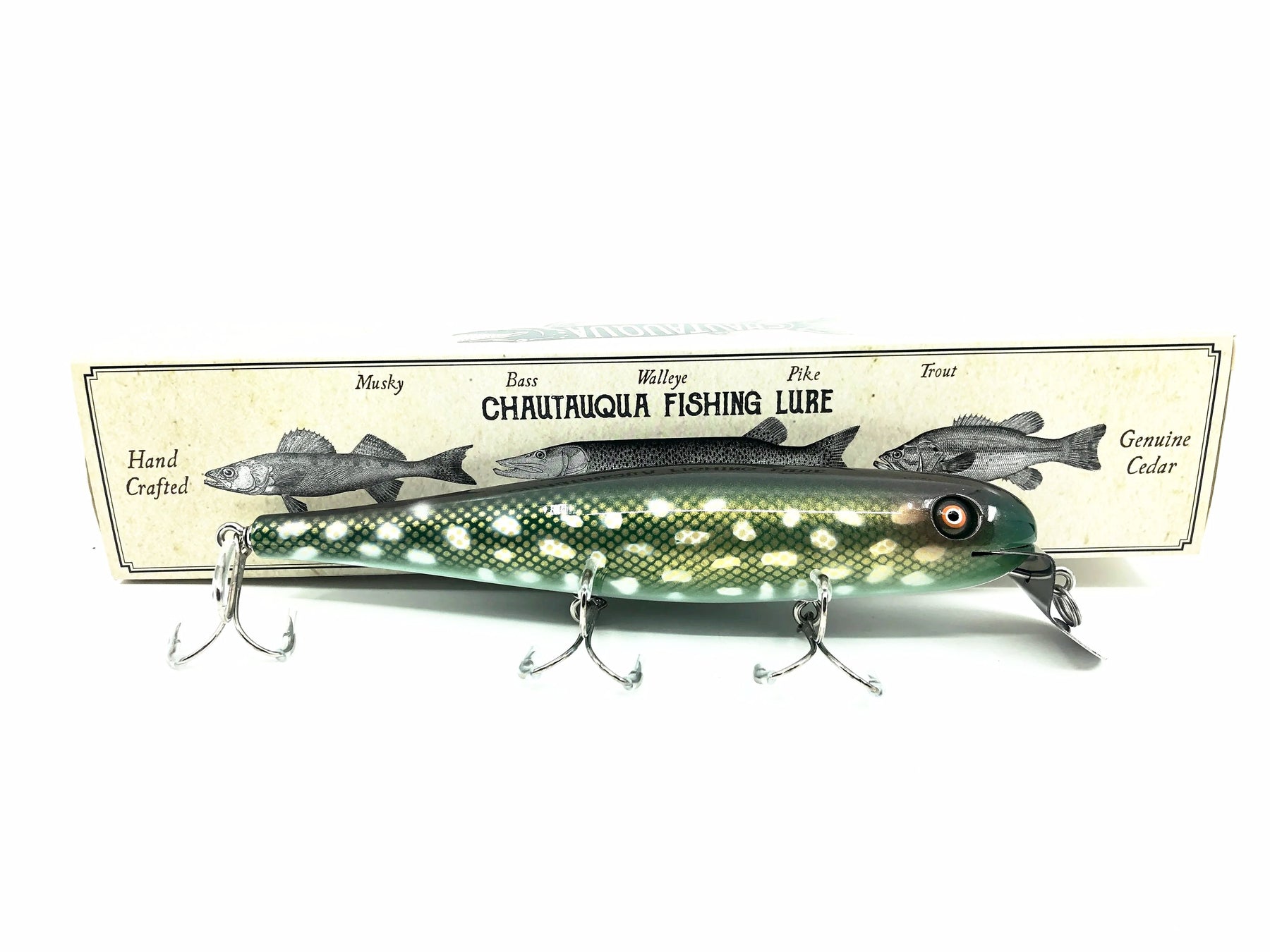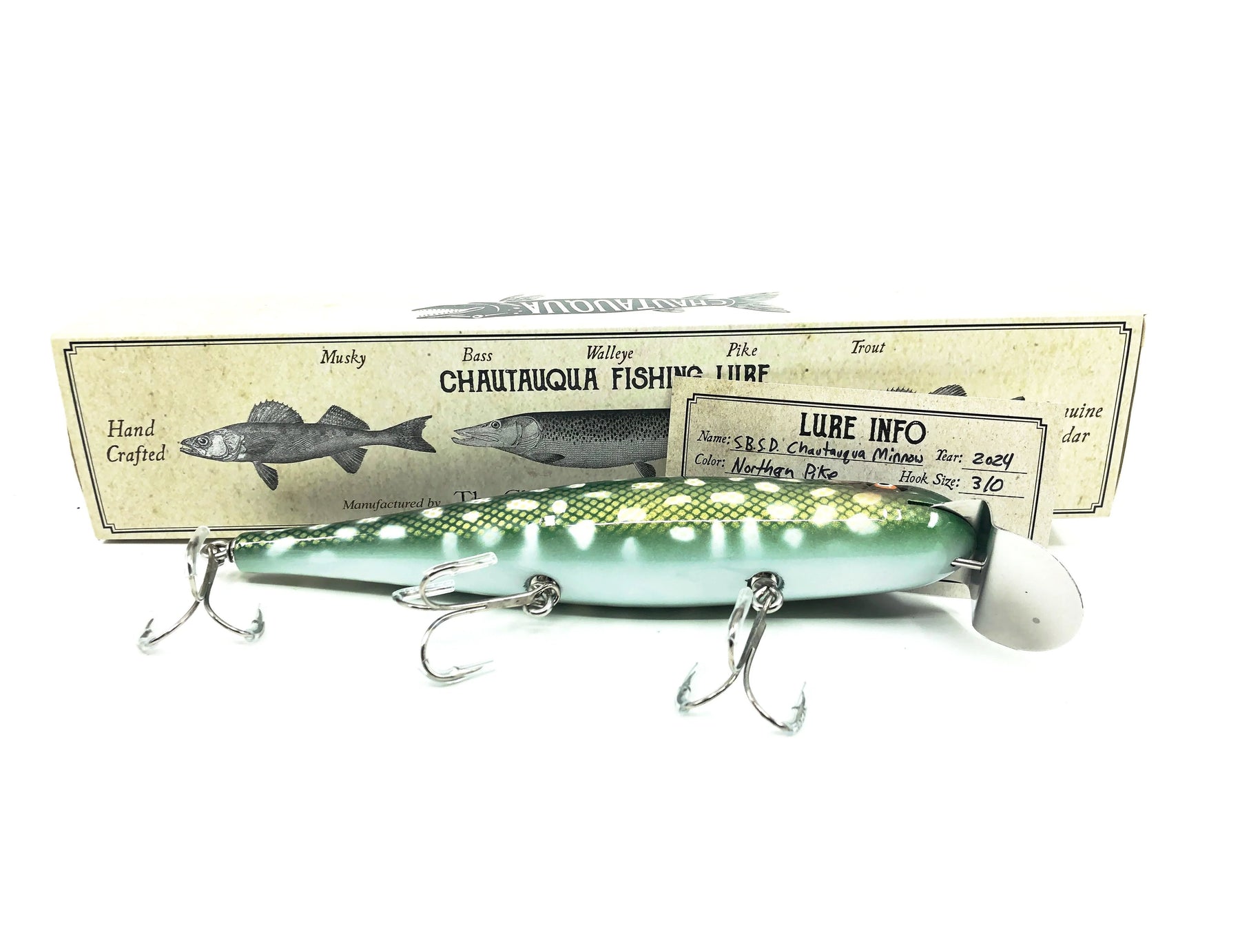 Hand crafted by The Chautauqua Bait Company and delivered in a two piece cardboard box. In my opinion the closest thing you will find to the old Creek Chub lures. High quality and simply amazing. Great to fish and equally great to display. (Hook tubing for safety during shipping. Please remove prior to fishing.)