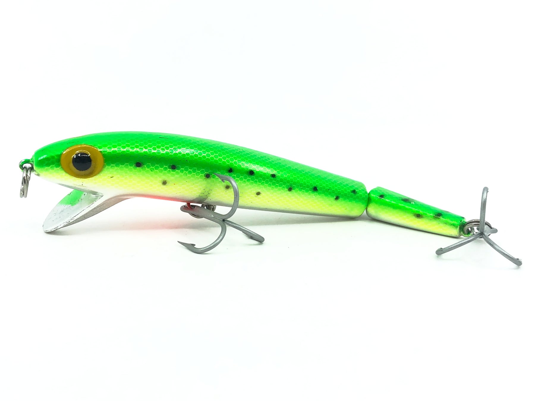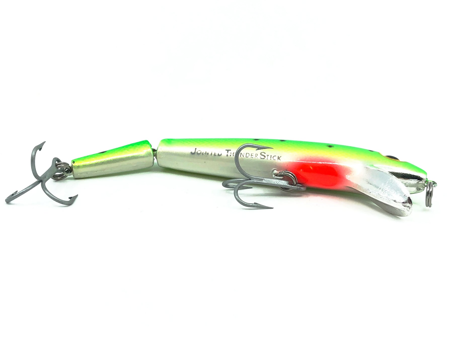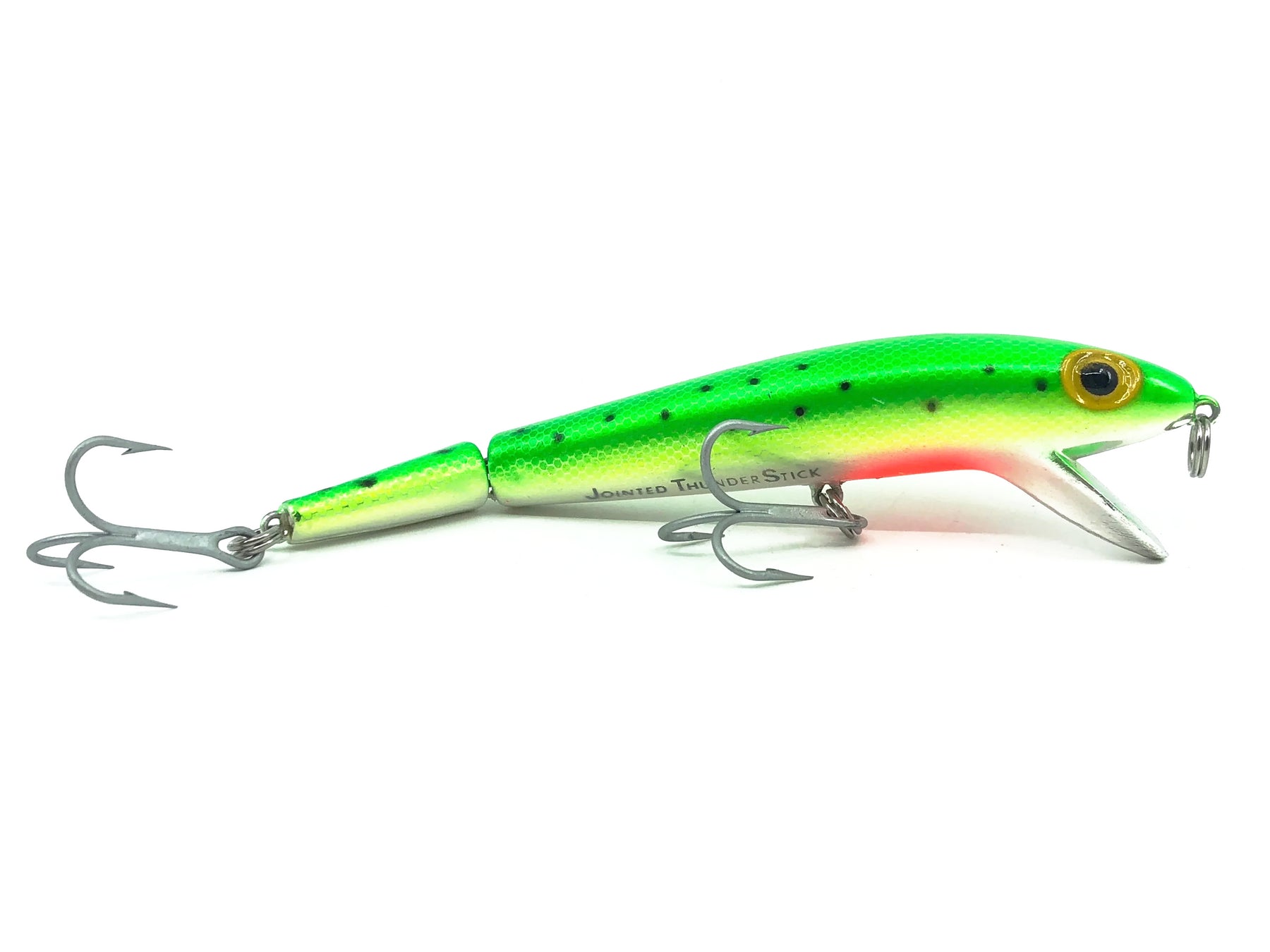 Storm Jointed Thunder Stick JBJ, #122 Metallic Hot Green Specks Color. Great lure here in a desirable pre-Rapala Storm color. Lure is about 5 1/4" long and weighs 5/8oz. Lure is used with some minor wear but in overall great condition. Fish or collect. See photos.