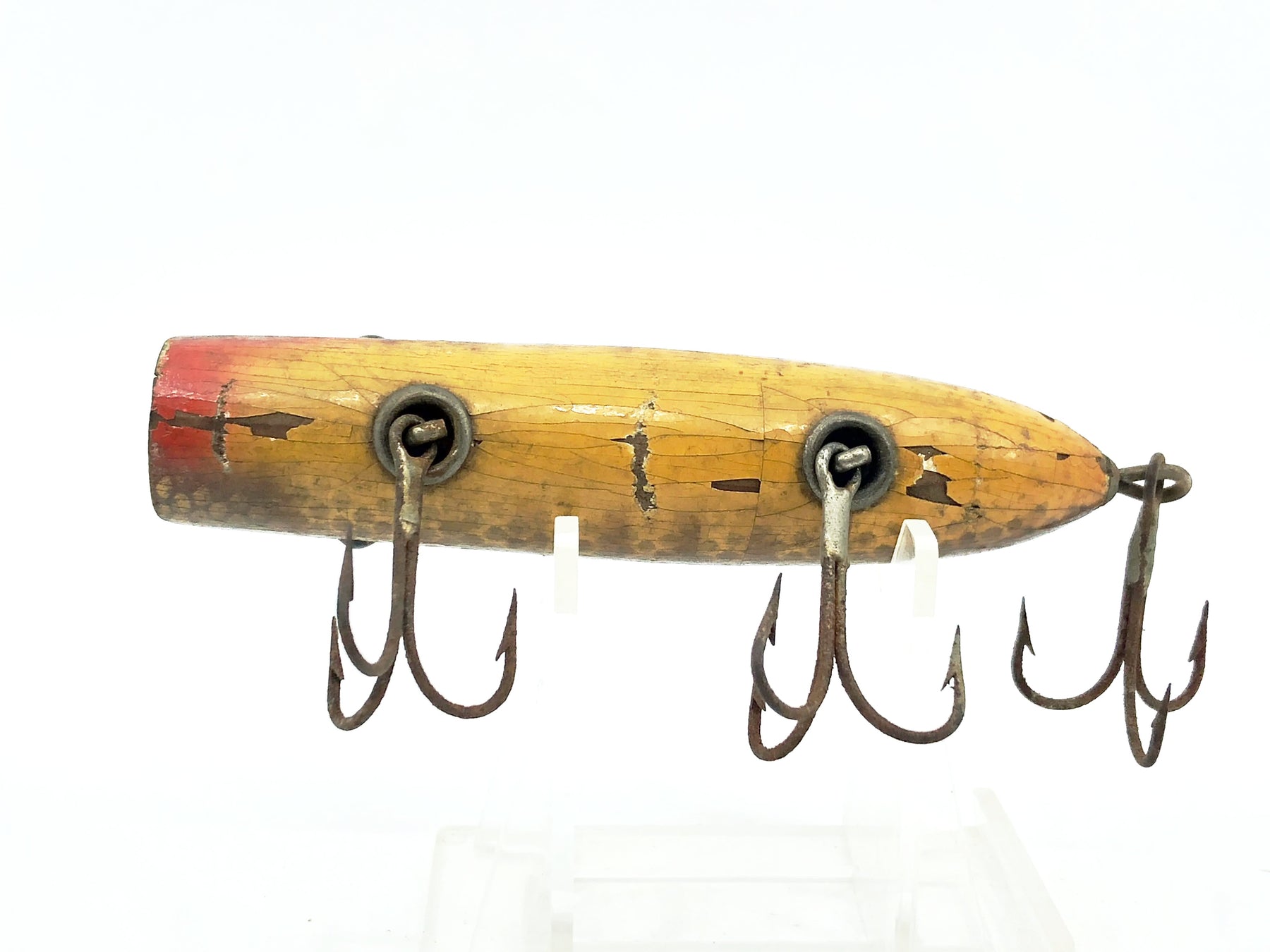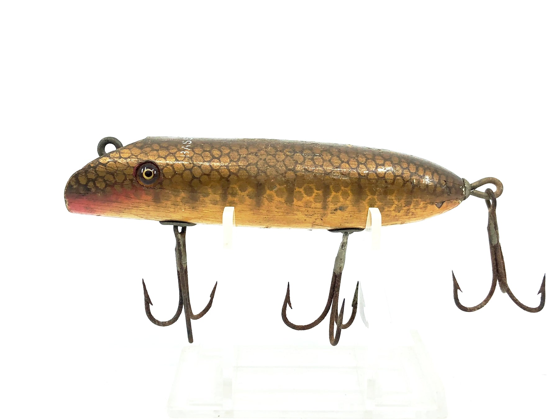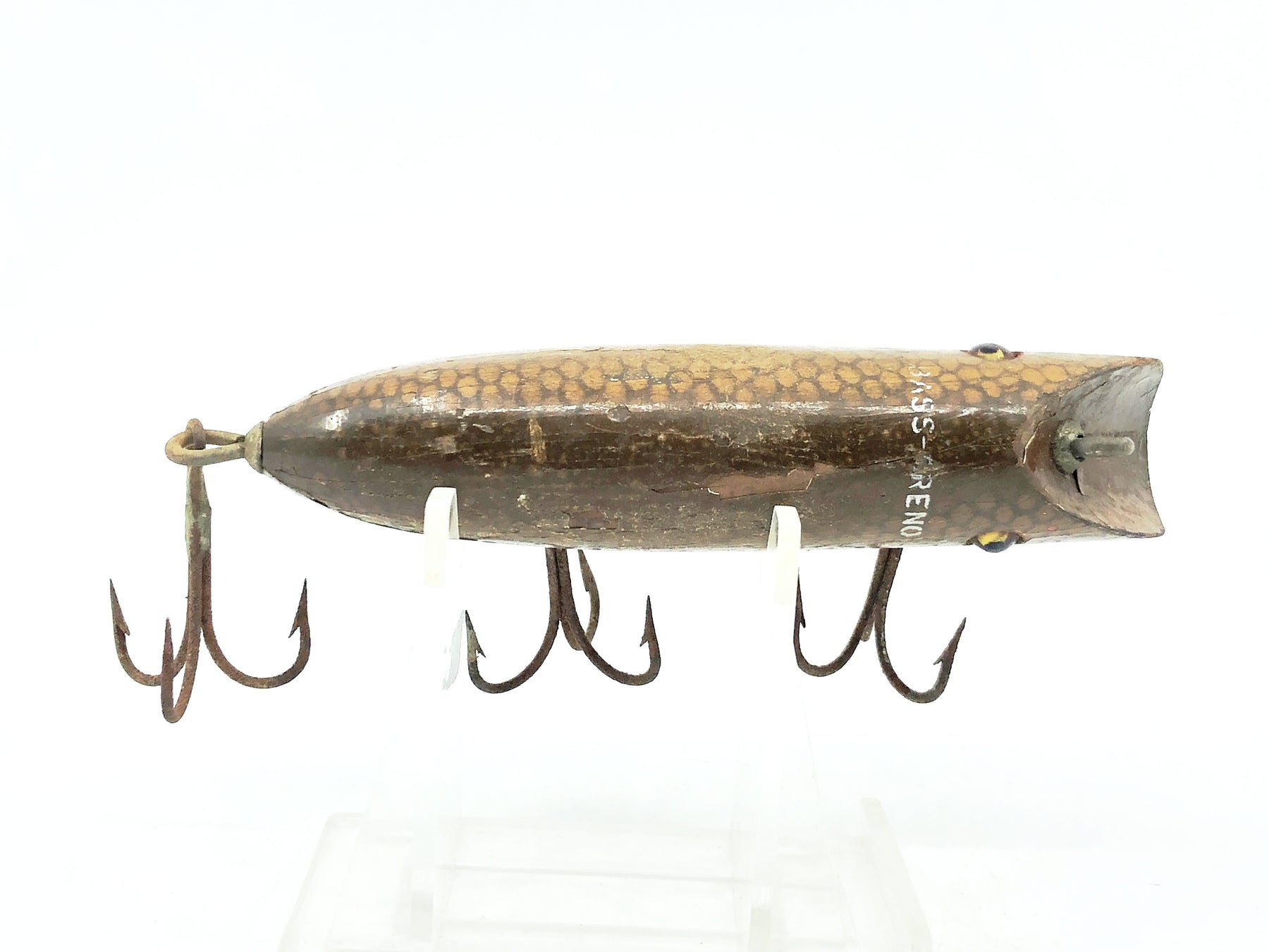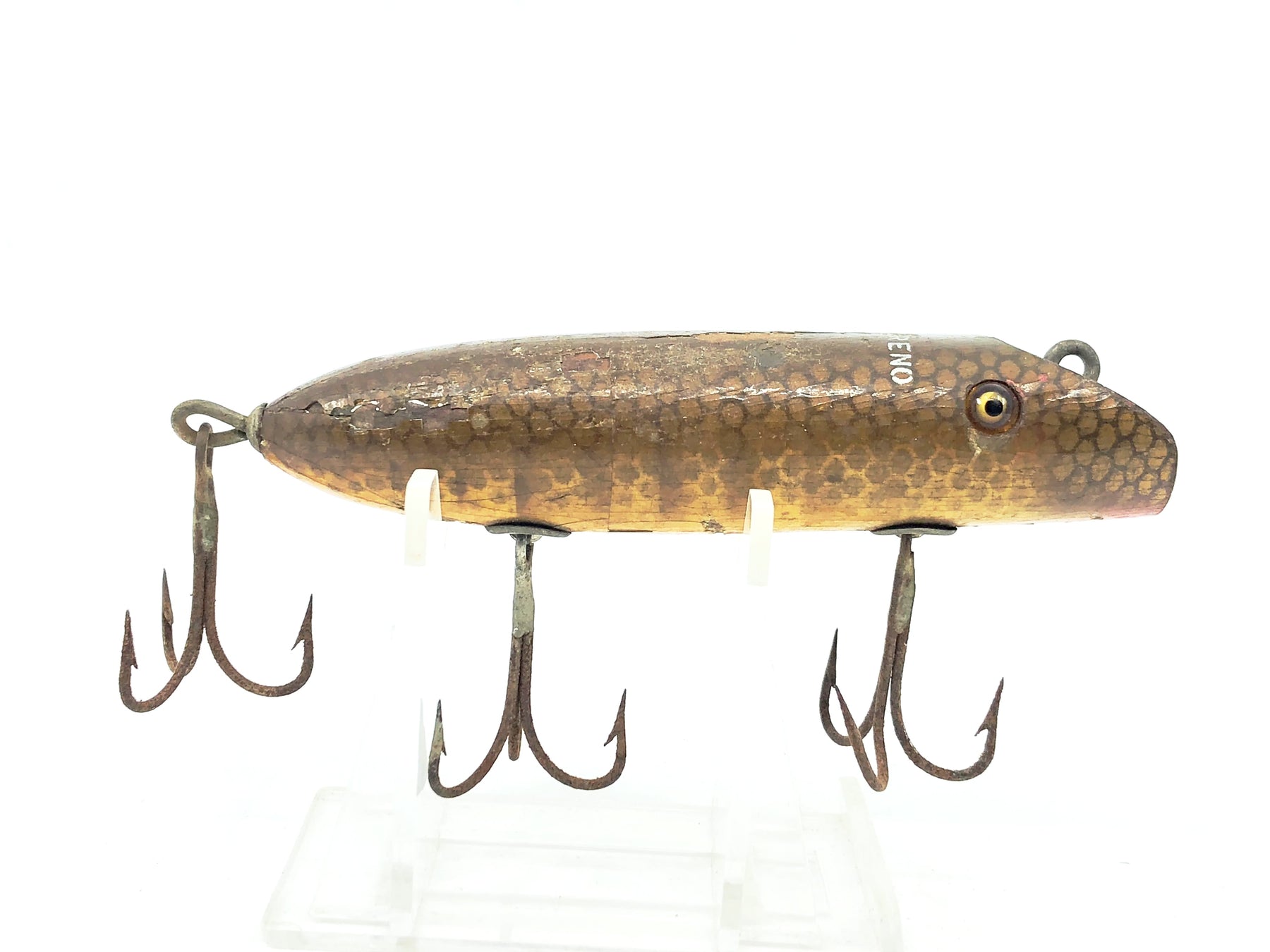 South Bend Bass-Oreno P Pike Scale Color. About 3 3/4" long. Lure is used with some wear but in overall ok condition. One of the greatest fishing lures ever made. Fish or collect you can't go wrong on this one. See photos. Wooden lure, glass eyes.