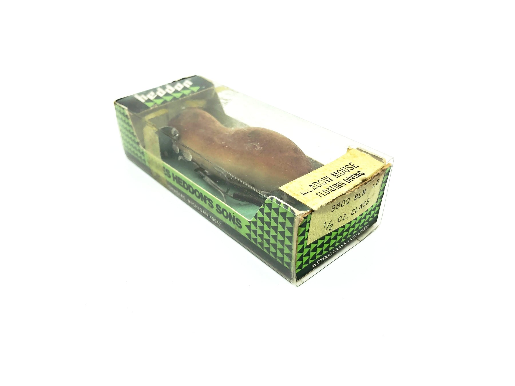 Vintage Heddon Meadow Mouse with Box 9800 BLM.   Brown Mouse color.  Lure body about 2 3/4" long not including the lip or tail.  Used vintage lure with some wear as shown but still overall in good condition.  See photos.  Fish or collect you can't go wrong with a vintage Heddon bait.
