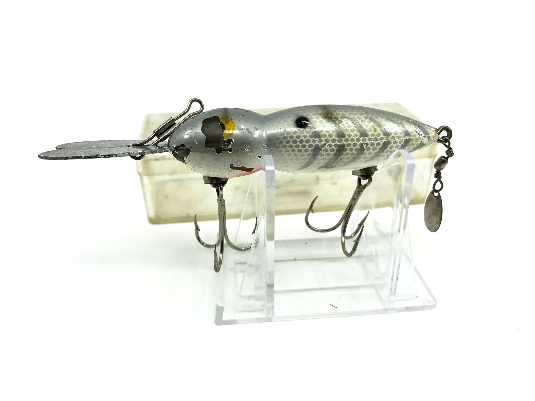 Whopper Stopper Hellbender Silver Shore Scale Color with Box.  About 4 1/4" long including the lip.  Used vintage lure with some wear but overall ok condition.  Box is missing insert and has quite a bit of wear.  These lures are collectible and highly sought after by fisherman.  Killer on bass!  Fish or collect this vintage classic bait.  See photos.