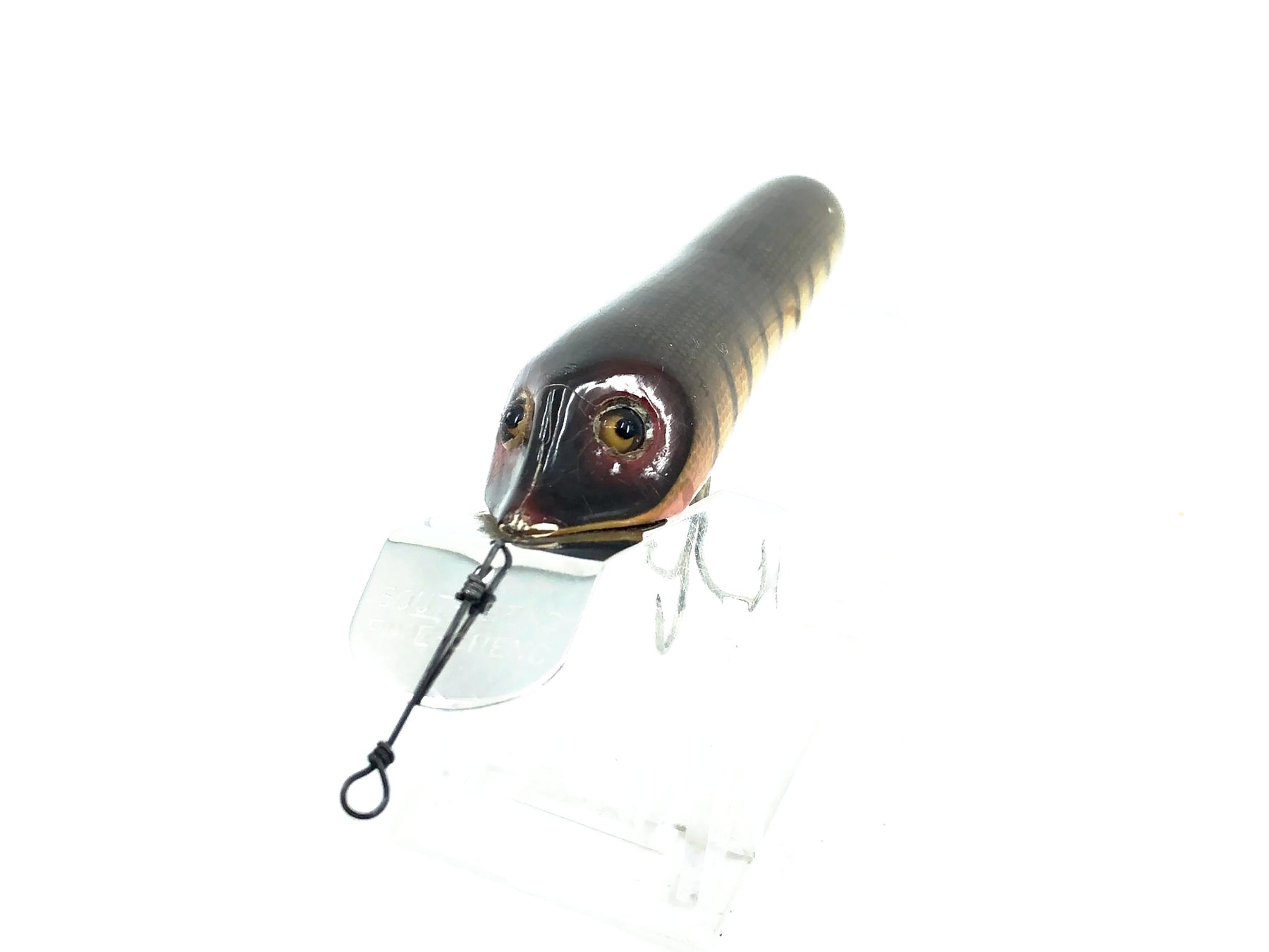 South Bend Baby Pike-Oreno 956, Pike Color. Earlier glass eyed version. Lure is used with some minor wear and a few marks but still in good condition. About 3 1/4" wood body. See photos and add to your collection.