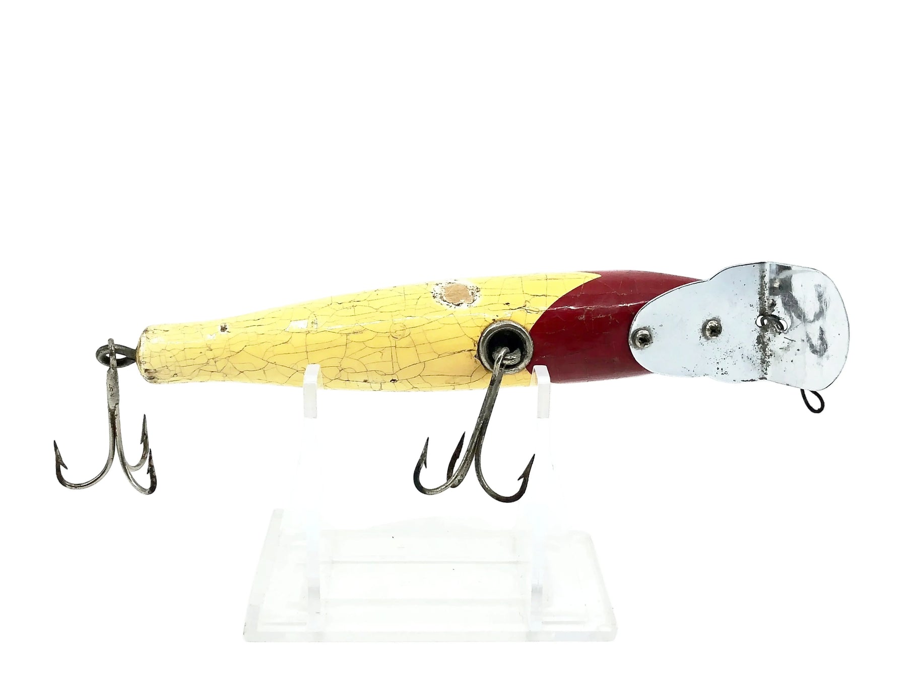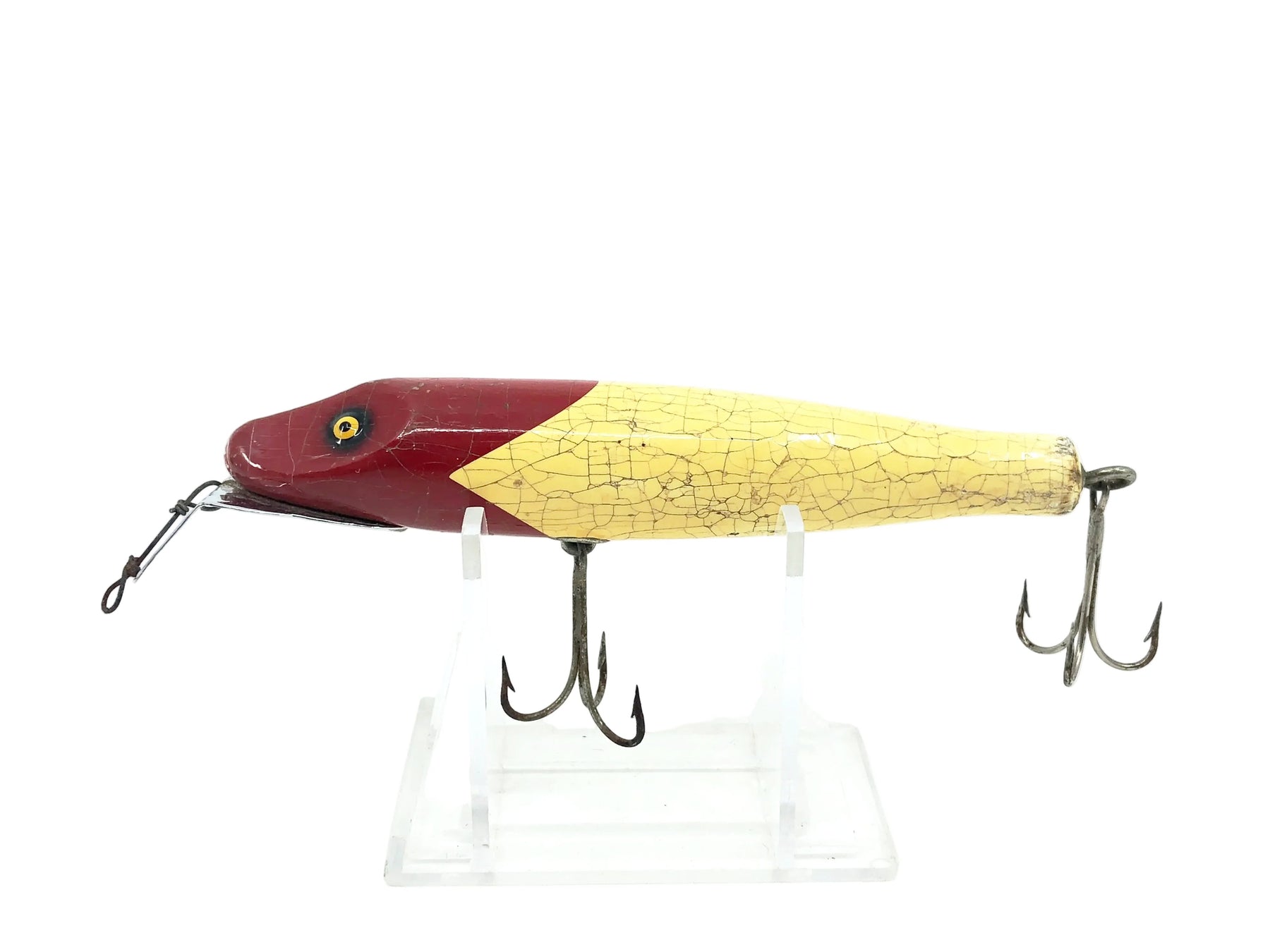 South Bend Pike-Oreno 957, RH Red Head/White Color. Earlier tack eyed version. Lure is used with some wear and cracks as shown but still in fair shape. About 4 1/2" wood body. See photos and add to your collection.