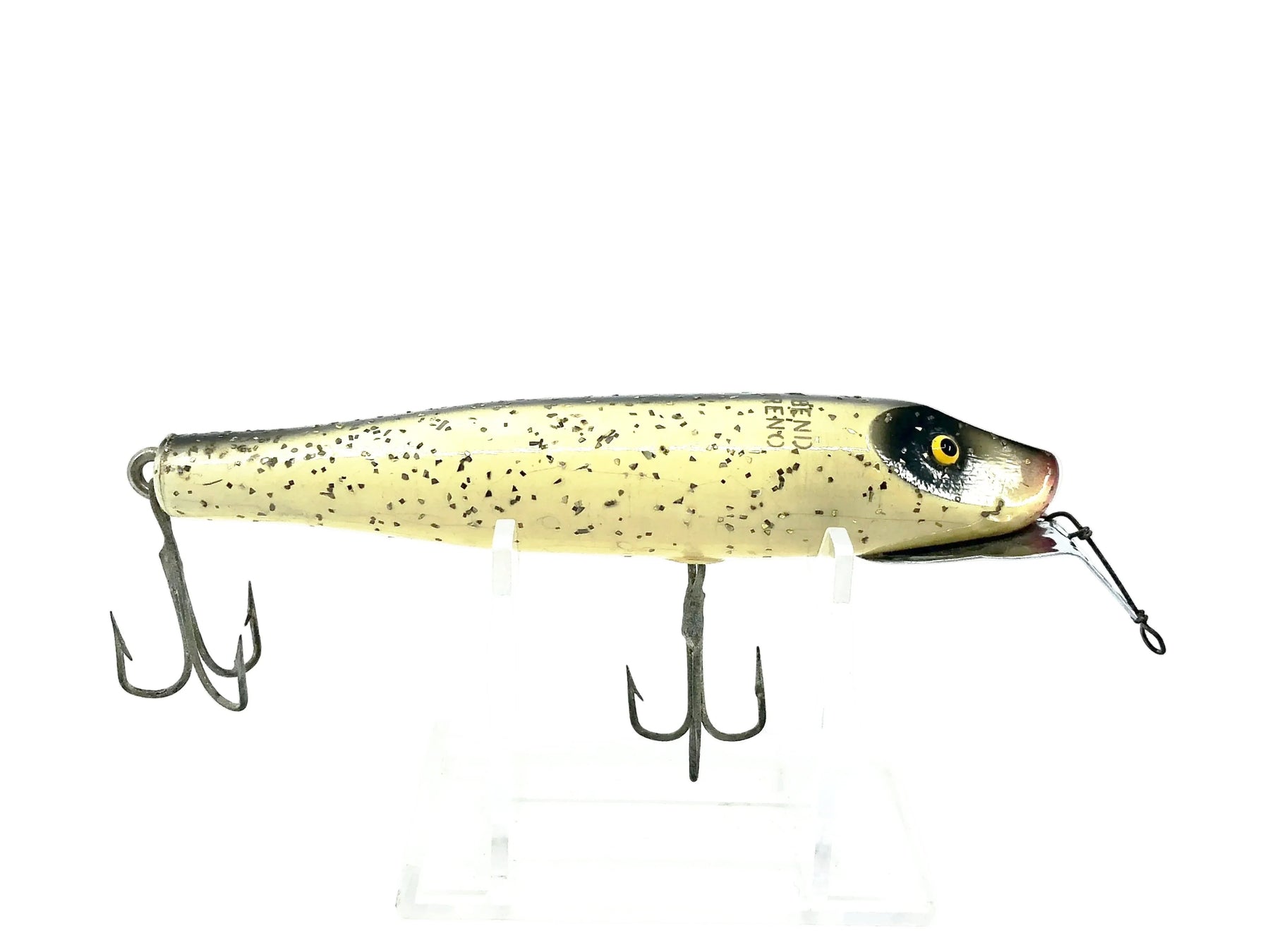 South Bend Pike-Oreno 957, SF Silver Flitter Color. Earlier tack eyed version. Lure is used with some minor wear and cracks as shown but still in good shape. About 4 1/4" wood body. See photos and add to your collection.