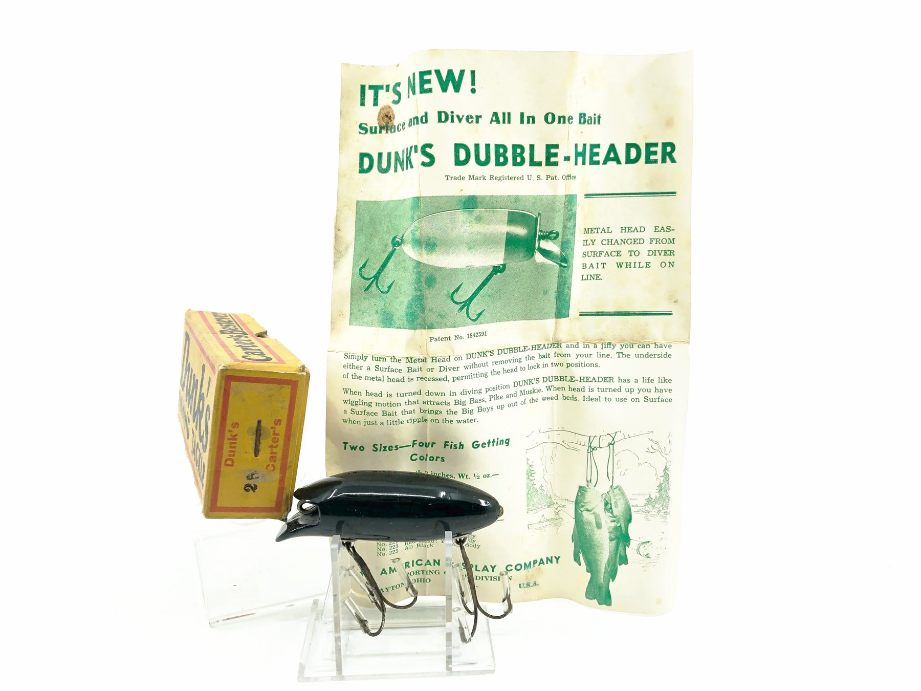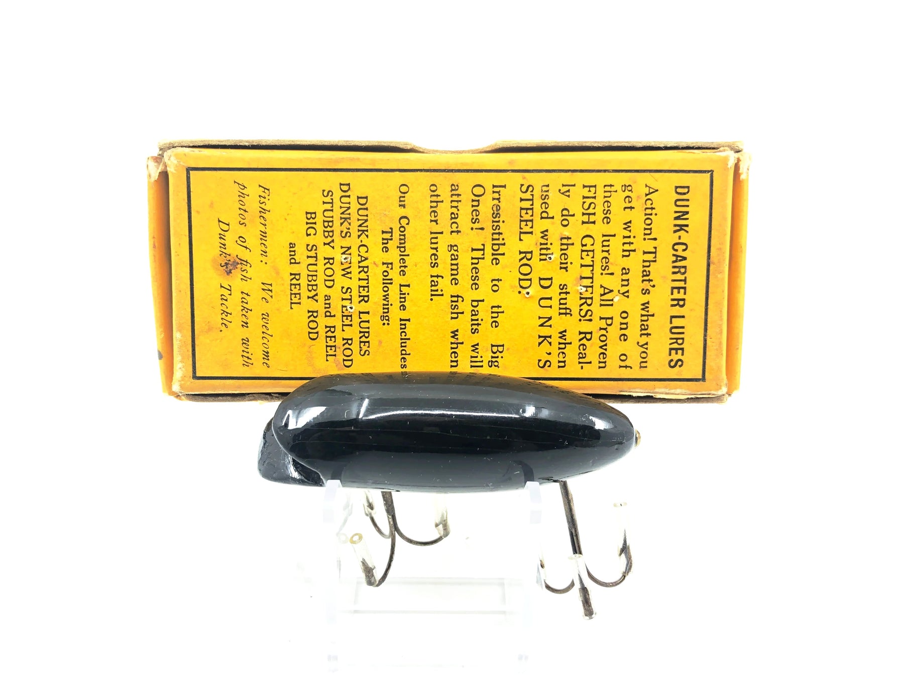 Dunk's Carter's Bestever Black Color w/Box & Paperwork. Very hard to find box and paperwork, almost as rare as the lure. Lure is about 3" long. This lure is in great condition with only some minor wear. Box has some minor wear as well but is in good condition. Still a nice vintage lure to fish or display.