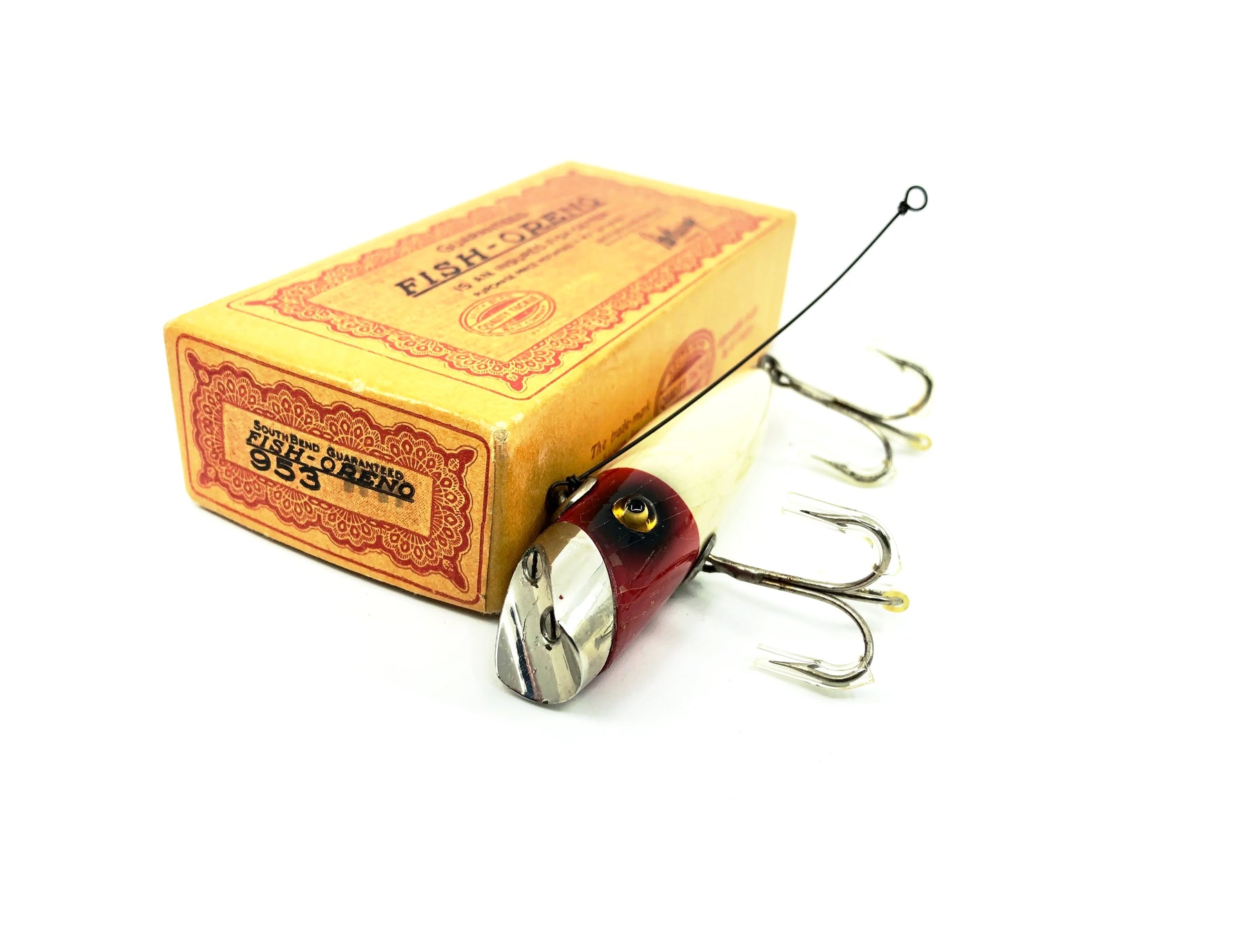 South Bend Fish-Oreno, RH Red Head White Color, GE w/Box. Older version of this lure and box. About 3 3/8" long.  Made by South Bend from 1926-1952.  Everything from the metal from to the paint is in great condition, with just a little storage wear. Matching box is in great condition as well.  Bottom of box has four pin holes in it from display  Overall really nice combo. See photos.  Would be great for fishing or add to that vintage display.