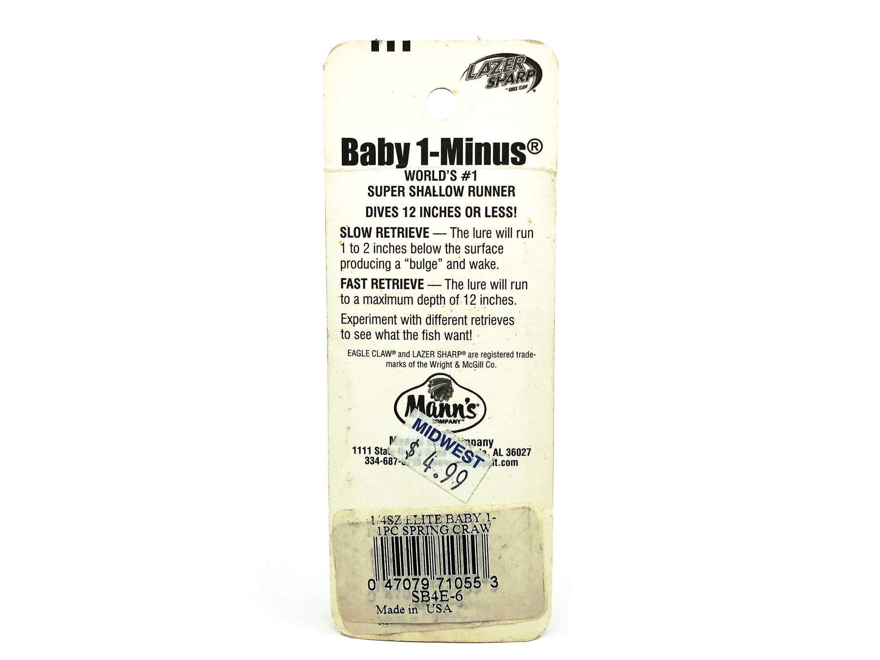 Mann's Elite Baby 1- Minus, Spring Craw Color on Card. These lures are insanely desirable ever since Mann's closed their doors. Bait has about 2 1/4" long body and weighs 1/4oz. Bait is new on card. Card is in good condition. See photos.