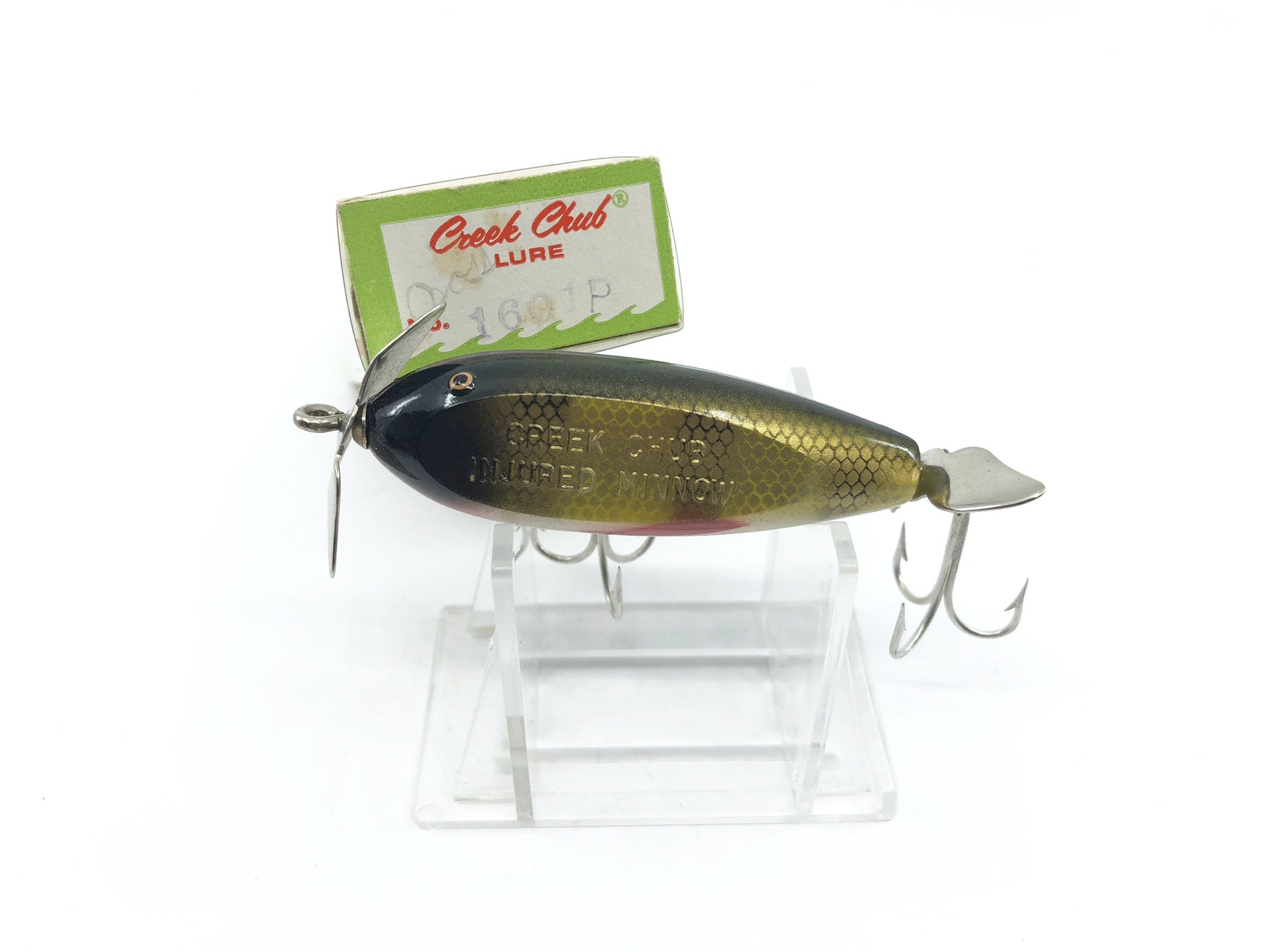 Creek Chub Baby Injured Minnow in Perch Color with Box. Great vintage Creek Chub lure here. Correct box. Box has some wear but lure is great, see photos. One of the all-time classic fishing lures.