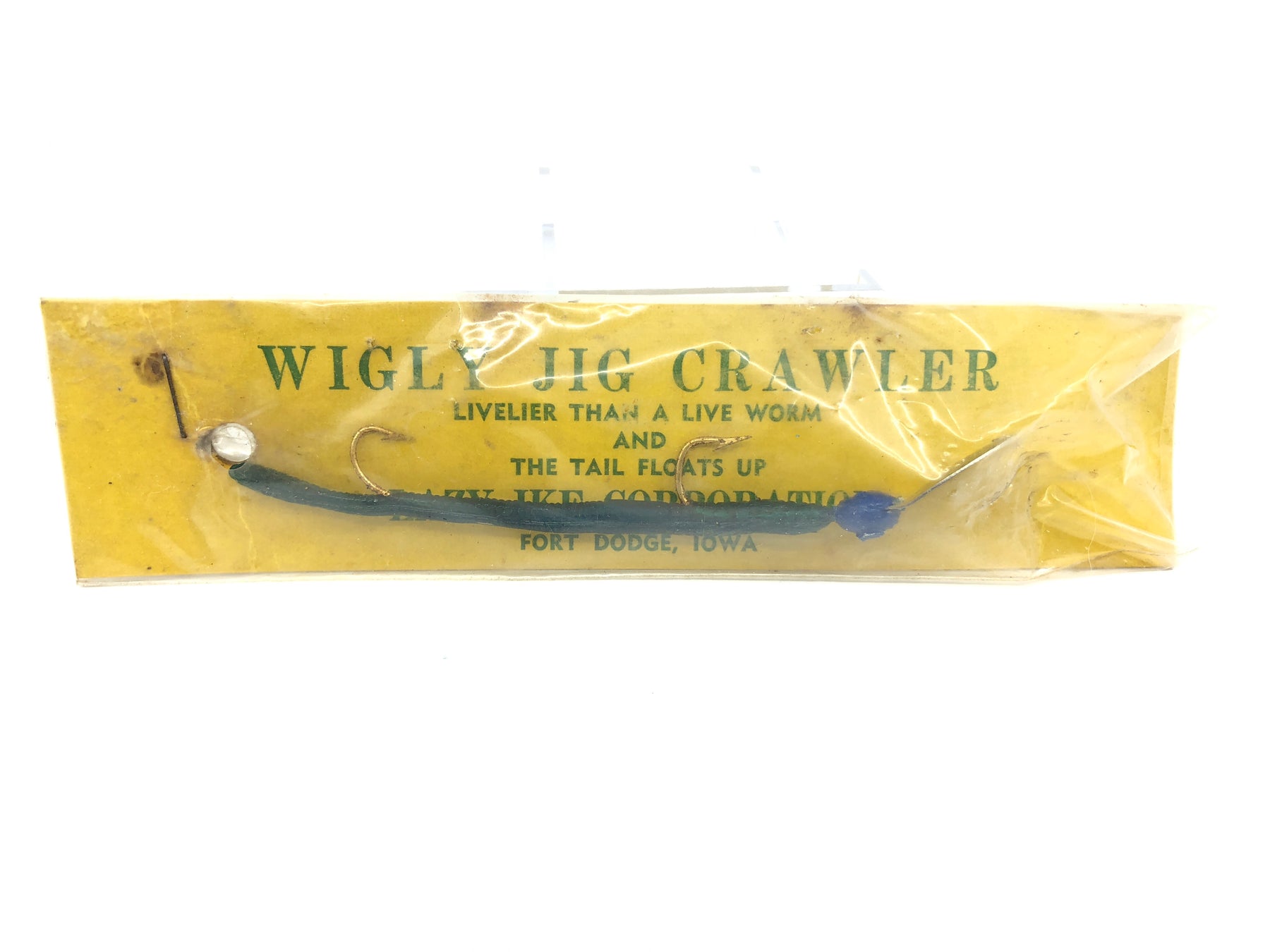 Lazy Ike Wigly Crawler Blue Color New on Card Old Stock. About 4 1/2" long crawler and jig head. These are so TOUGH to find. Collectors want them, fisherman still want them. Card unopened. Would look great in your collection, almost never see these. Grab this one while you can.