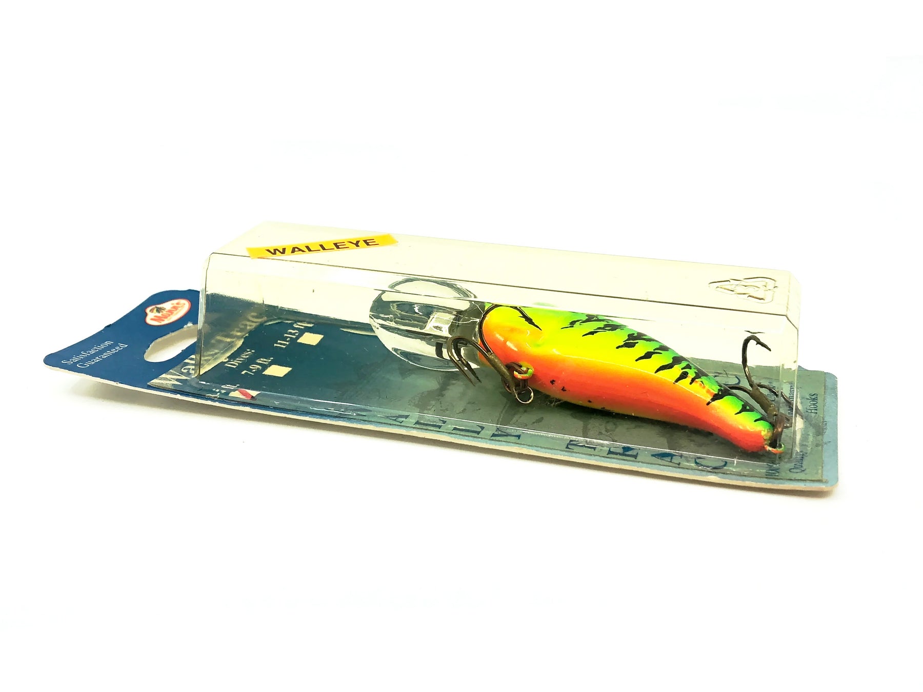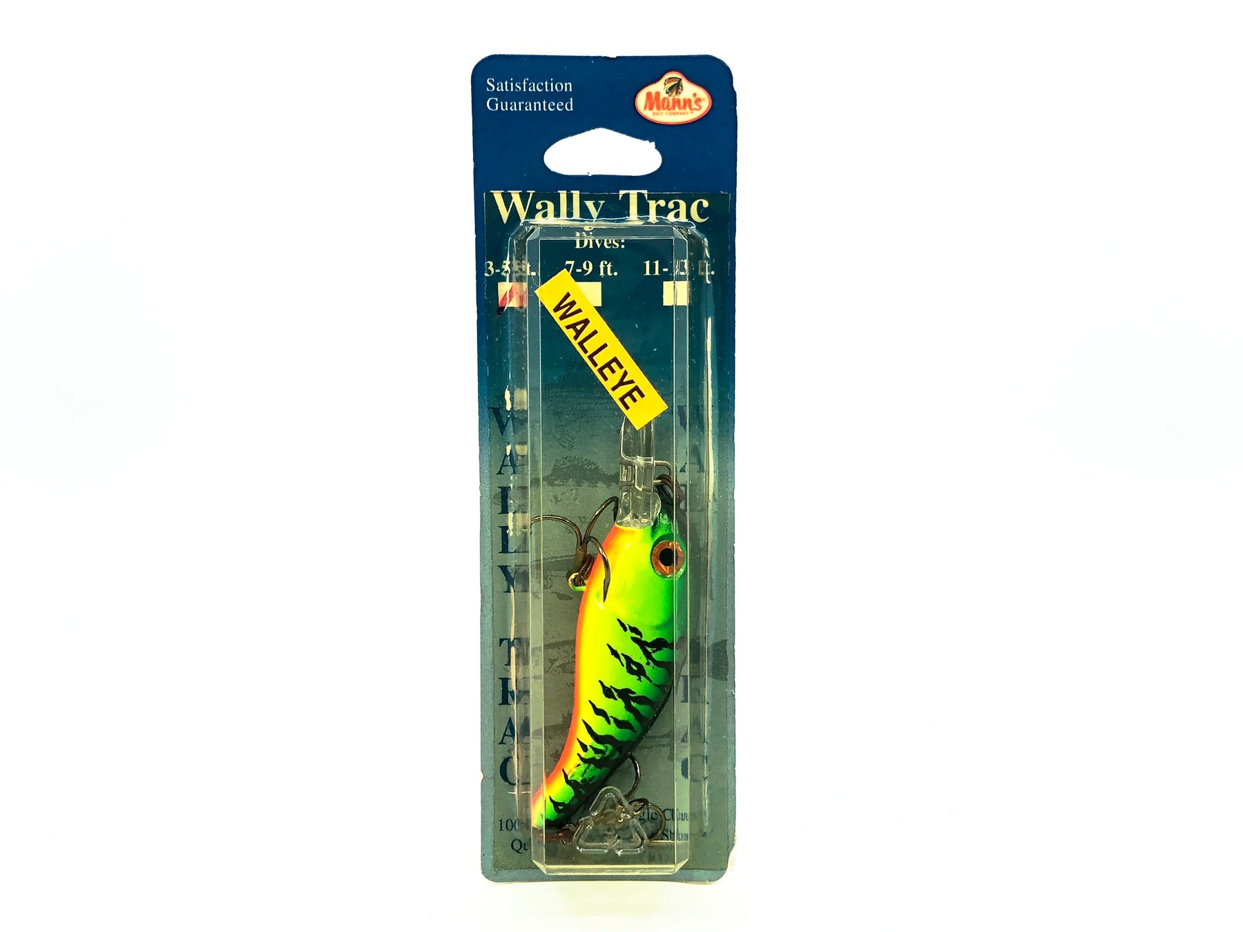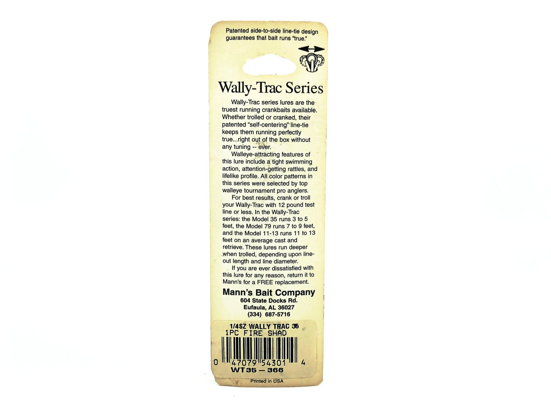 Mann's Wally Trac, Fire Shad Color on Card. Uncommon Mann's bait! Bait has about 2 1/2" long body. Bait is new on card, card has some minor wear and uv staining but in overall good condition. See photos.